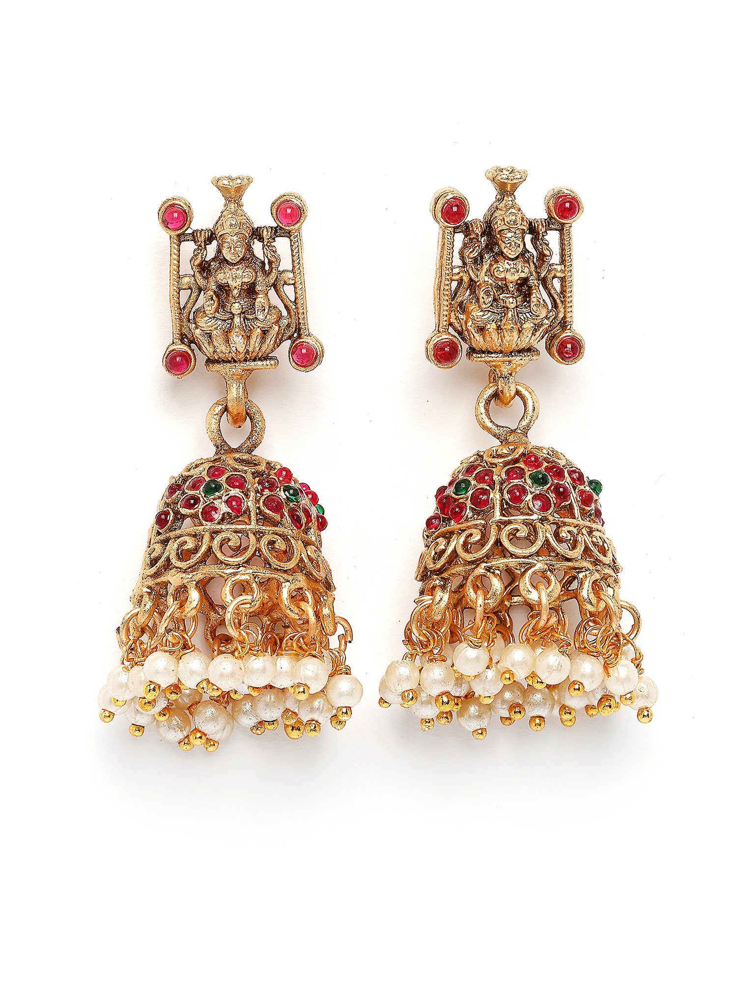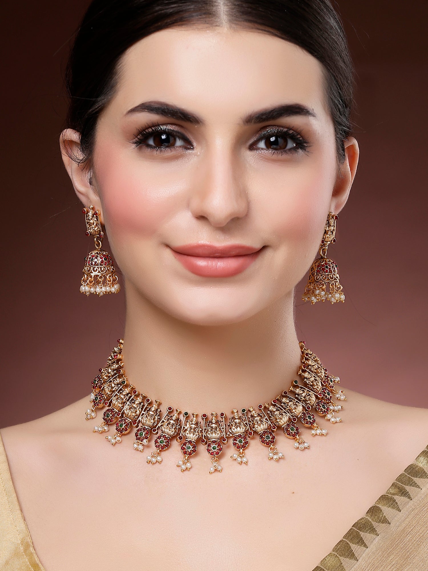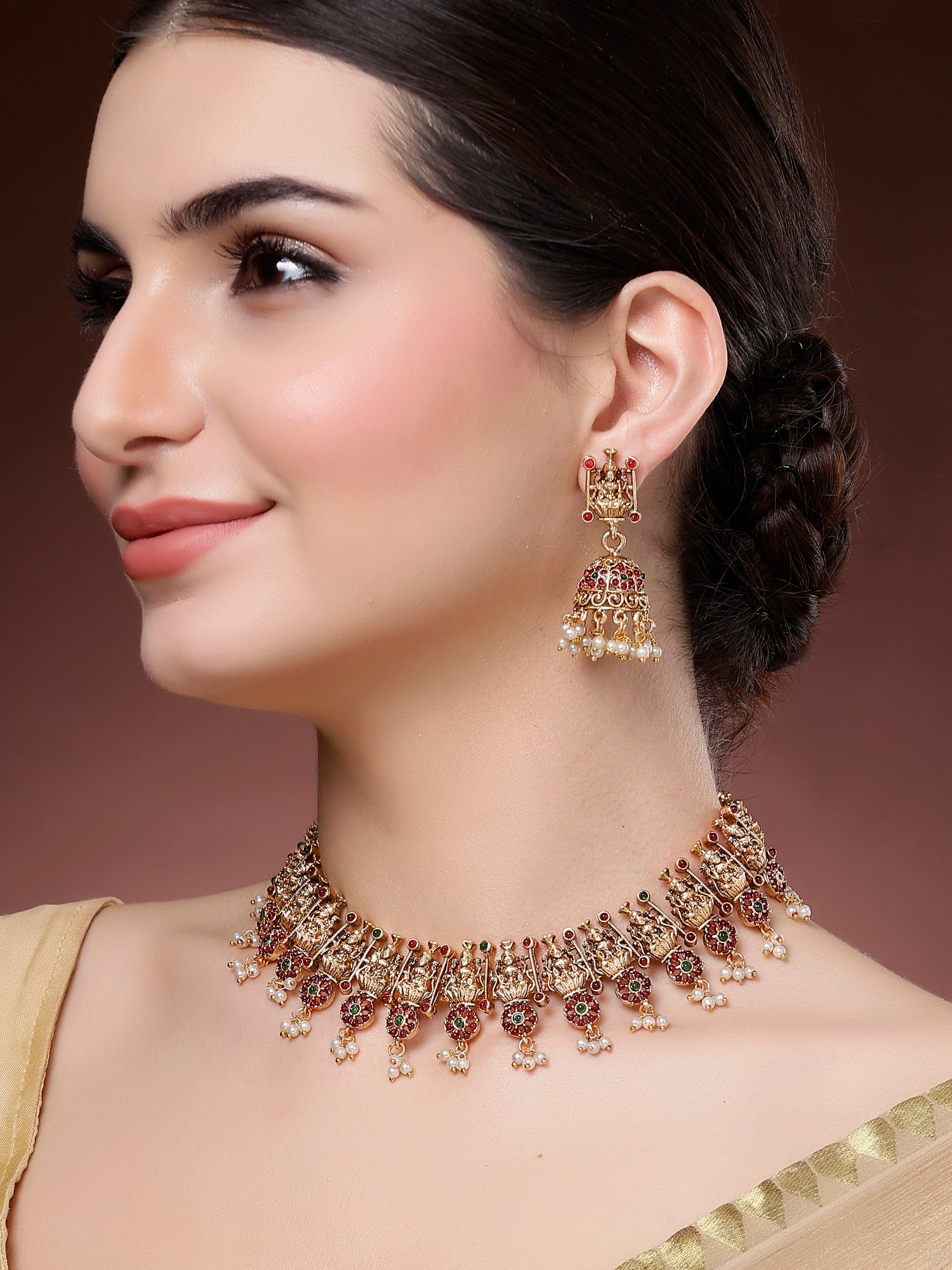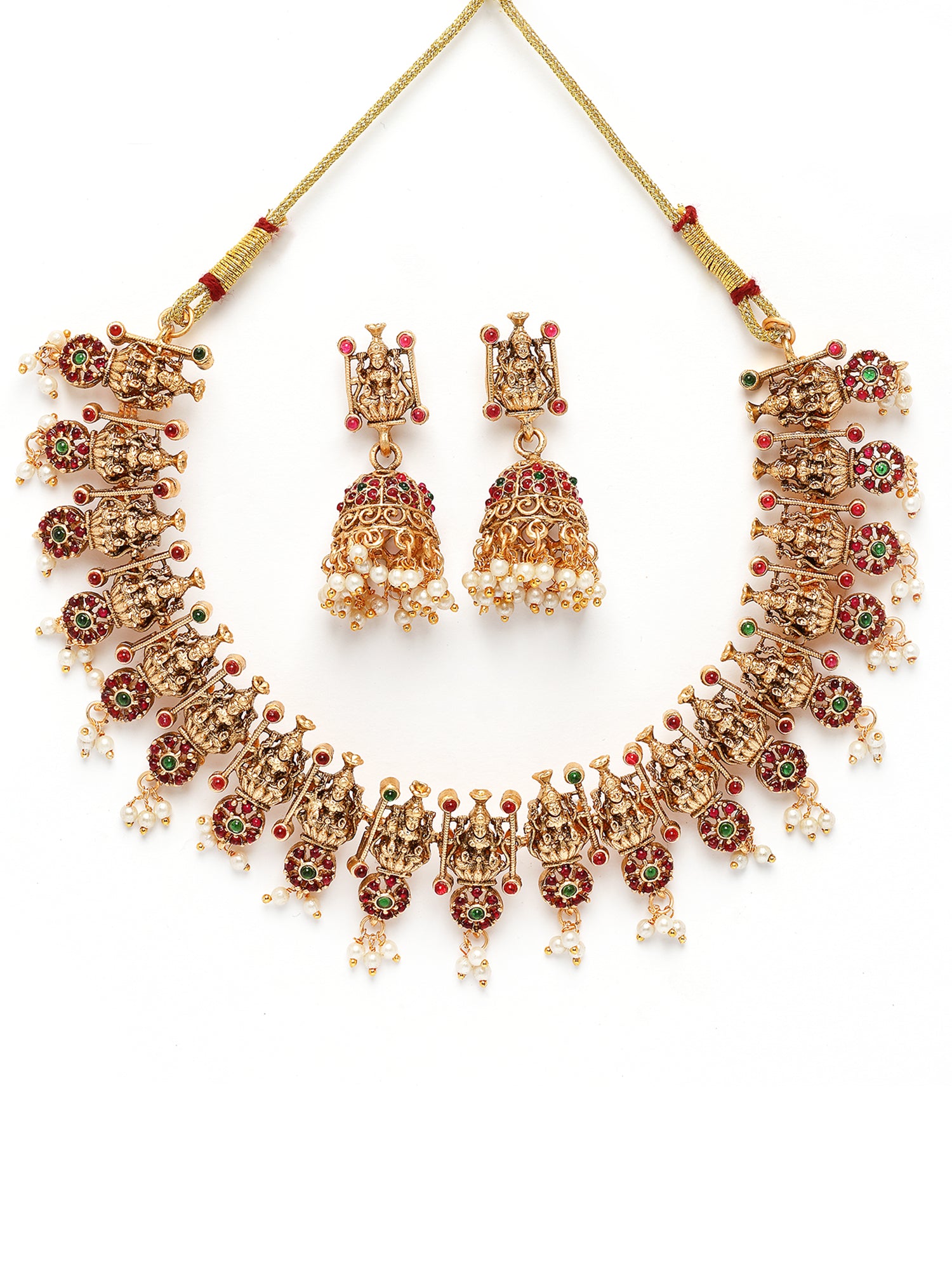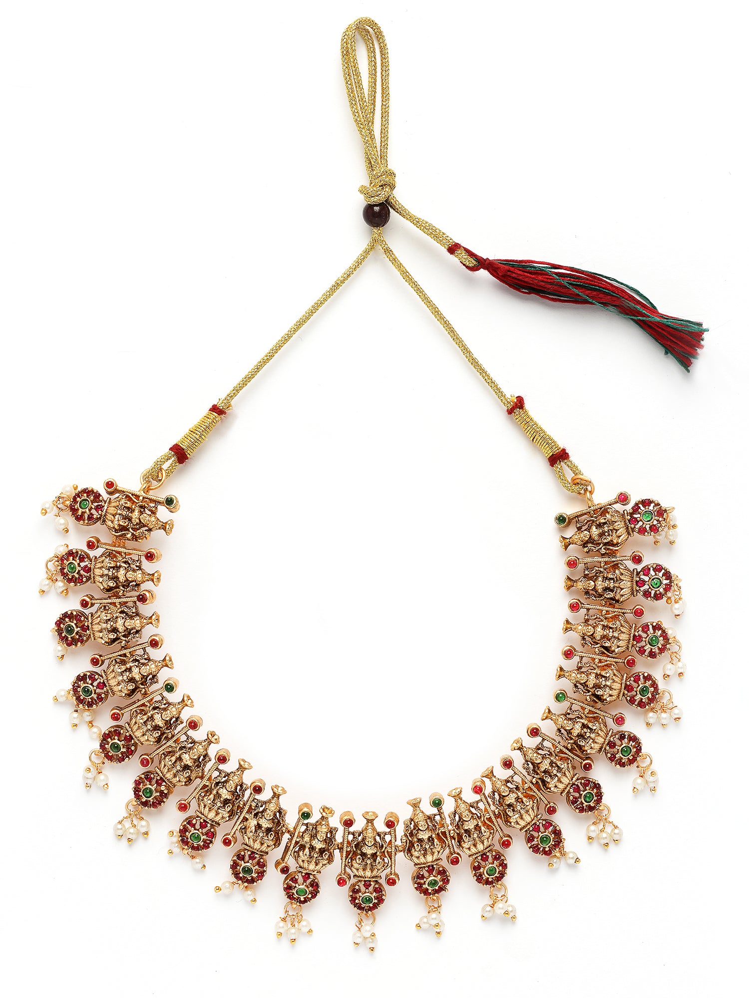 Karatcart Red and Green Stone Laxmi Mata and Floral Temple Jewellery Set for Women