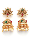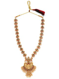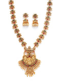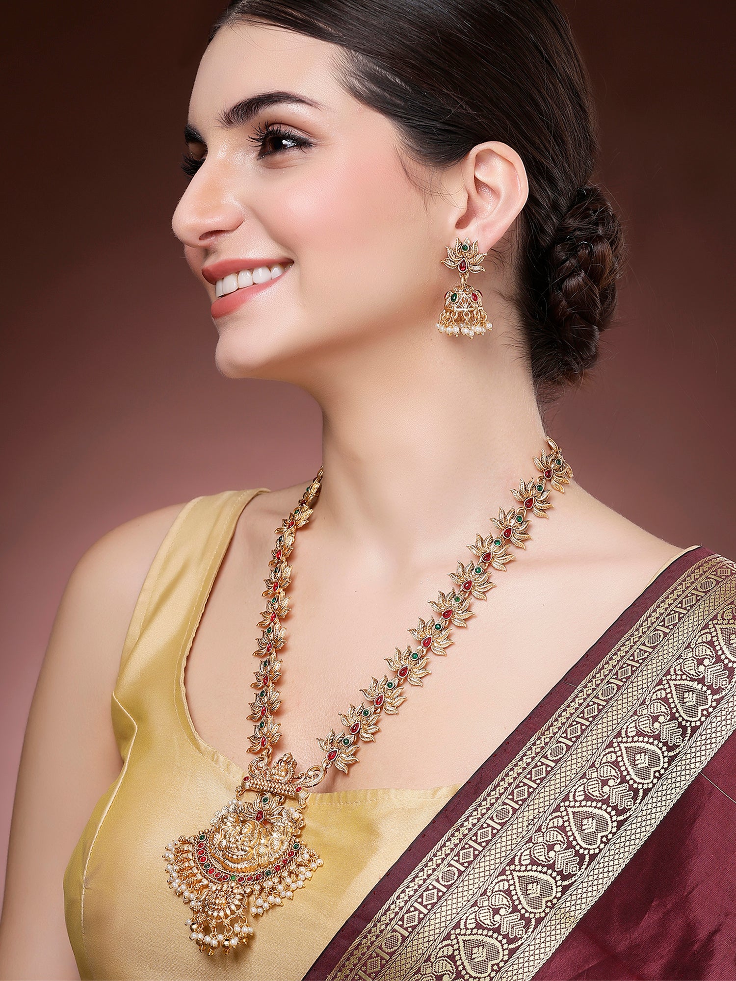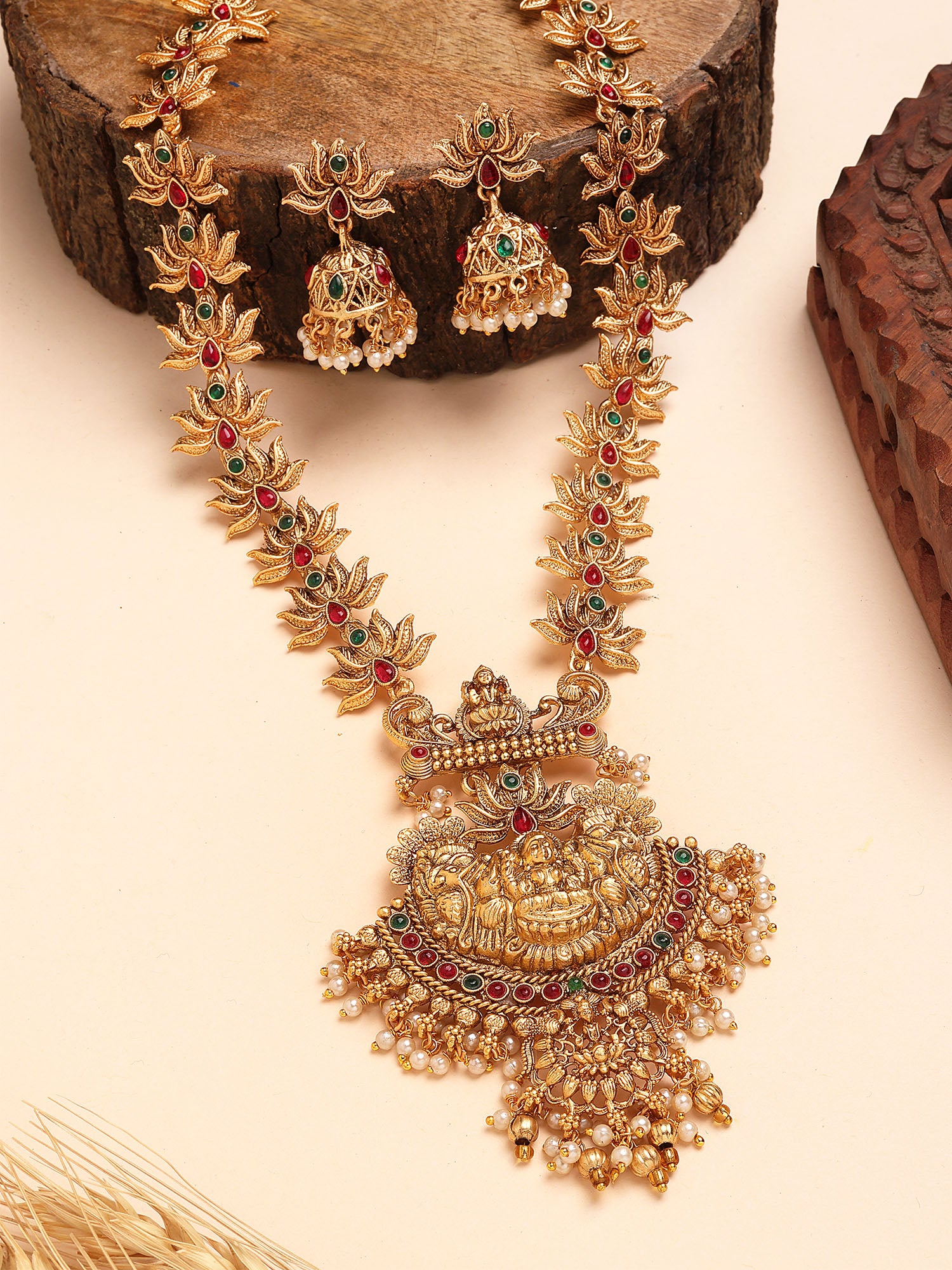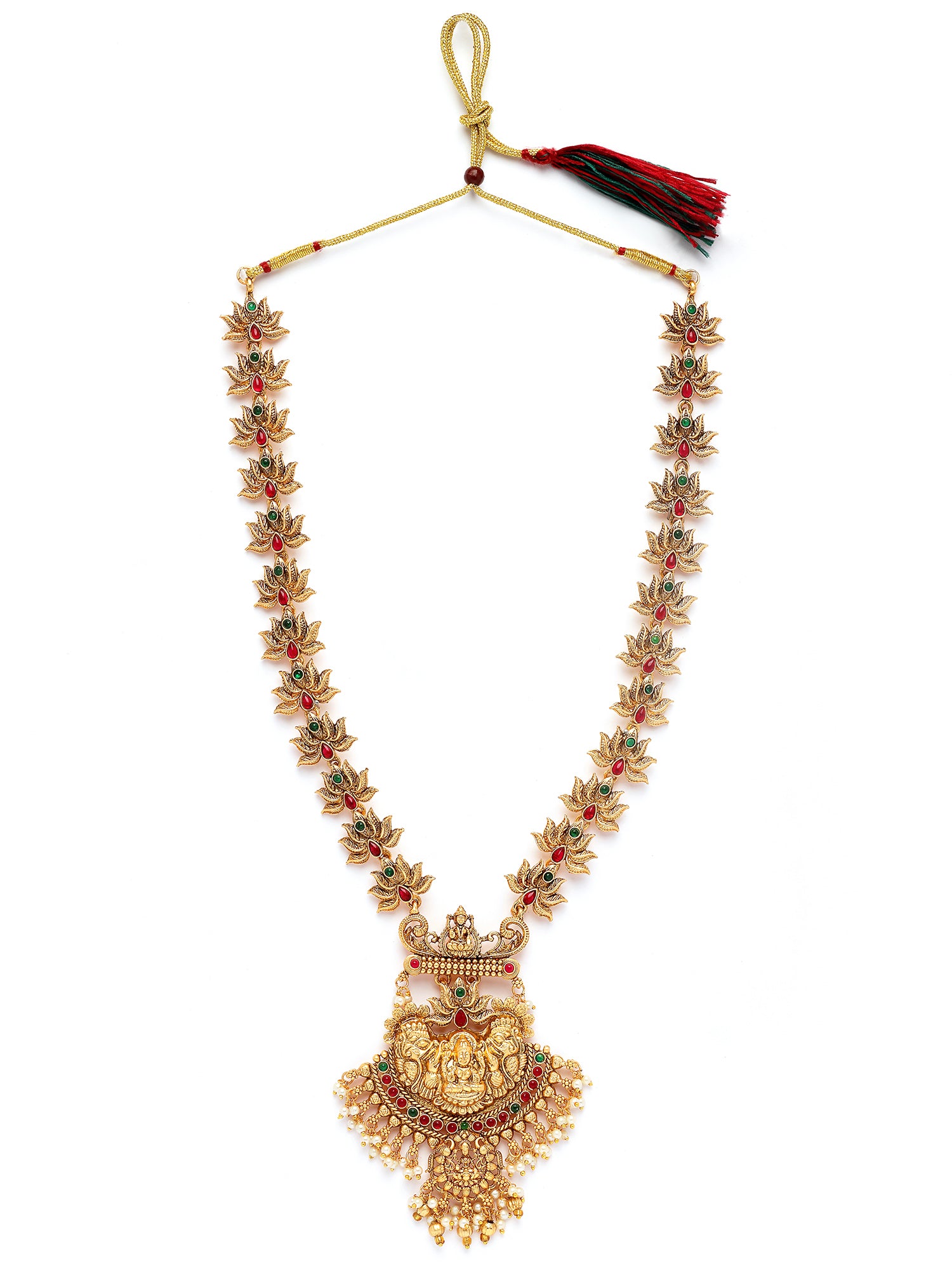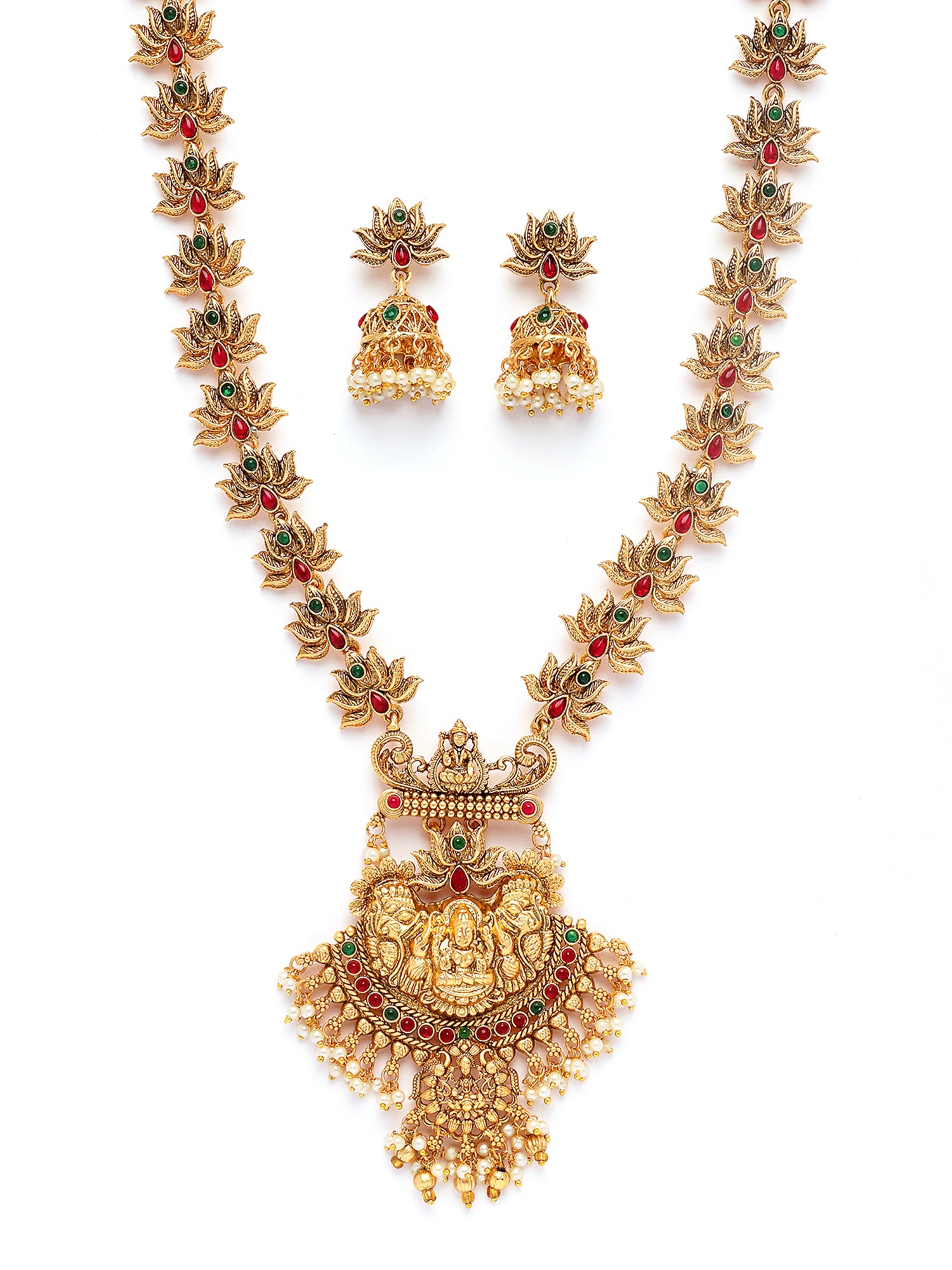 Karatcart Gold Plated Laxmi Mata Engraved Lotus Design Long Temple Jewellery Set for Women
