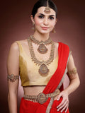 - Dimensions: 1st Necklace Length: 27 cm, Width: 10 cm; 2nd Necklace Length: 64 cm, Width: 10 cm; Earrings Length: 5 cm, Width: 2.5 cm; Maangtikka Length: 13.5 cm, Width: 4 cm; Kamarbandh Length: 30 cm, Width: 7 cm, Chain Length: 68 cm; Bajubandh Length: 9 cm, Width: 4.8 cm, Chain Length: 17 cm; Choti Brooch Length: 4.5 cm, Width: 4 cm