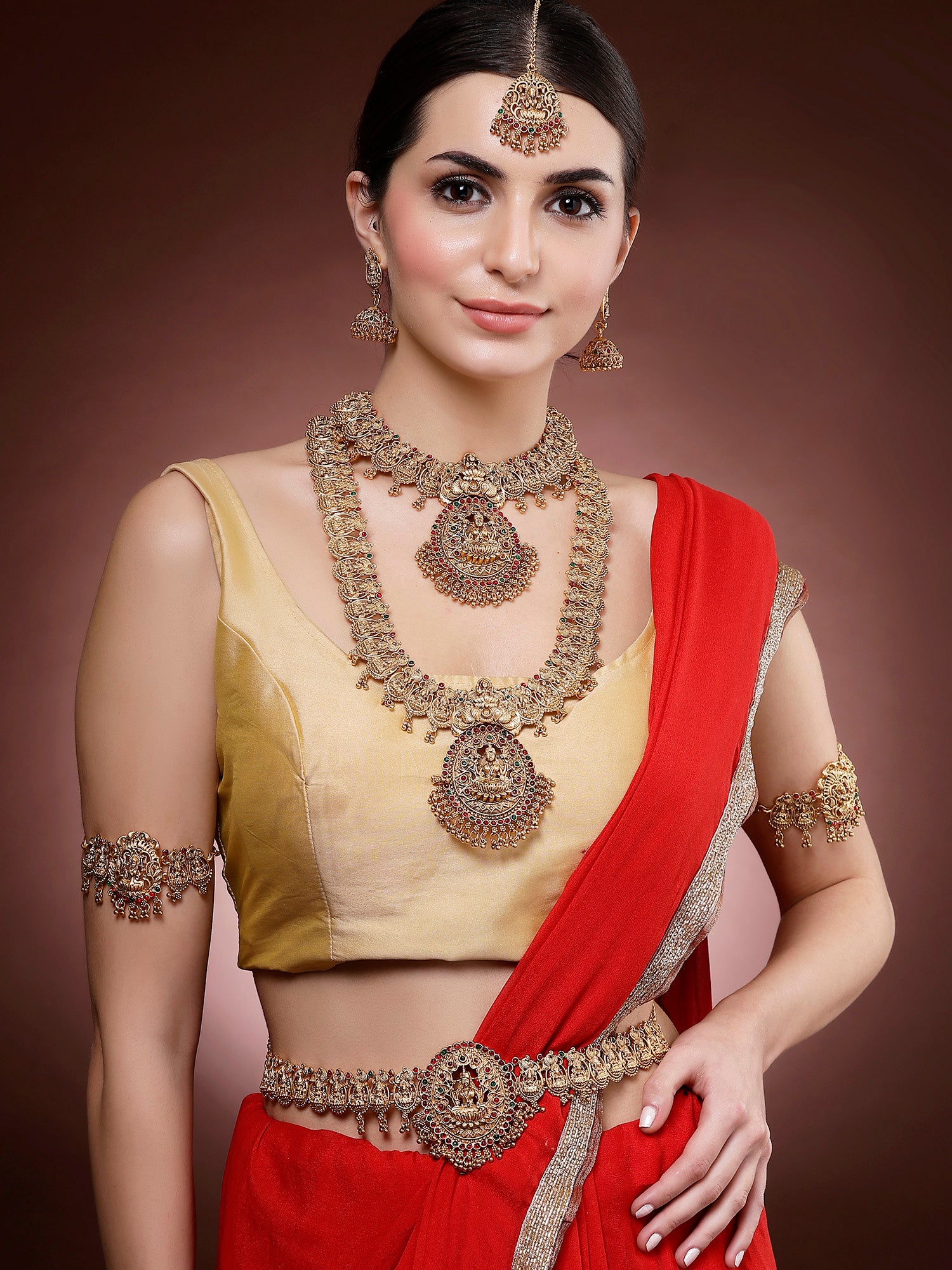 - What’s Included: 2 Necklace, 1 Pair of Earrings, 1 Maangtikka, 1 Kamarbandh, 2 Bajubandh and 9 Hair Pins