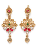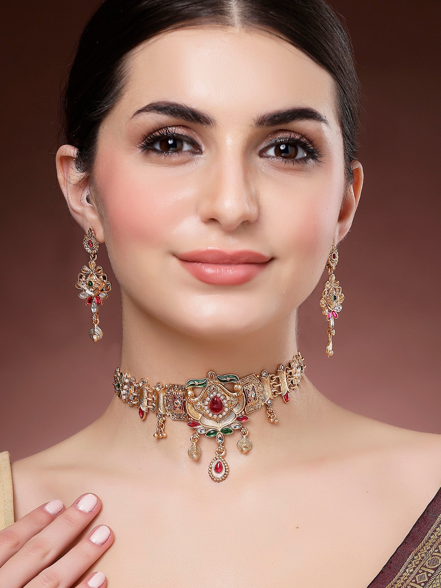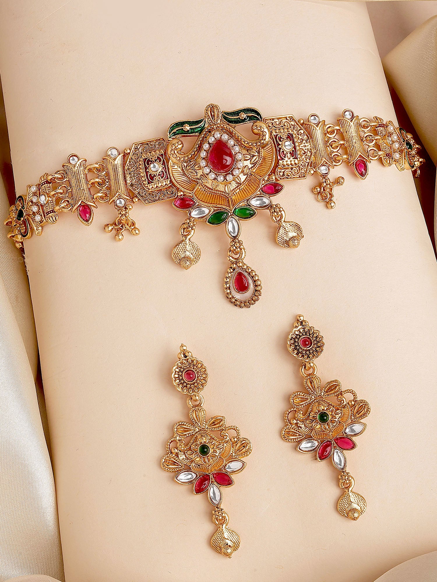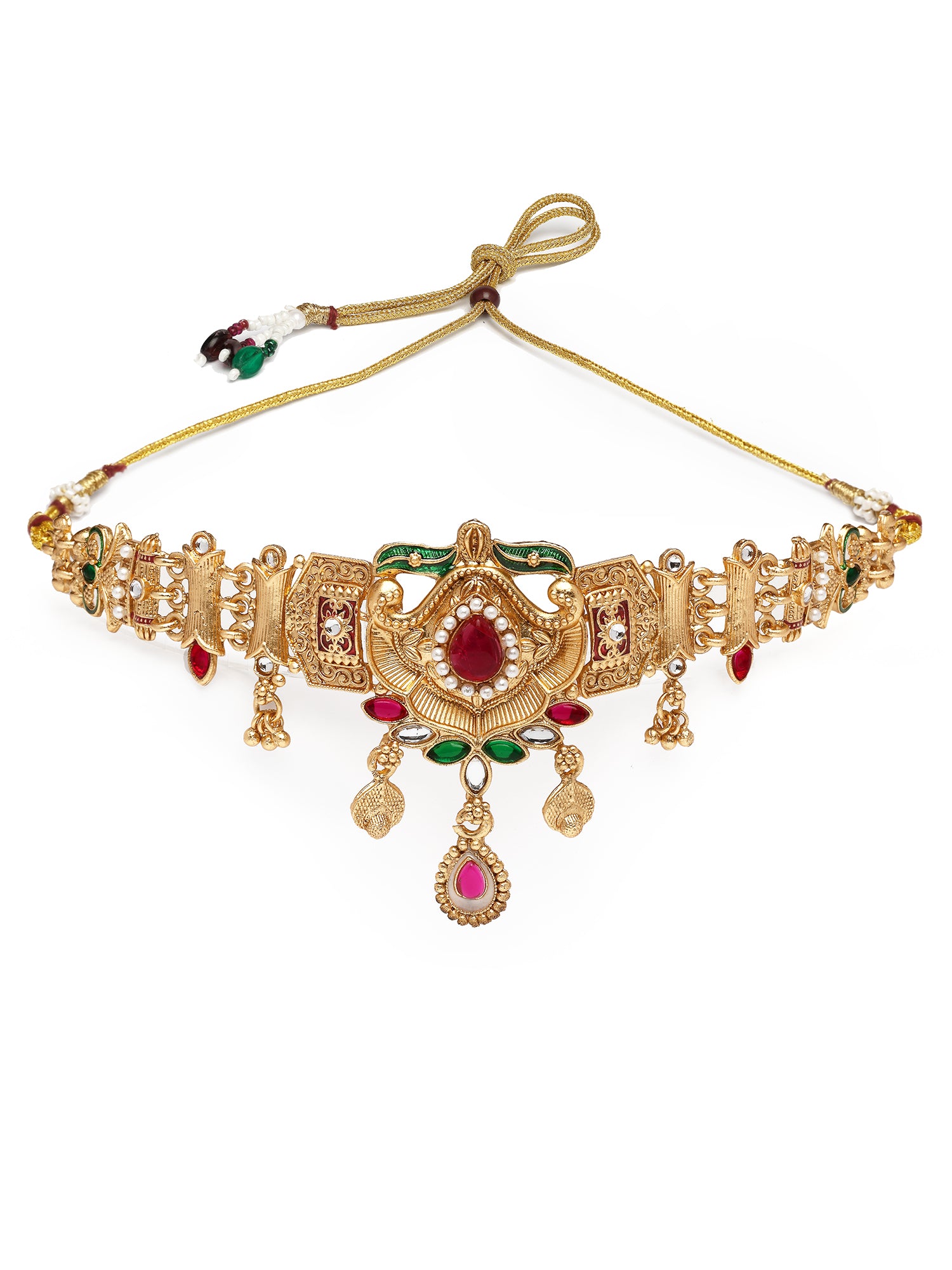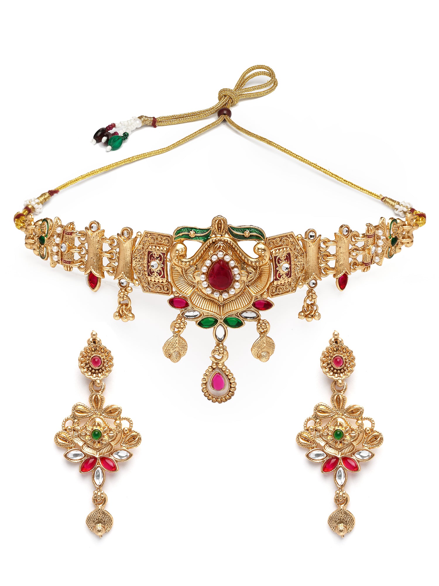 Karatcart Gold Plated Traditional Choker Necklace Set with Red and Green Stones