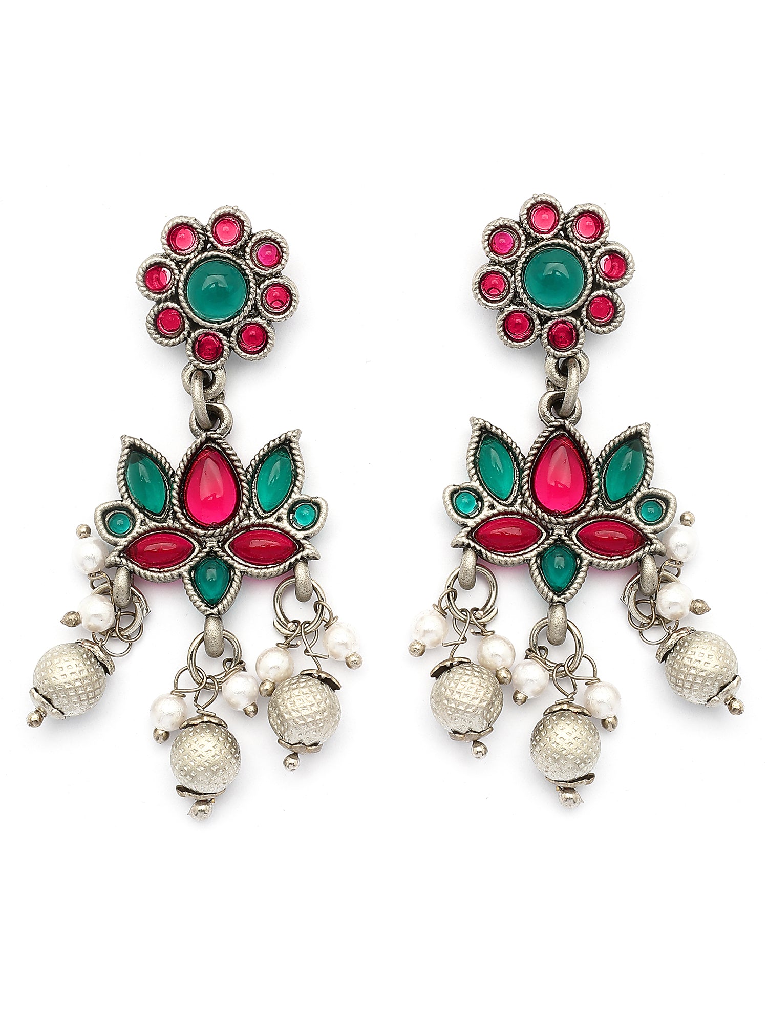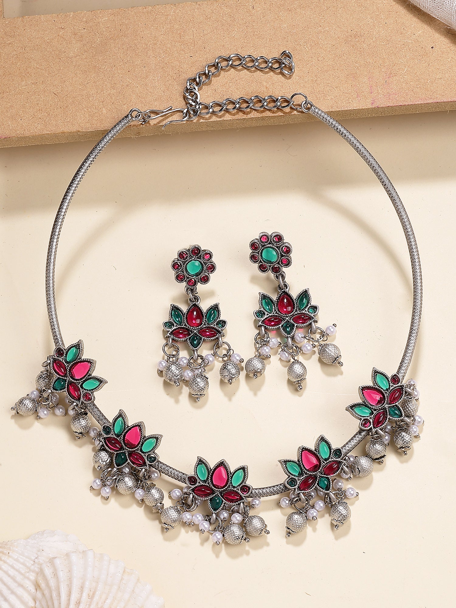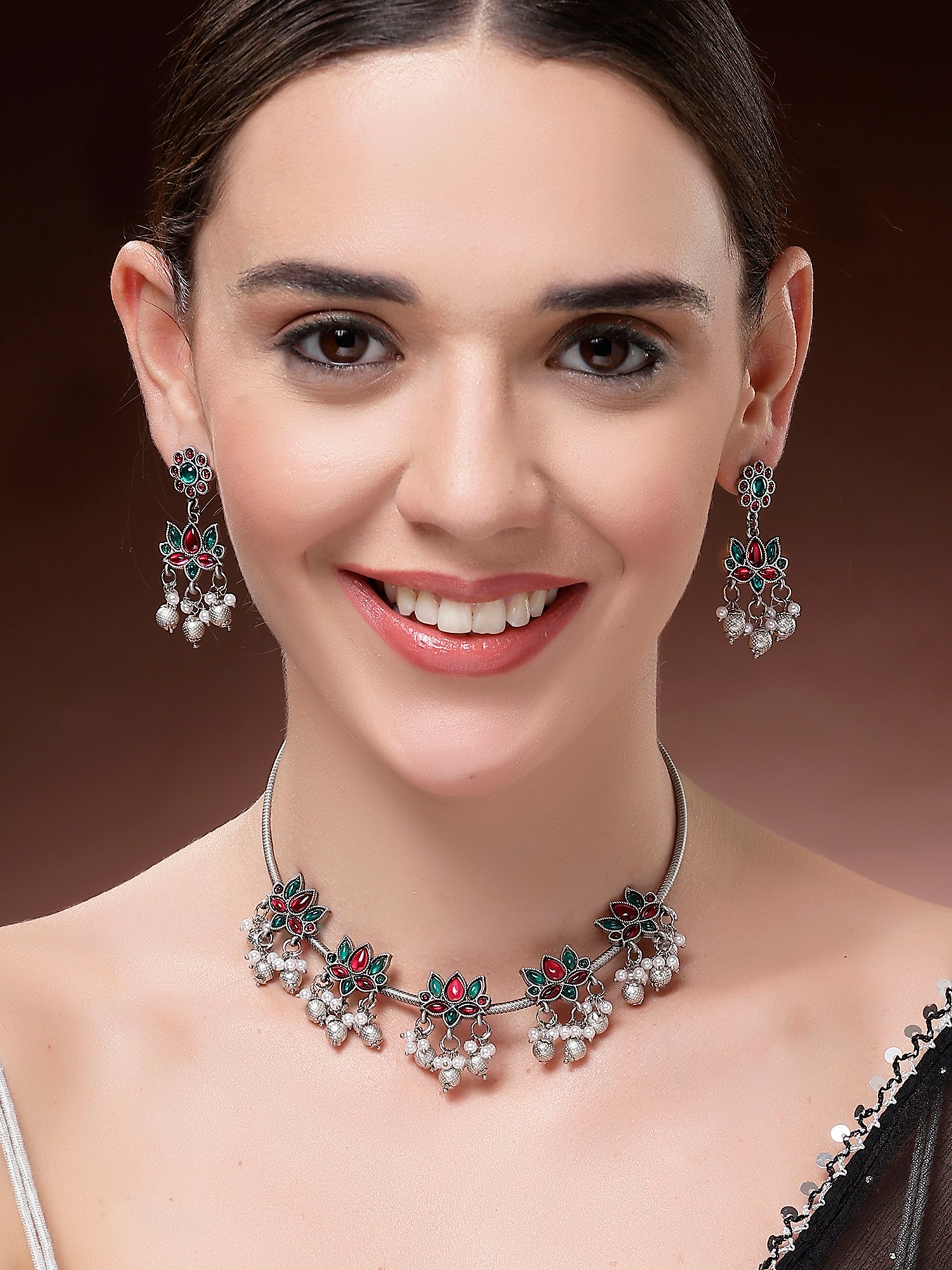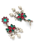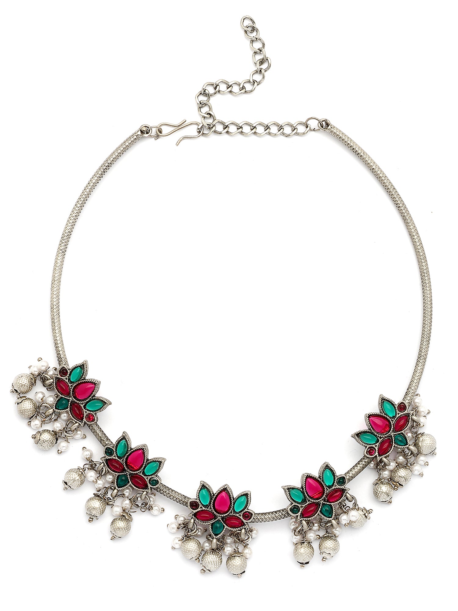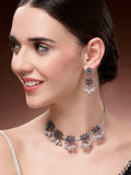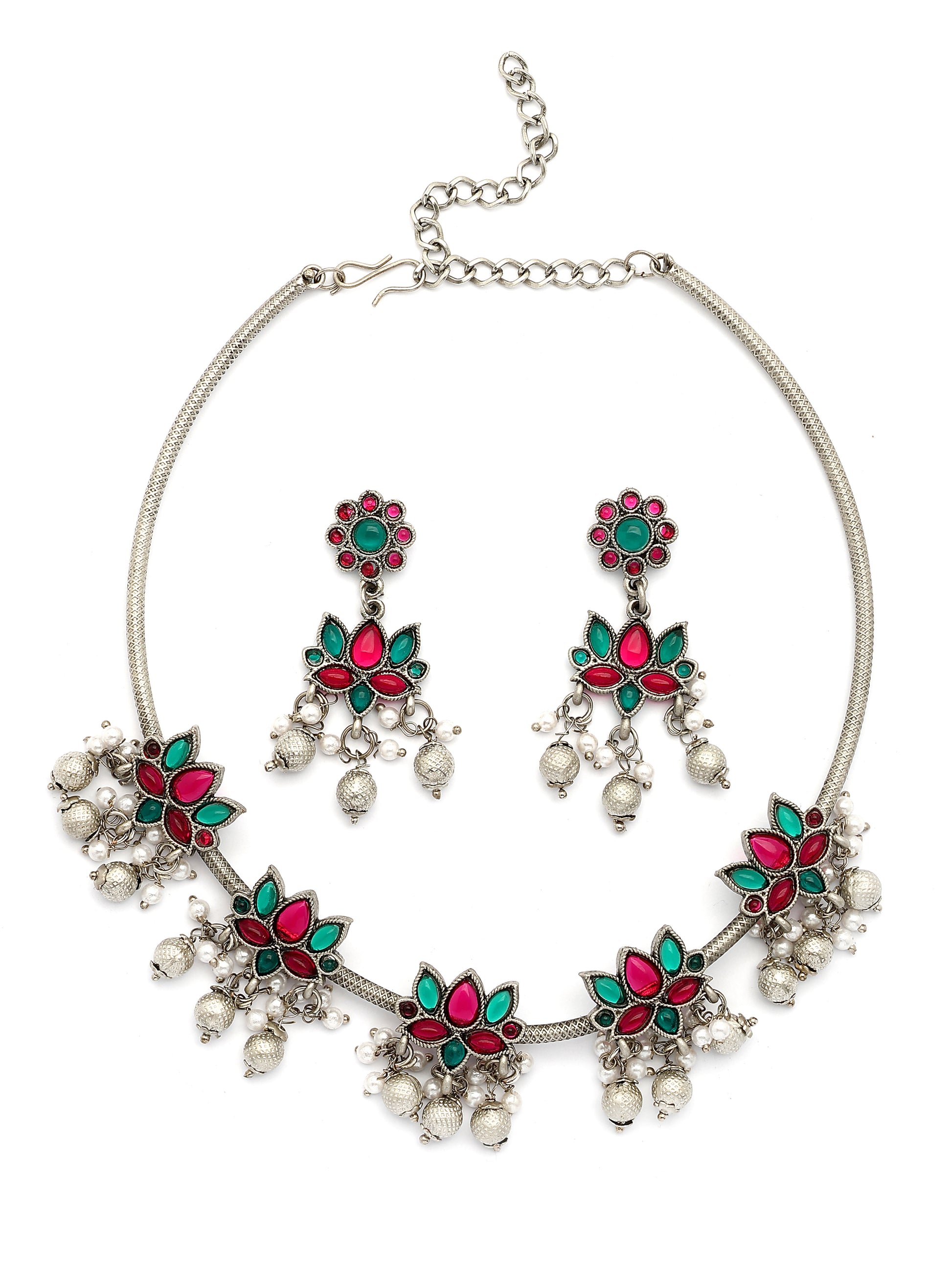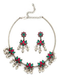 Karatcart Oxidised Silver Plated Red and Green Stone Hasli Necklace Set for Women