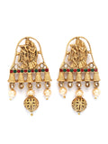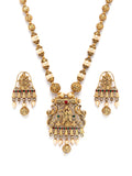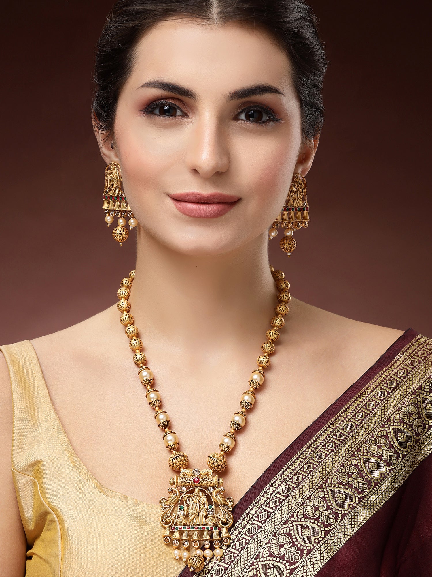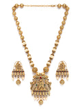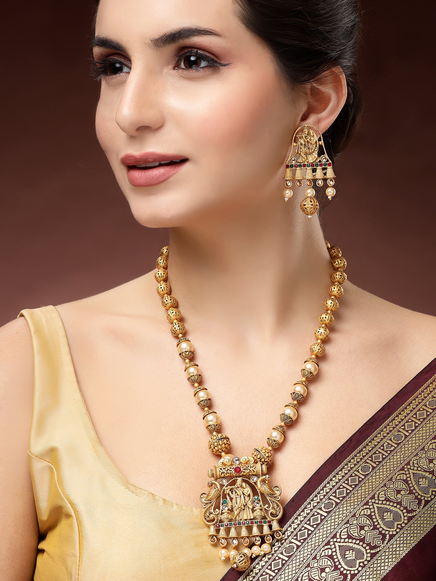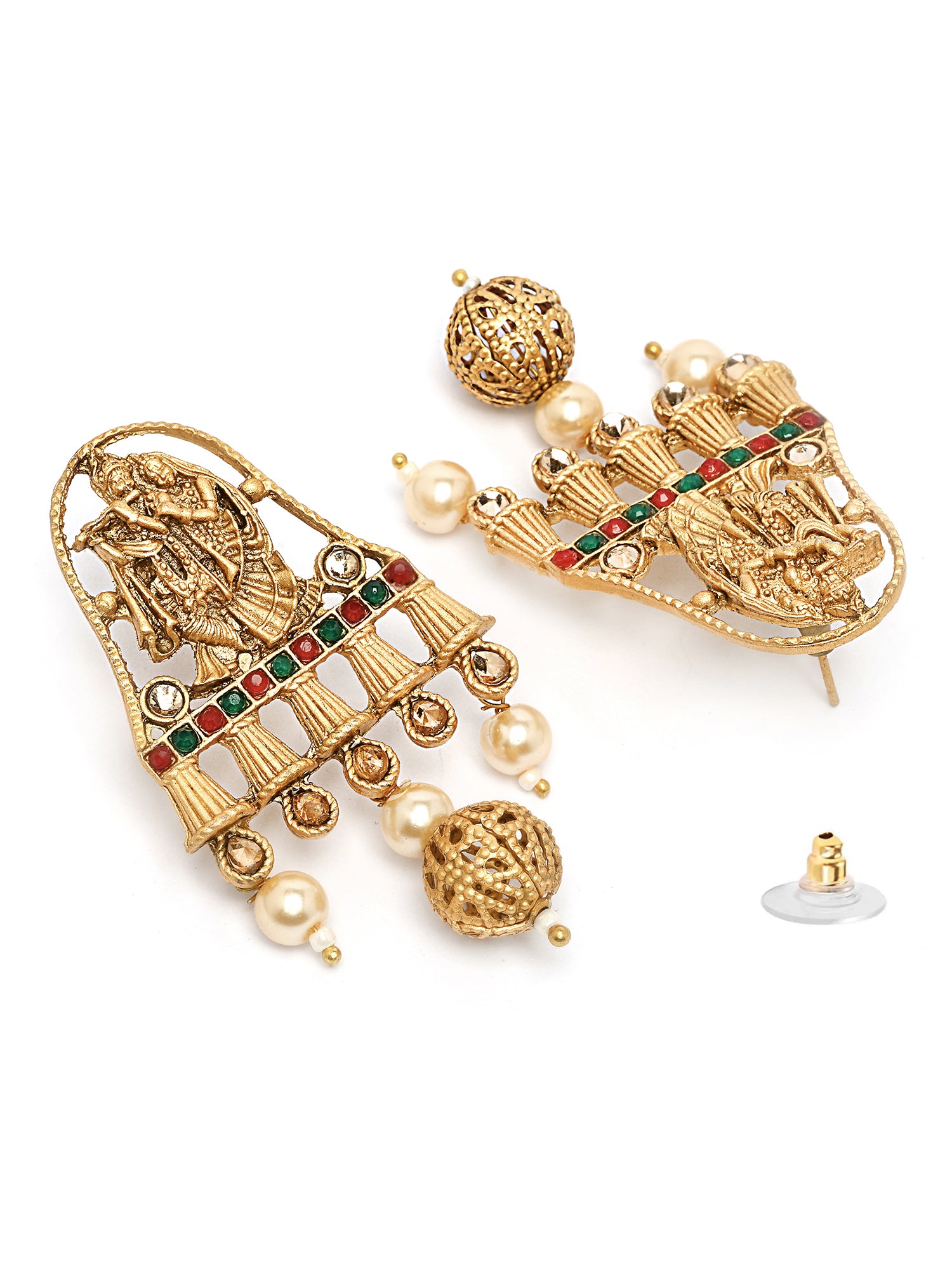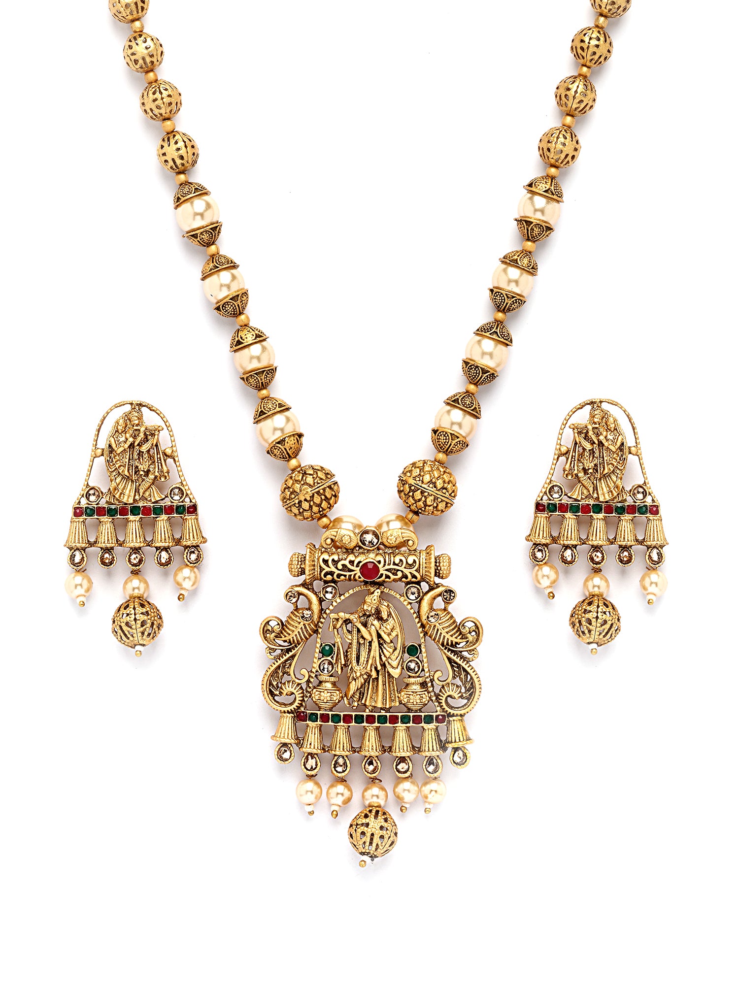 Karatcart Elegant Gold-Plated Radha Krishna Rani Haar Necklace Set with Red and Green Stones
