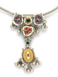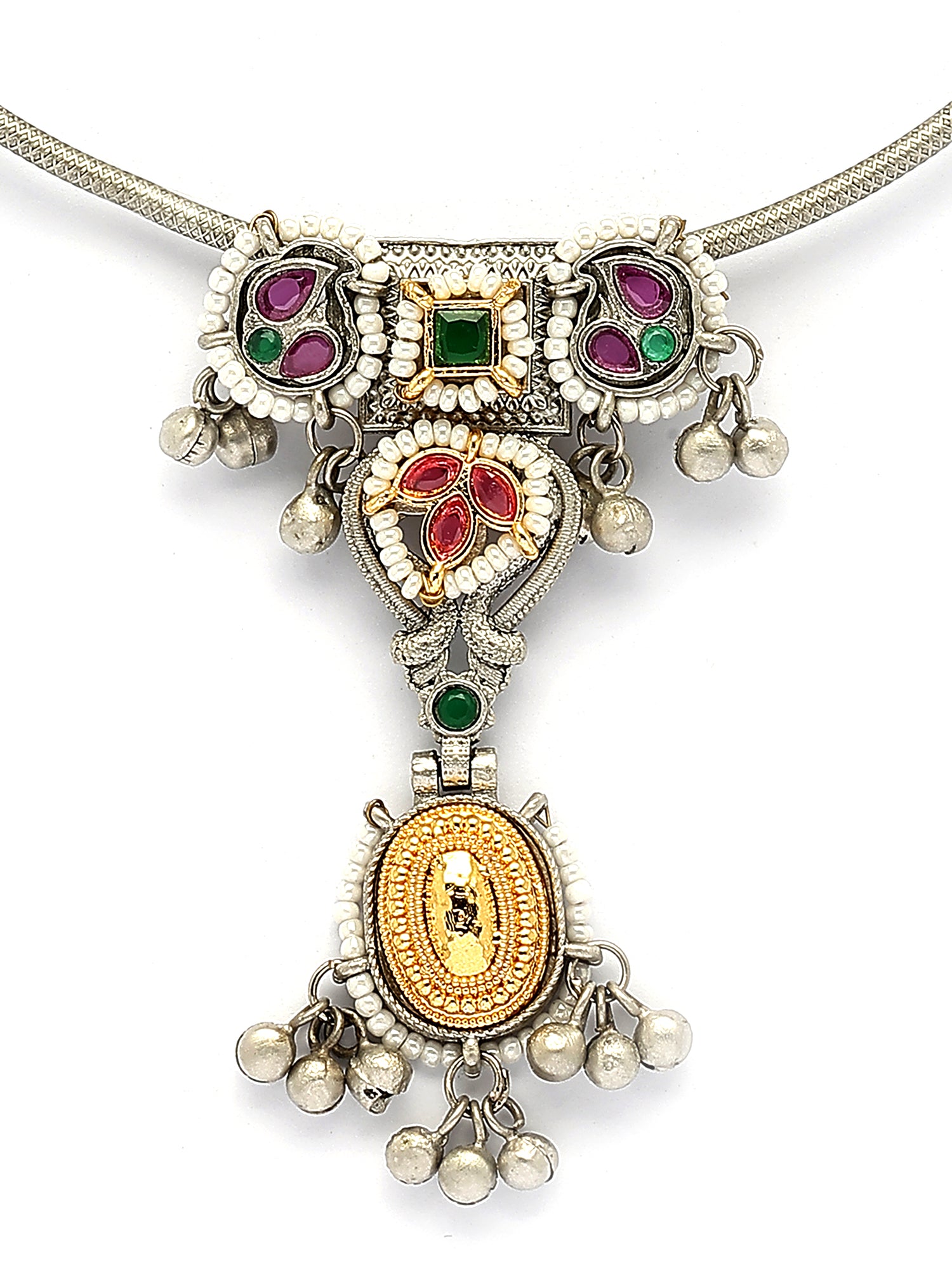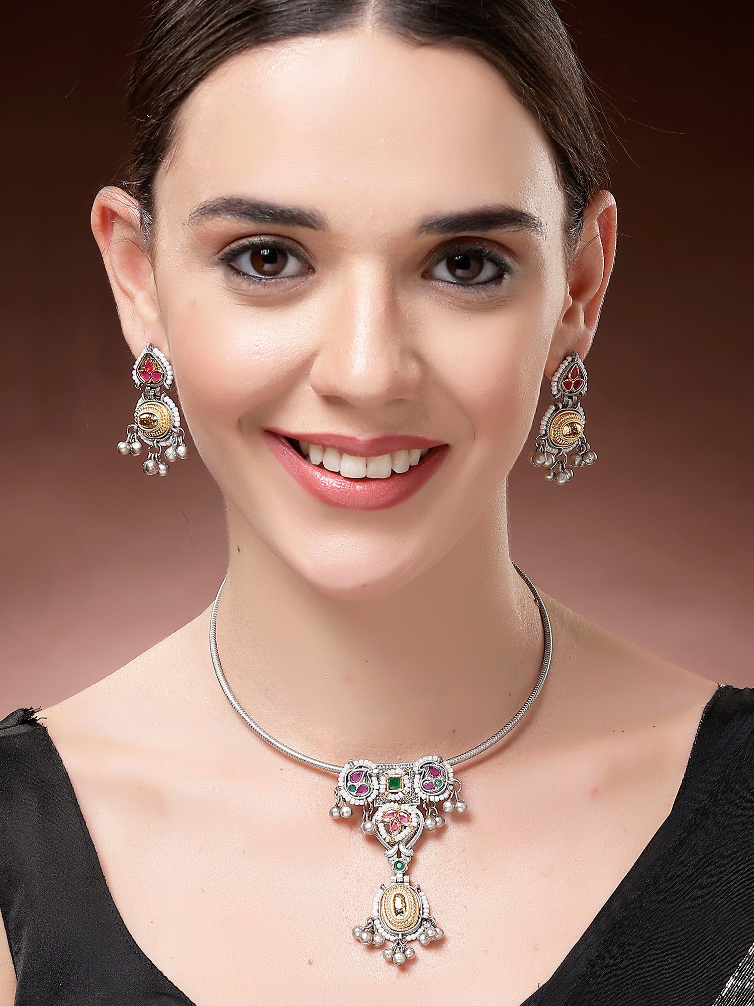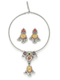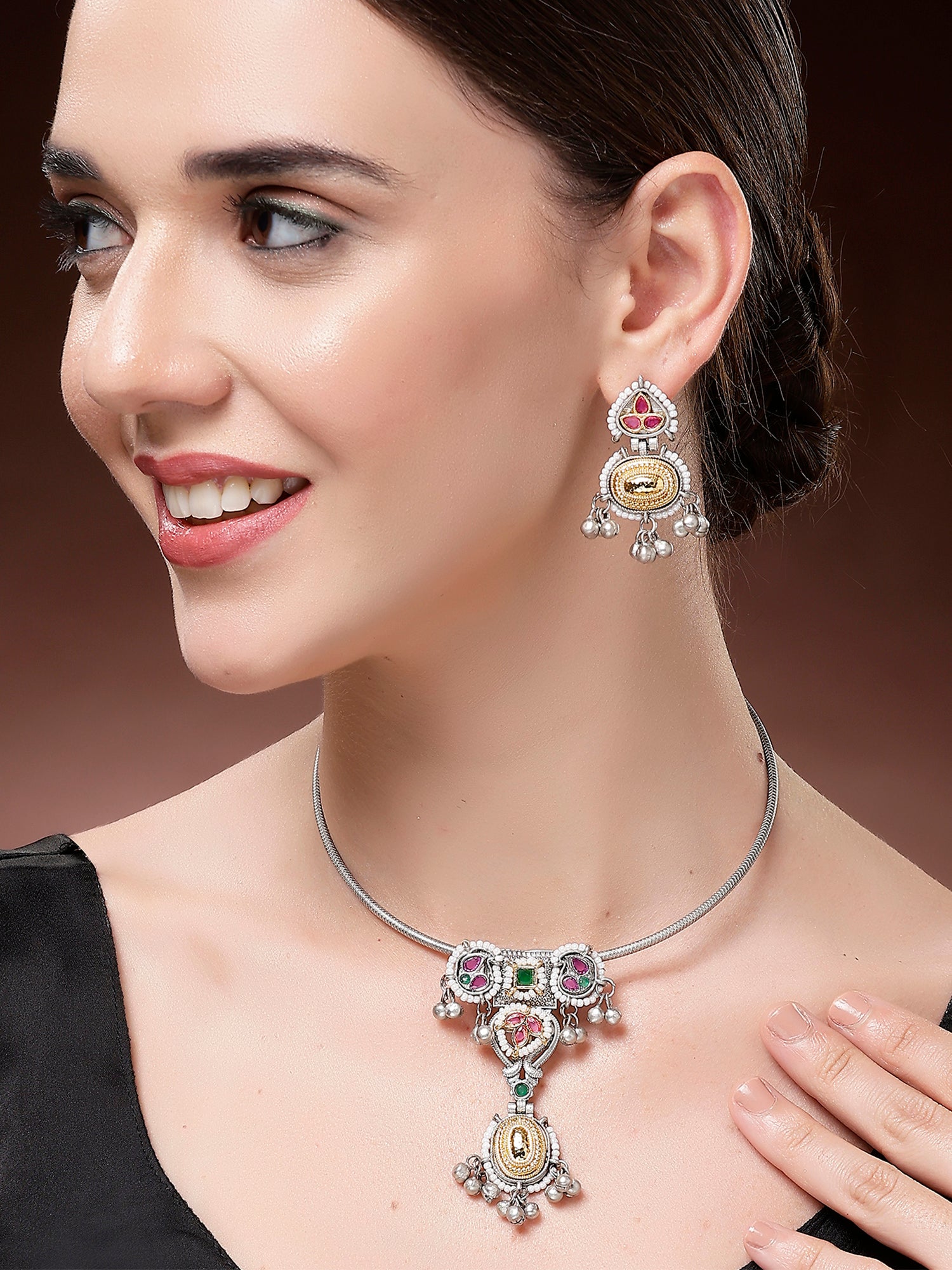 Karatcart Oxidised Silver and Gold Plated Stone Studded Hasli Necklace Set for Women