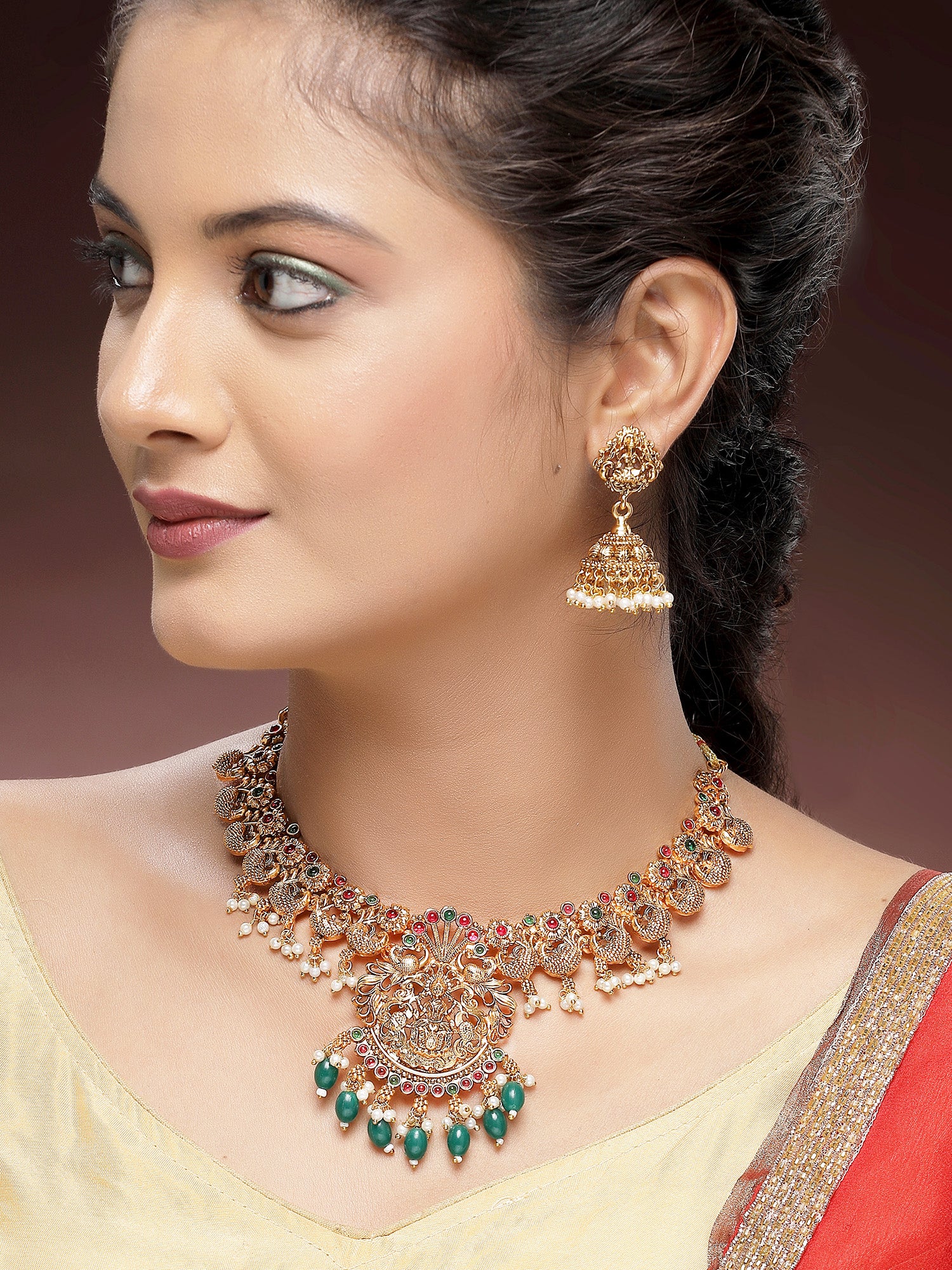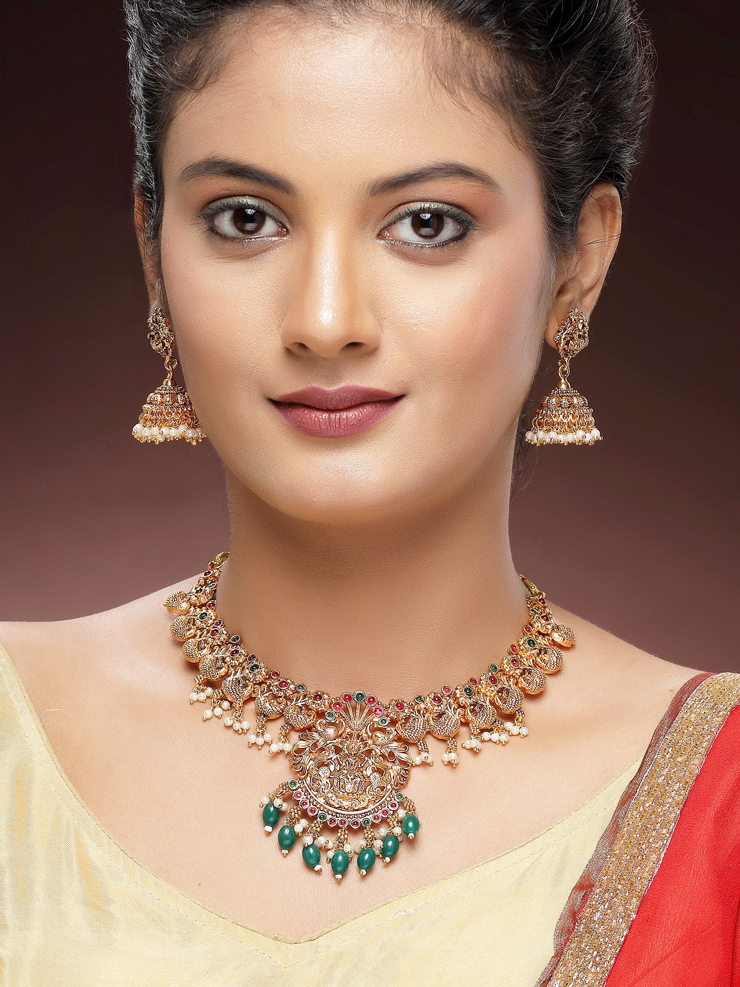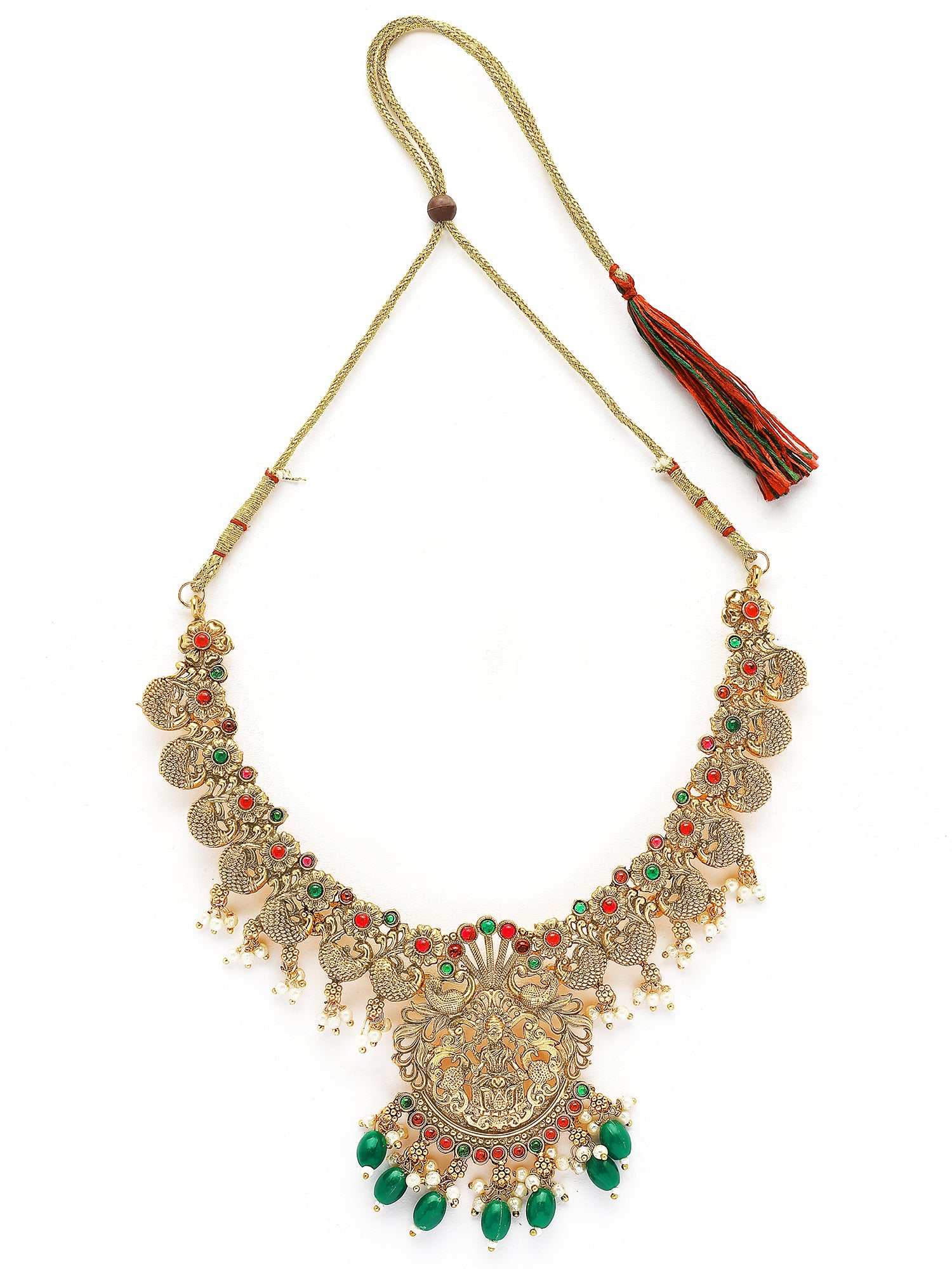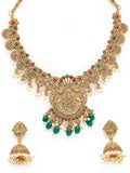 KARATCART Traditional Gold-Plated Green Laxmi Mata and Peacock Temple Jewellery Set for Women