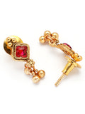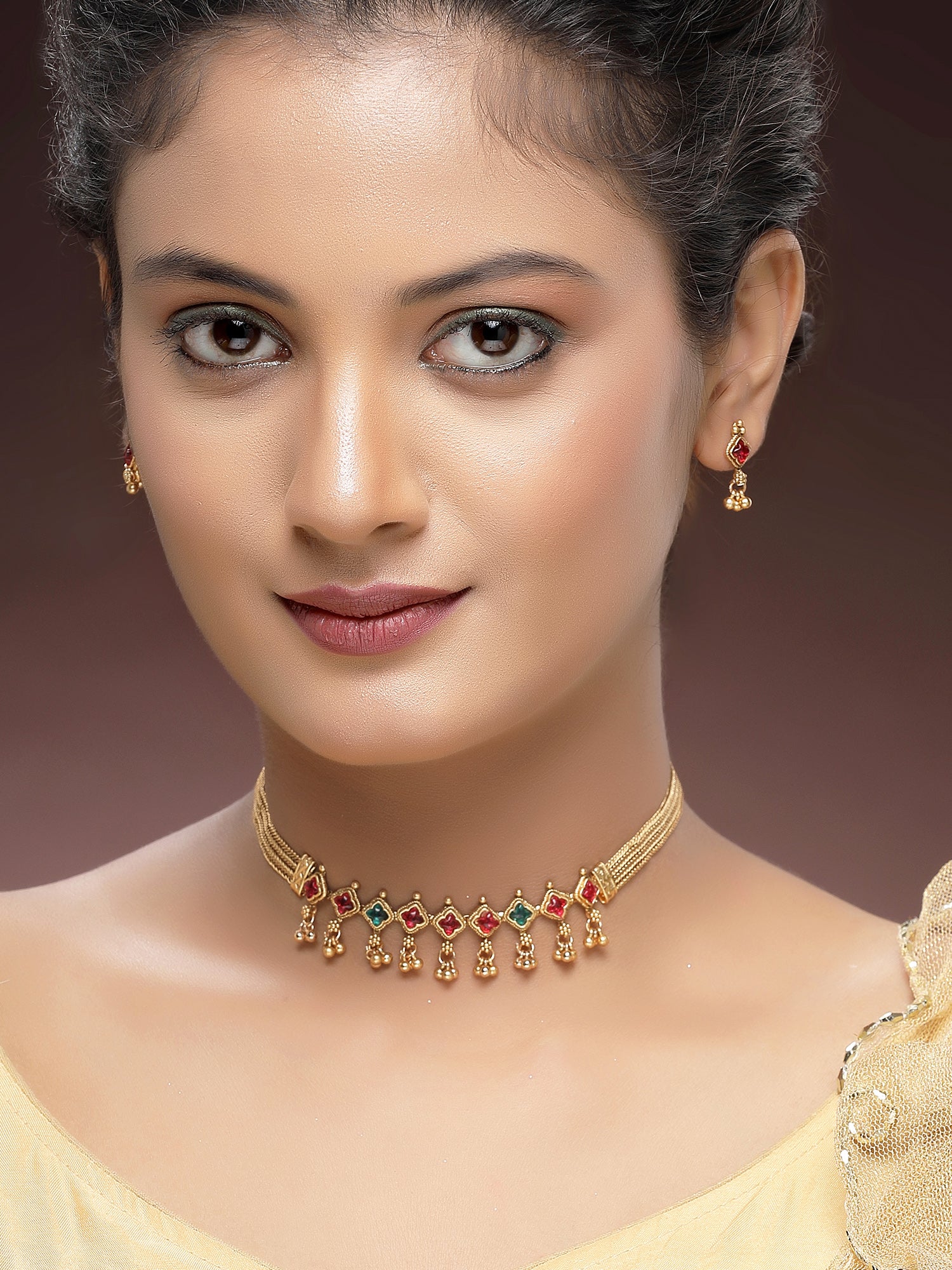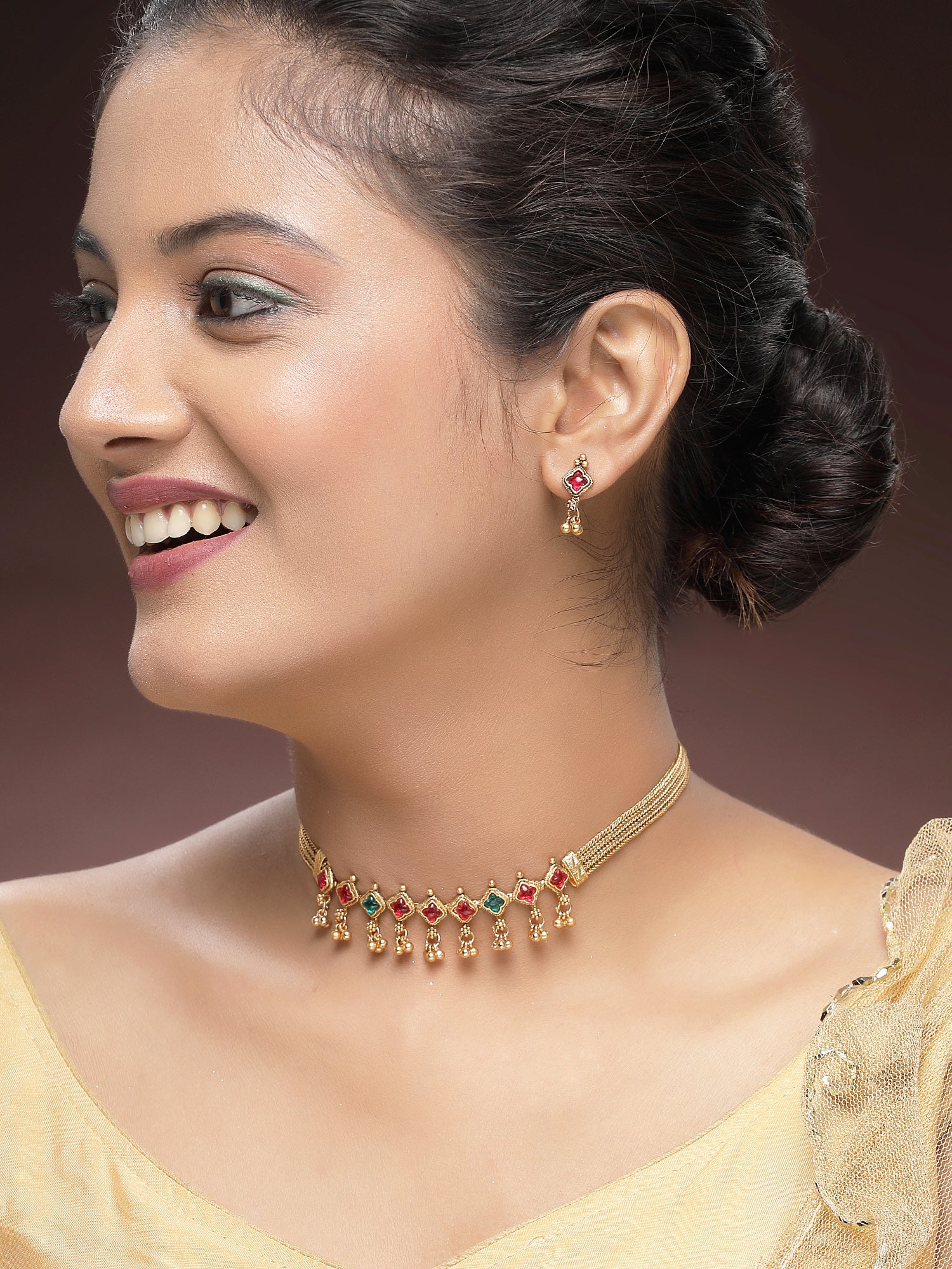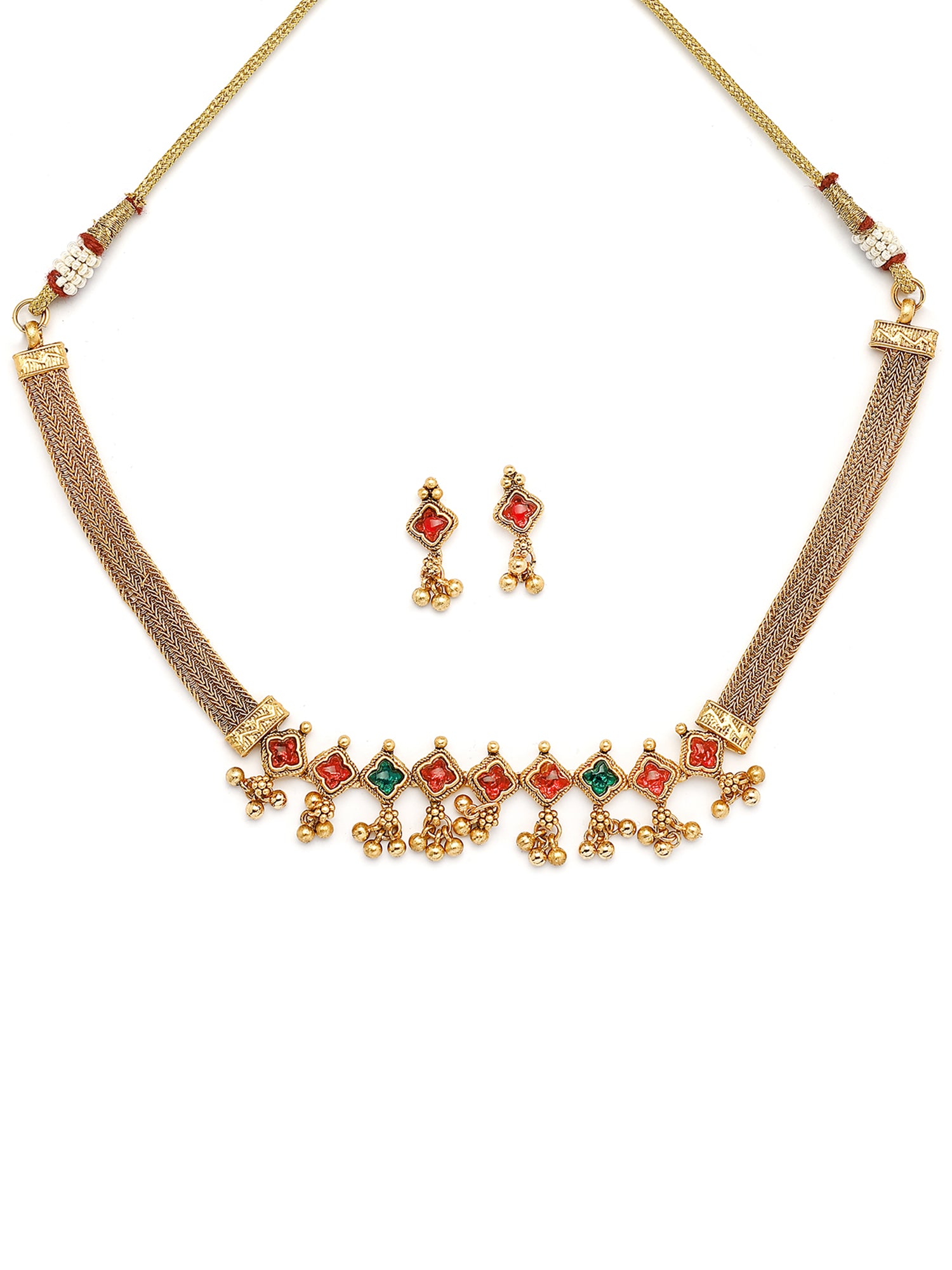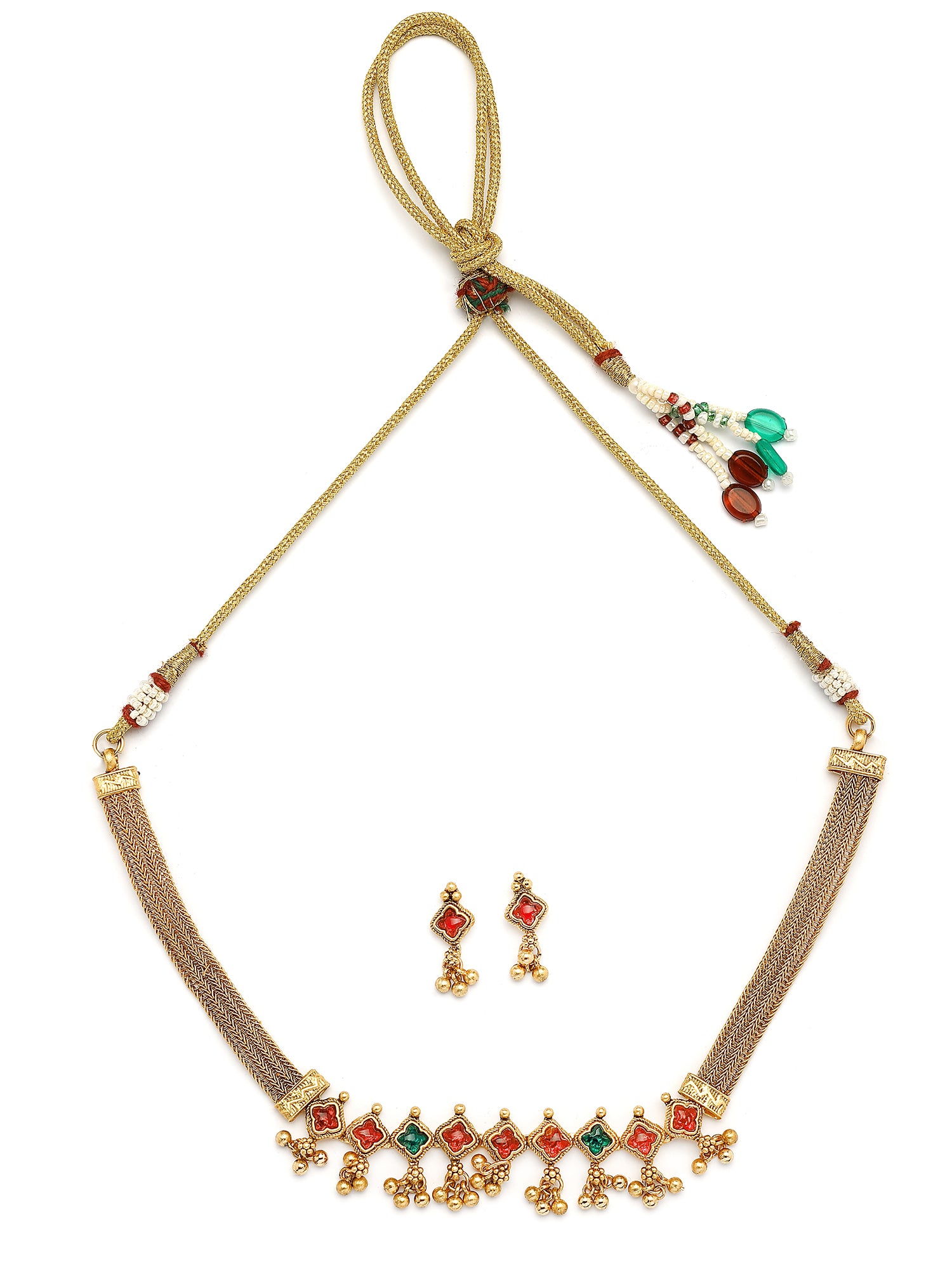 KARATCART Traditional Gold-Plated Red and Green Square Stone Necklace Set for Women