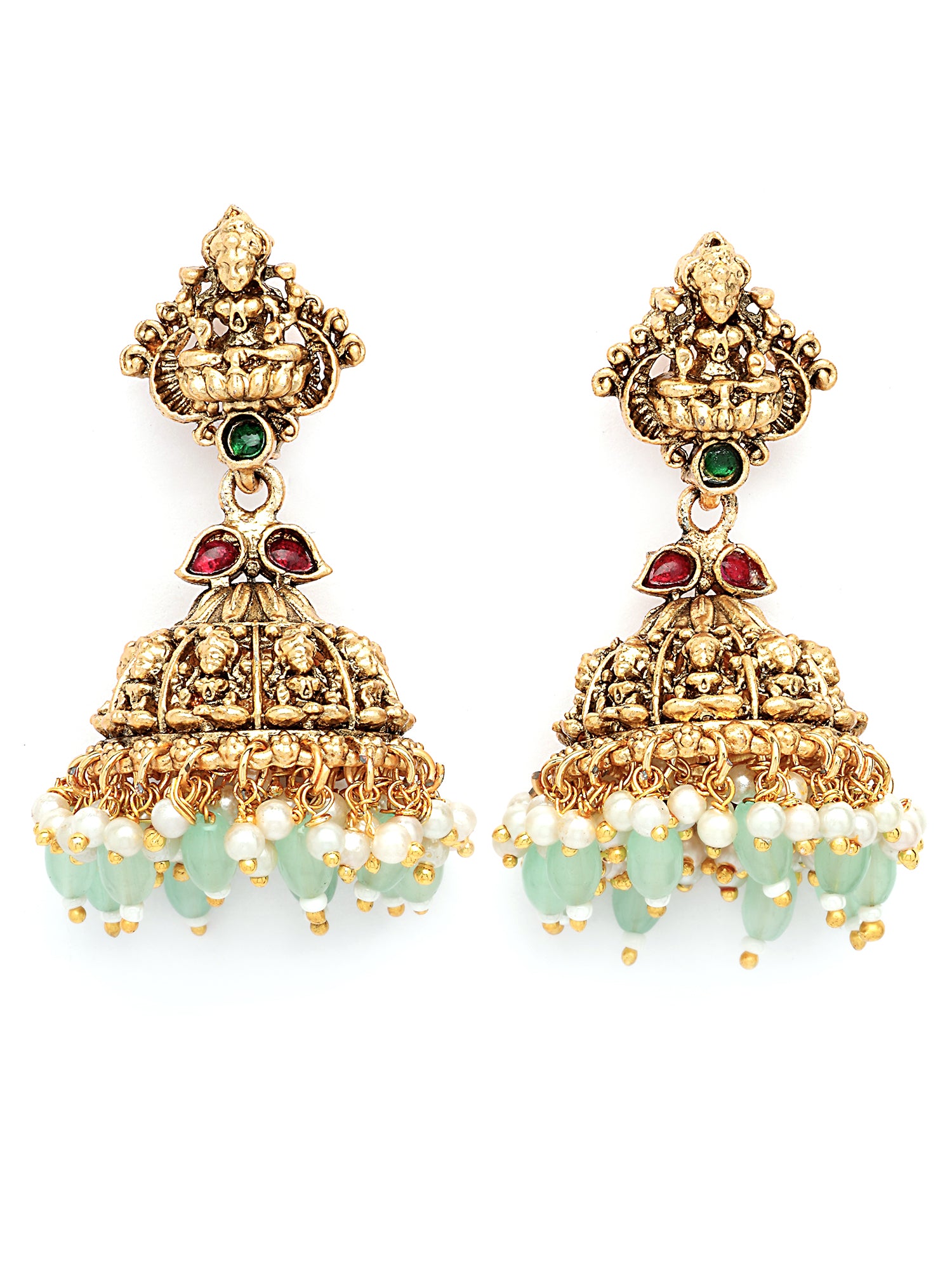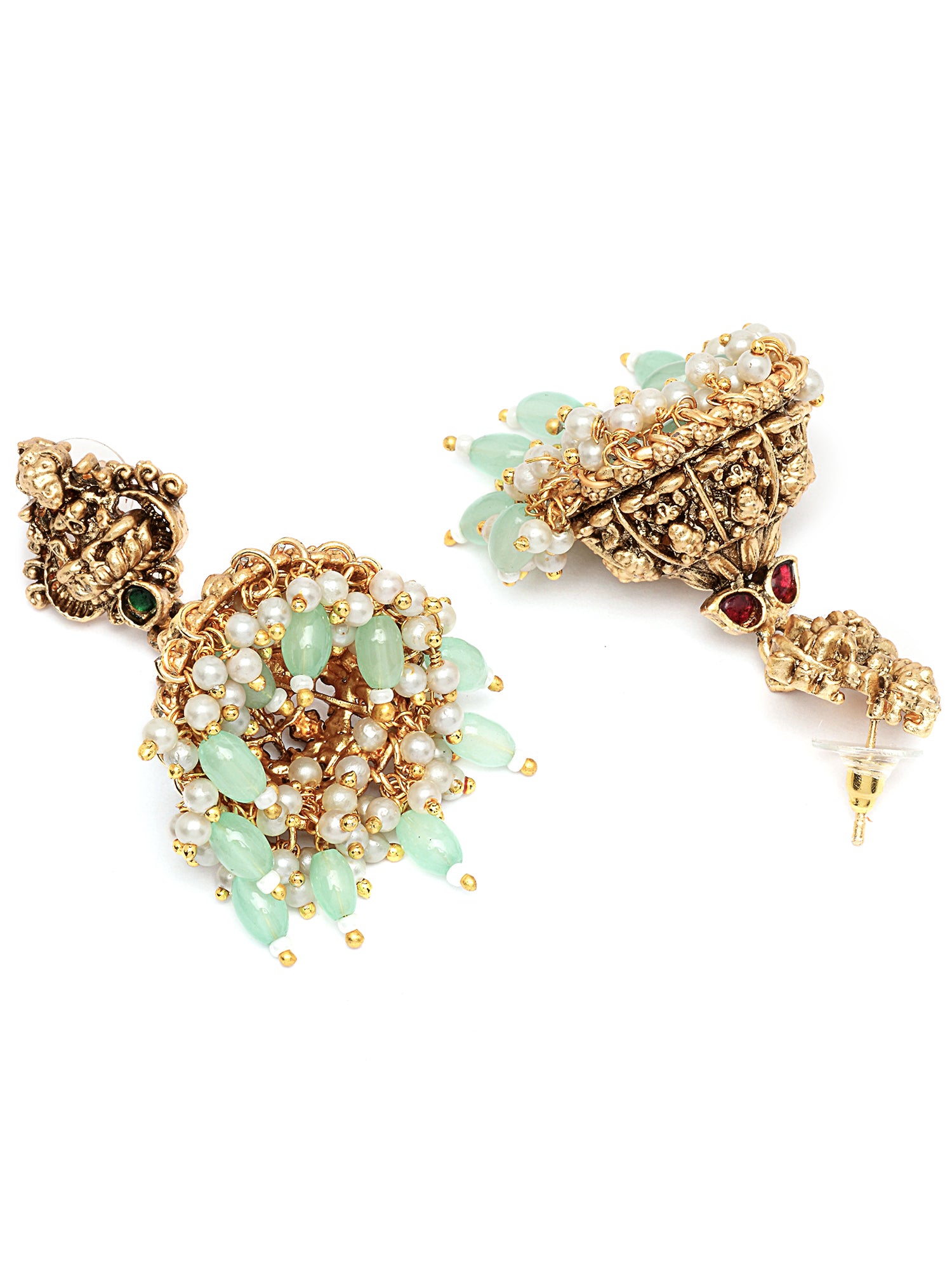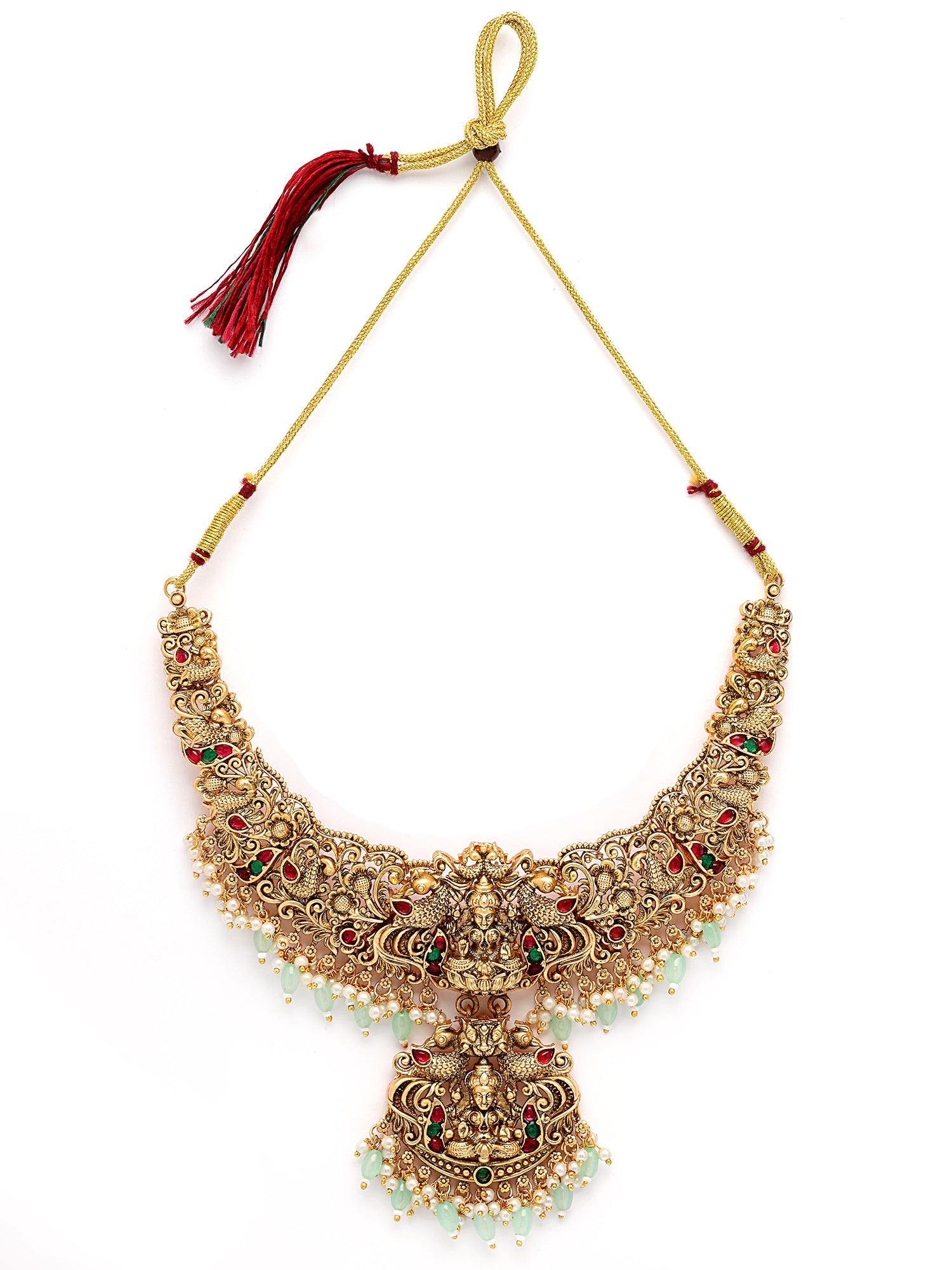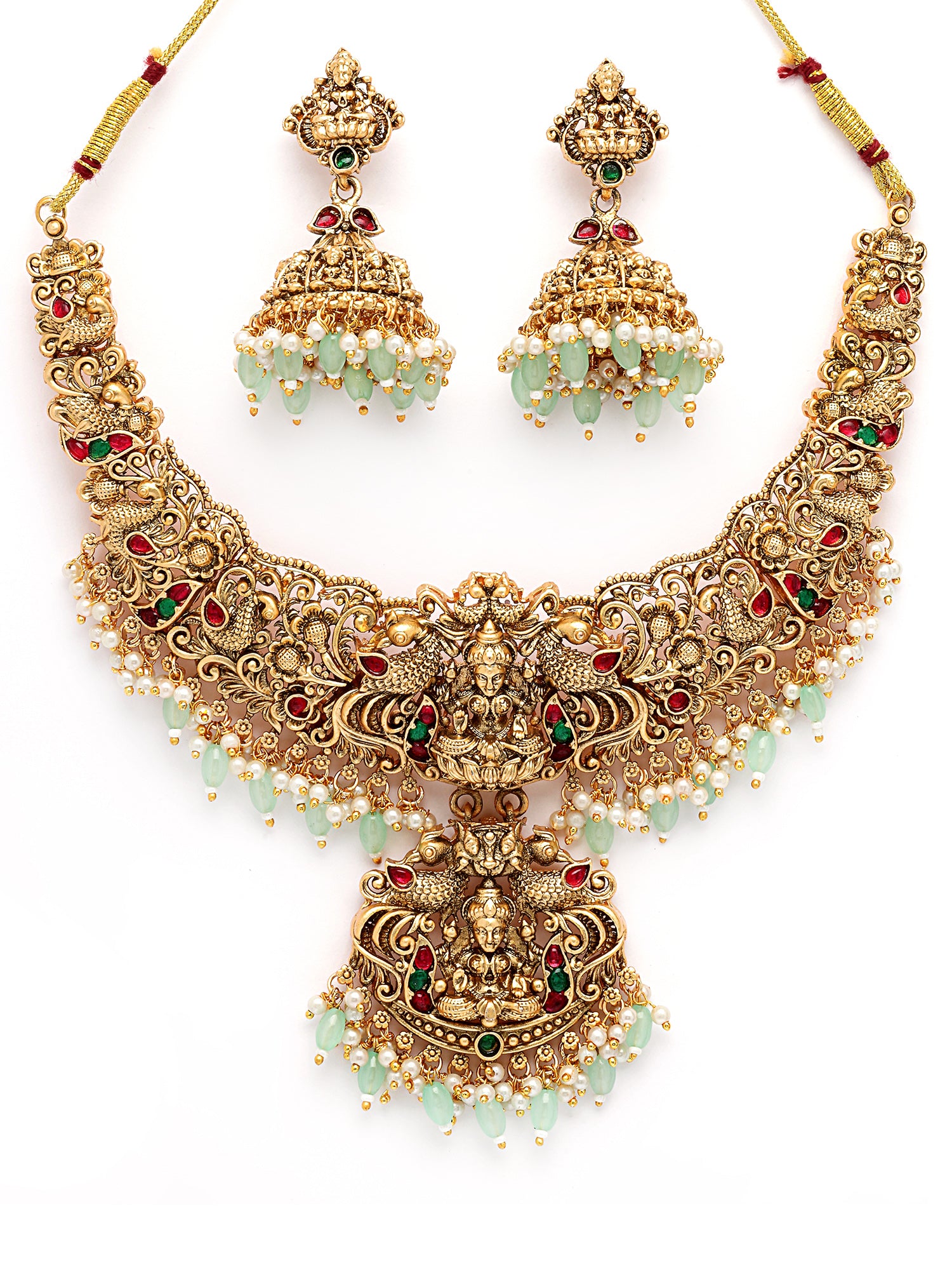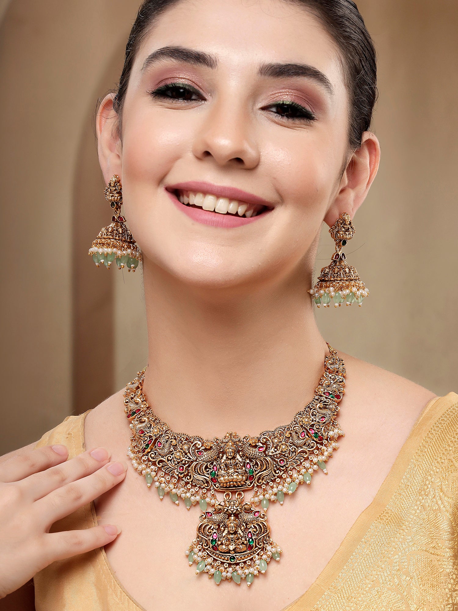 KARATCART Gold-Plated Traditional Lime Green Beads Lakshmi Mata Temple Jewellery Set for Women
