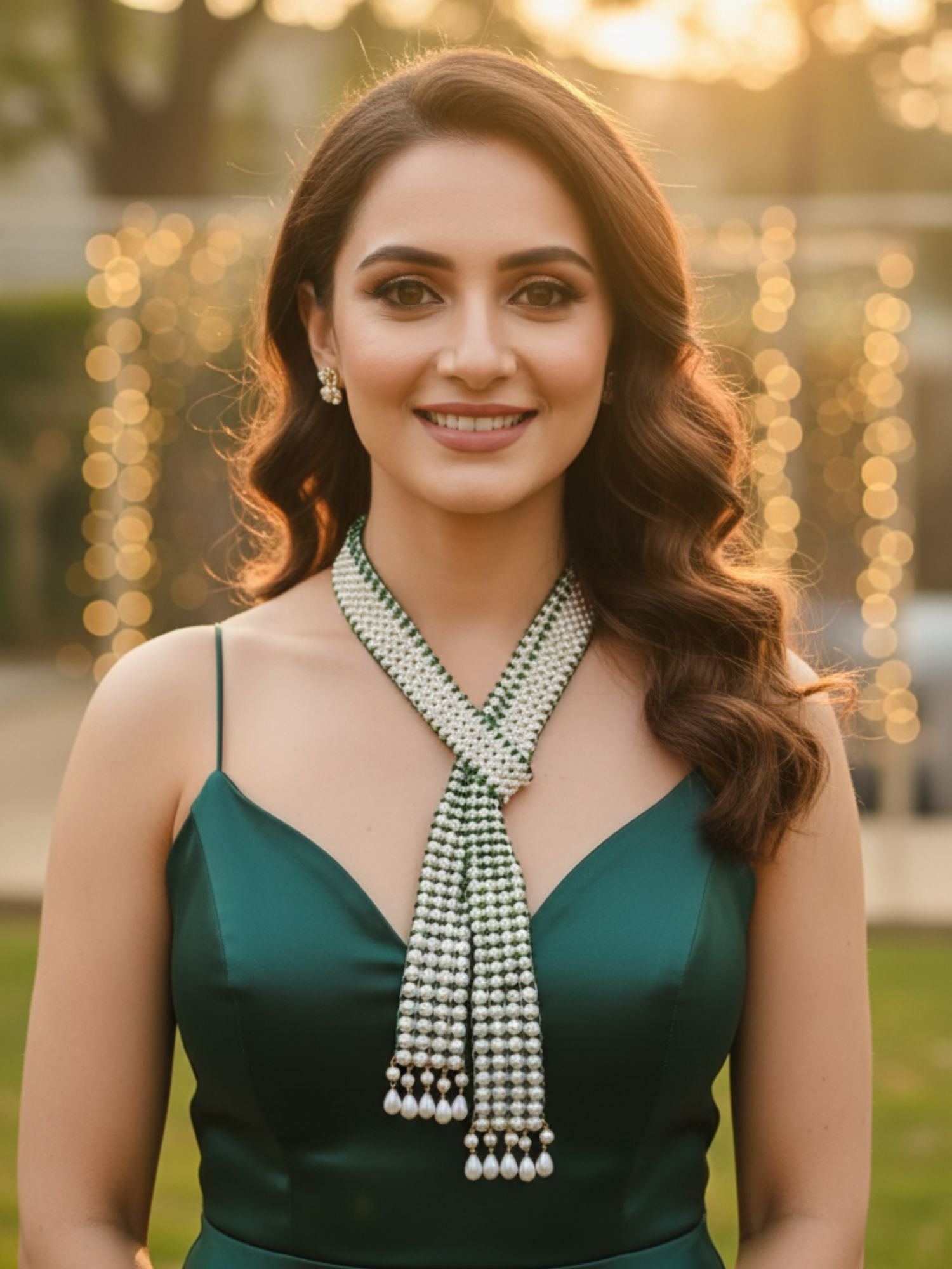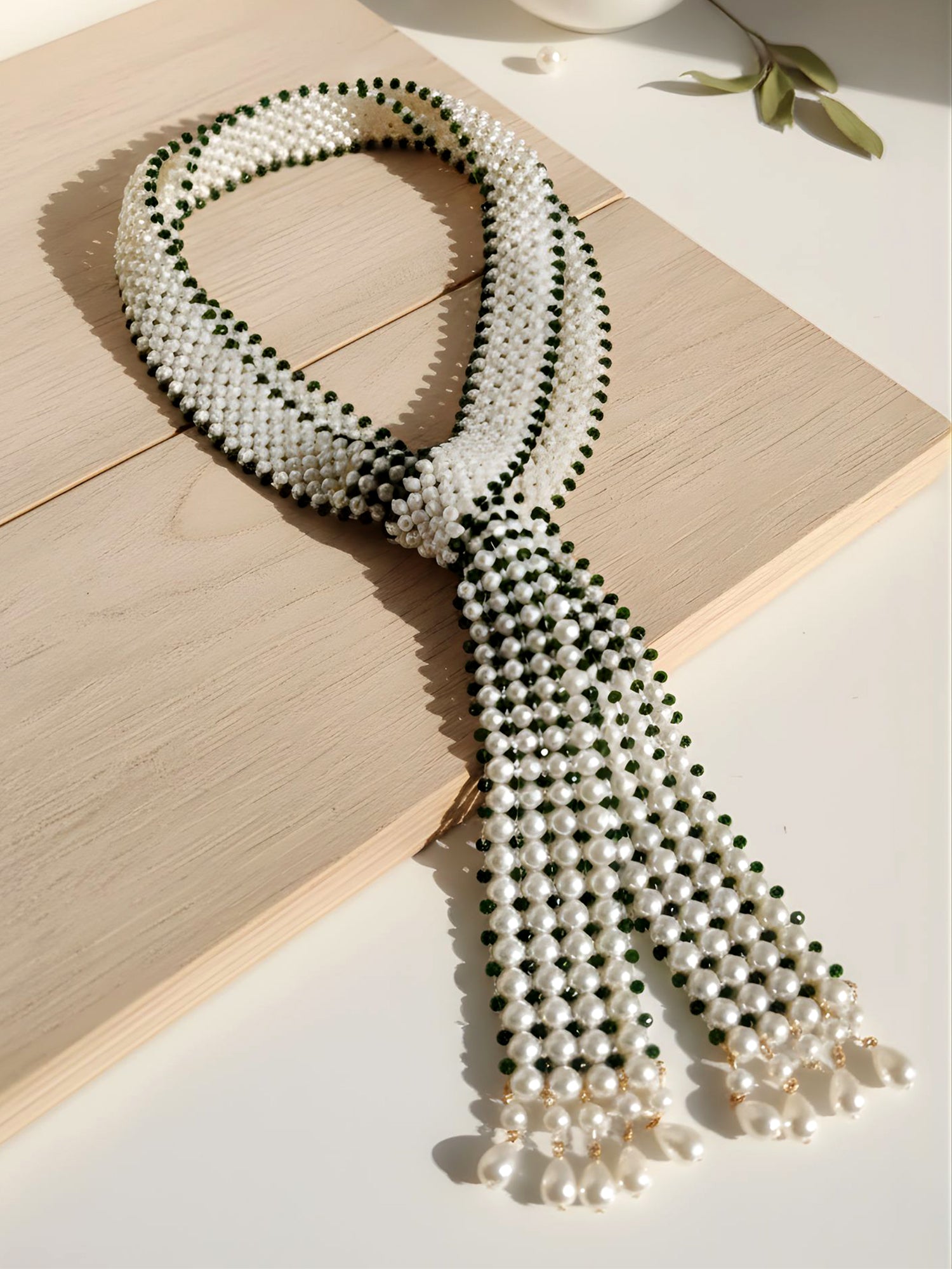 KARATCART Luxurious Green Crystal and Pearl Beaded Handcrafted Necklace for Women