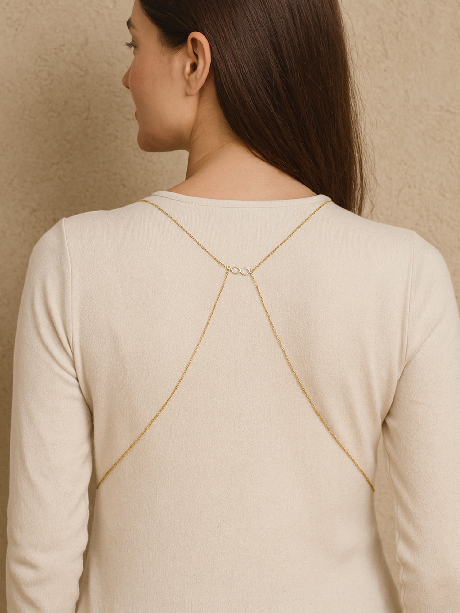 The body chain features delicate, high-quality chains that drape gracefully over your outfit, creating an exquisite silhouette. Lightweight and comfortable to wear, it is designed for those who seek effortless style and versatility. Whether styled over a chic evening dress or paired with a trendy crop top and jeans, this accessory transforms your look in seconds.