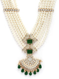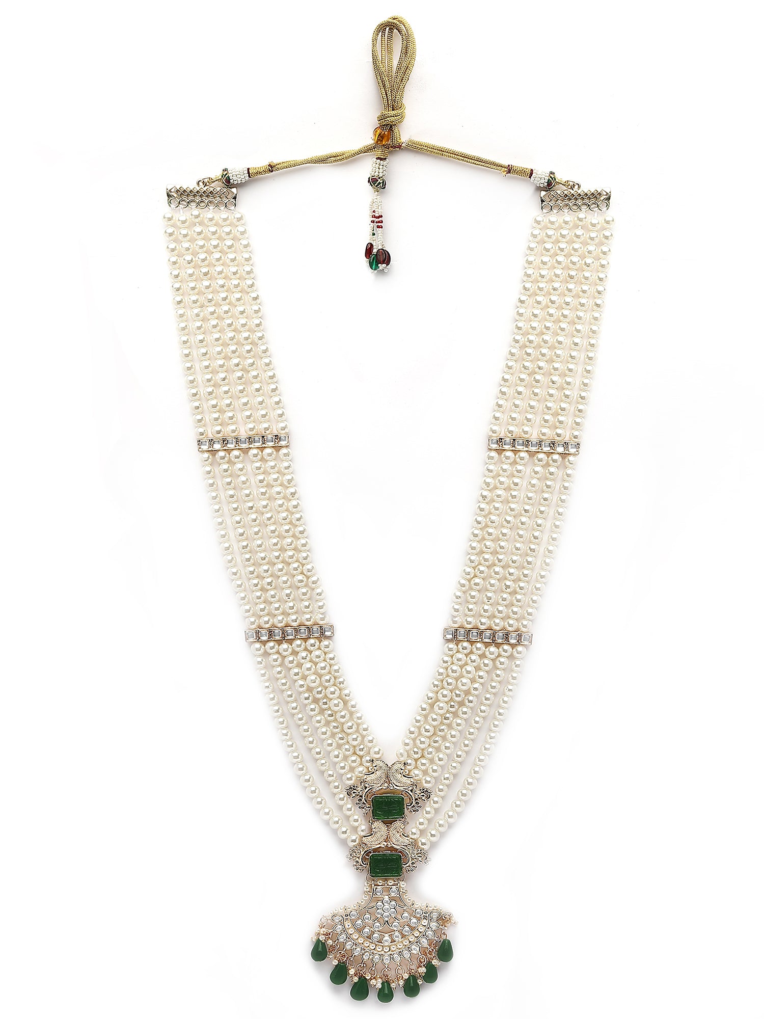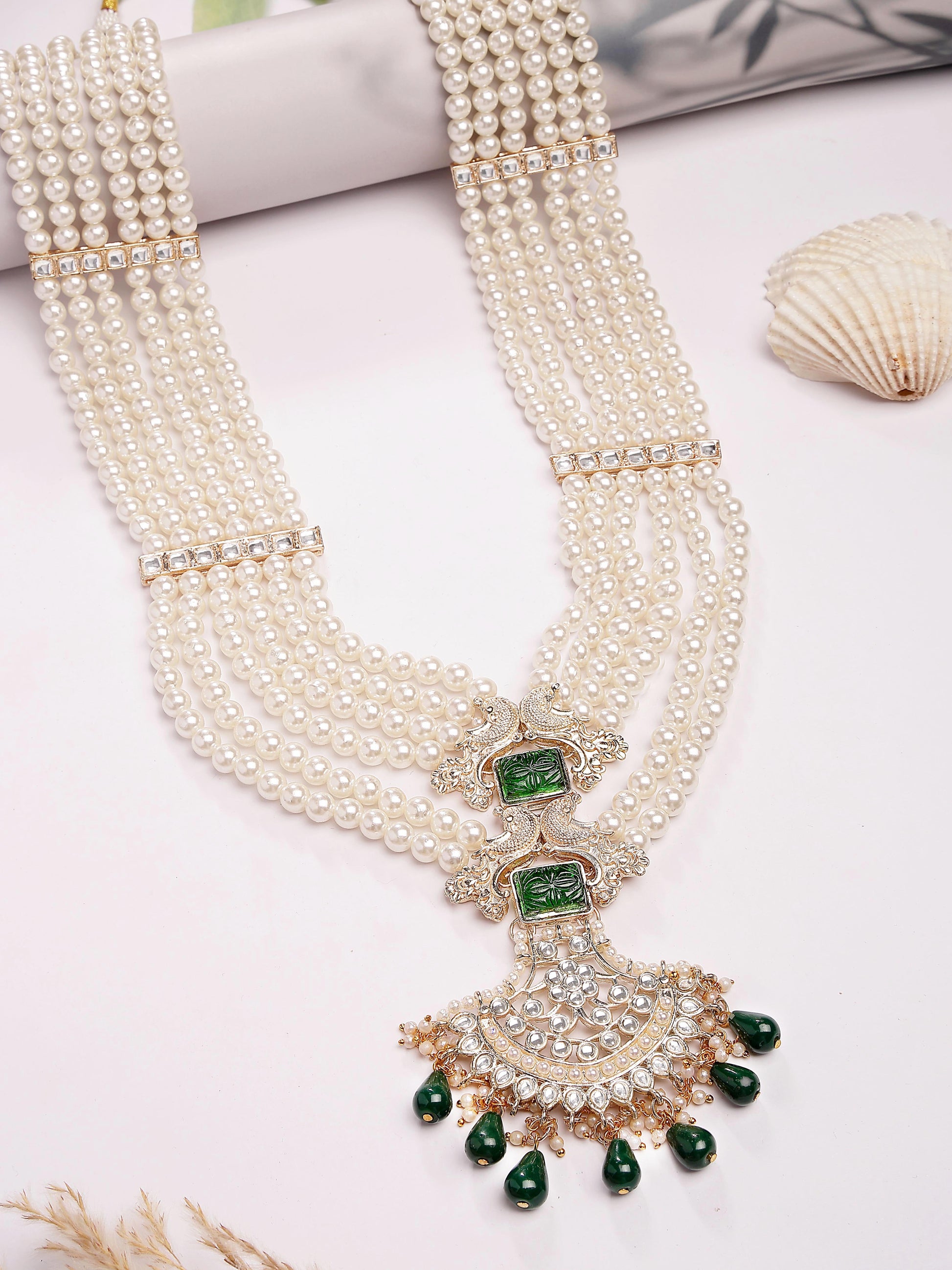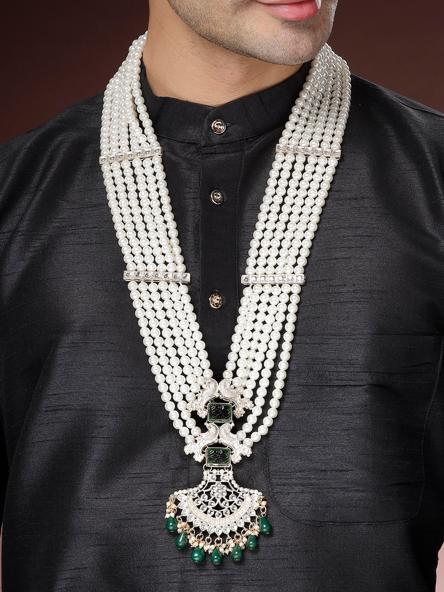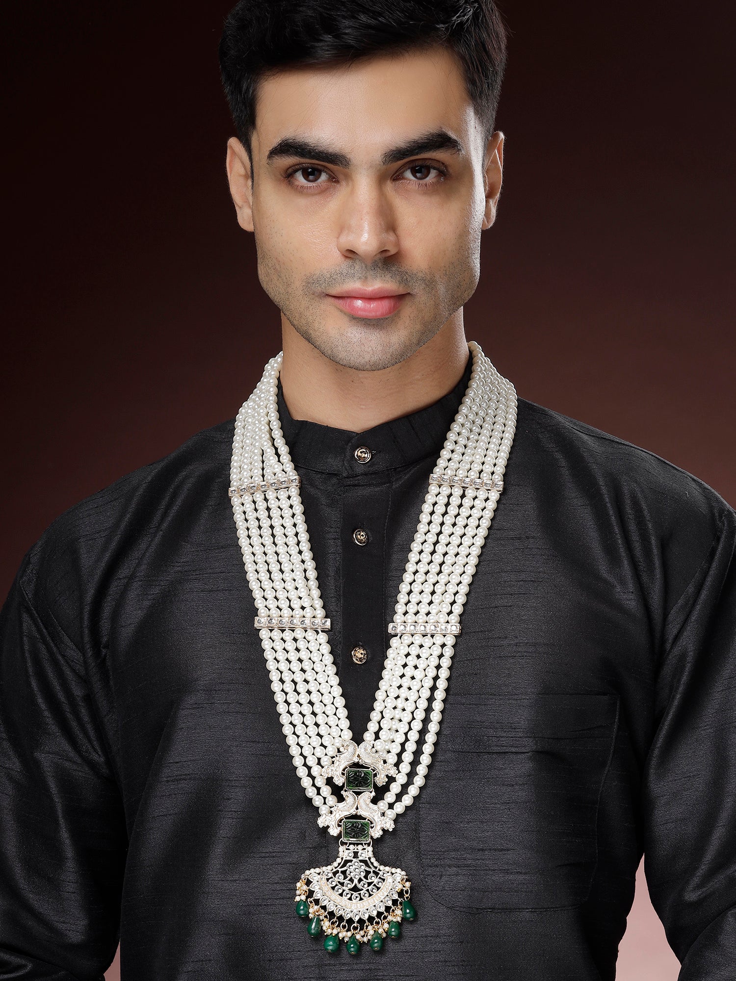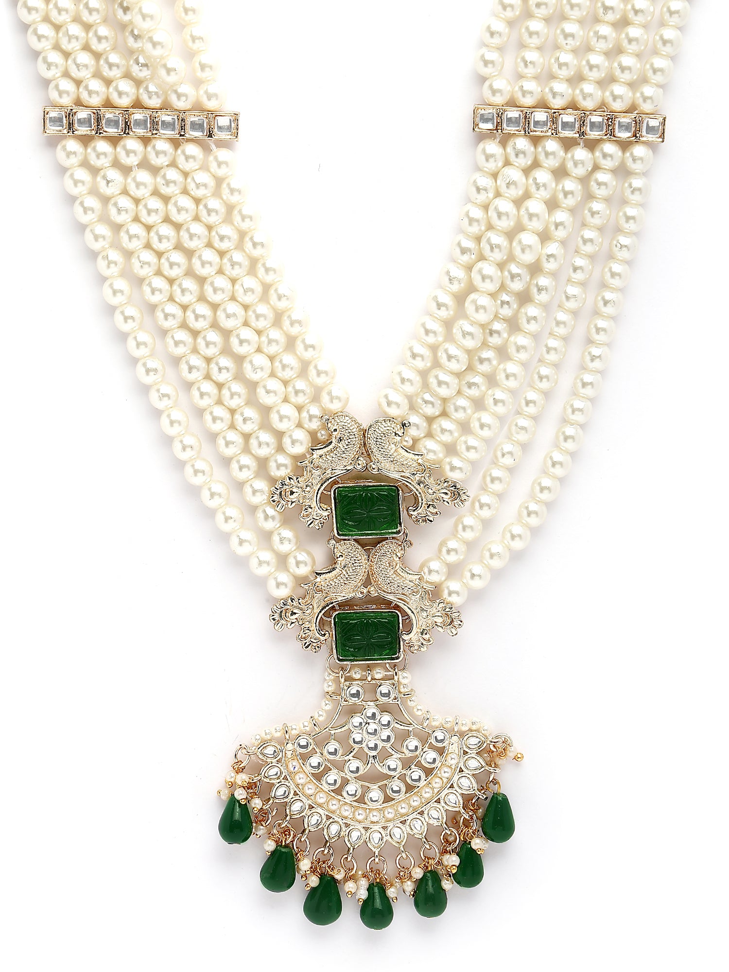 Karatcart Luxurious Green Carved Stone Kundan Pearl Maharaja Haar for Men