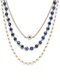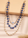 Elevate your style with our stunning multilayered necklace, featuring a gold-plated finish and adorned with delicate white pearls. This layered necklace is designed for those who appreciate elegance in simplicity. Its minimal design makes it the perfect accessory for both casual and formal outfits, ideal for everyday use. Crafted with care, this multilayered minimal necklace features multiple chains that seamlessly blend sophistication with a touch of boho-chic style. The addition of the evil eye pendant adds a unique charm, believed to bring protection and good fortune. The evil eye multilayered chain not only enhances your fashion statement but also provides a meaningful touch to your look. Lightweight and comfortable, it's the perfect necklace for everyday wear. Add this evil eye necklace to your collection and enjoy a simple yet stylish piece that complements any occasion.