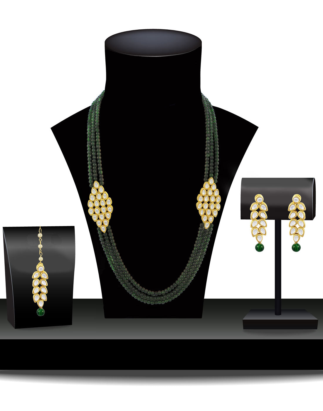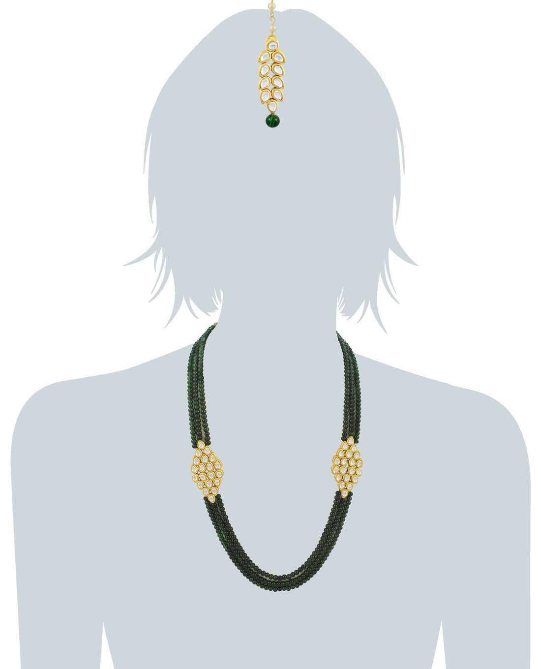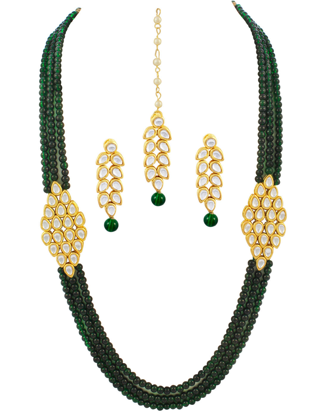 A pair of matching drop earrings, has a post-and-back closure and a Maangtikka with same design.