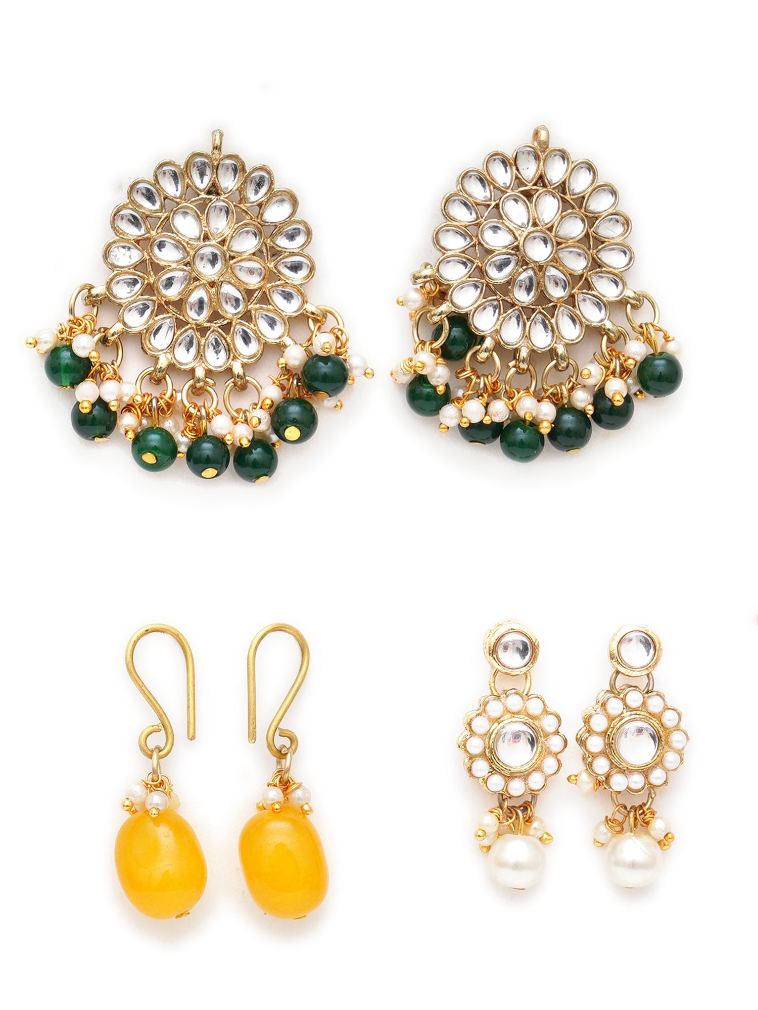 • Karatcart Set of 3 Handcrafted Kundan Earrings Combo for Women. Our products are designed with high-quality Kundan Stones and these products are enhanced with plating that are skin-friendly & with love to reach your heart.