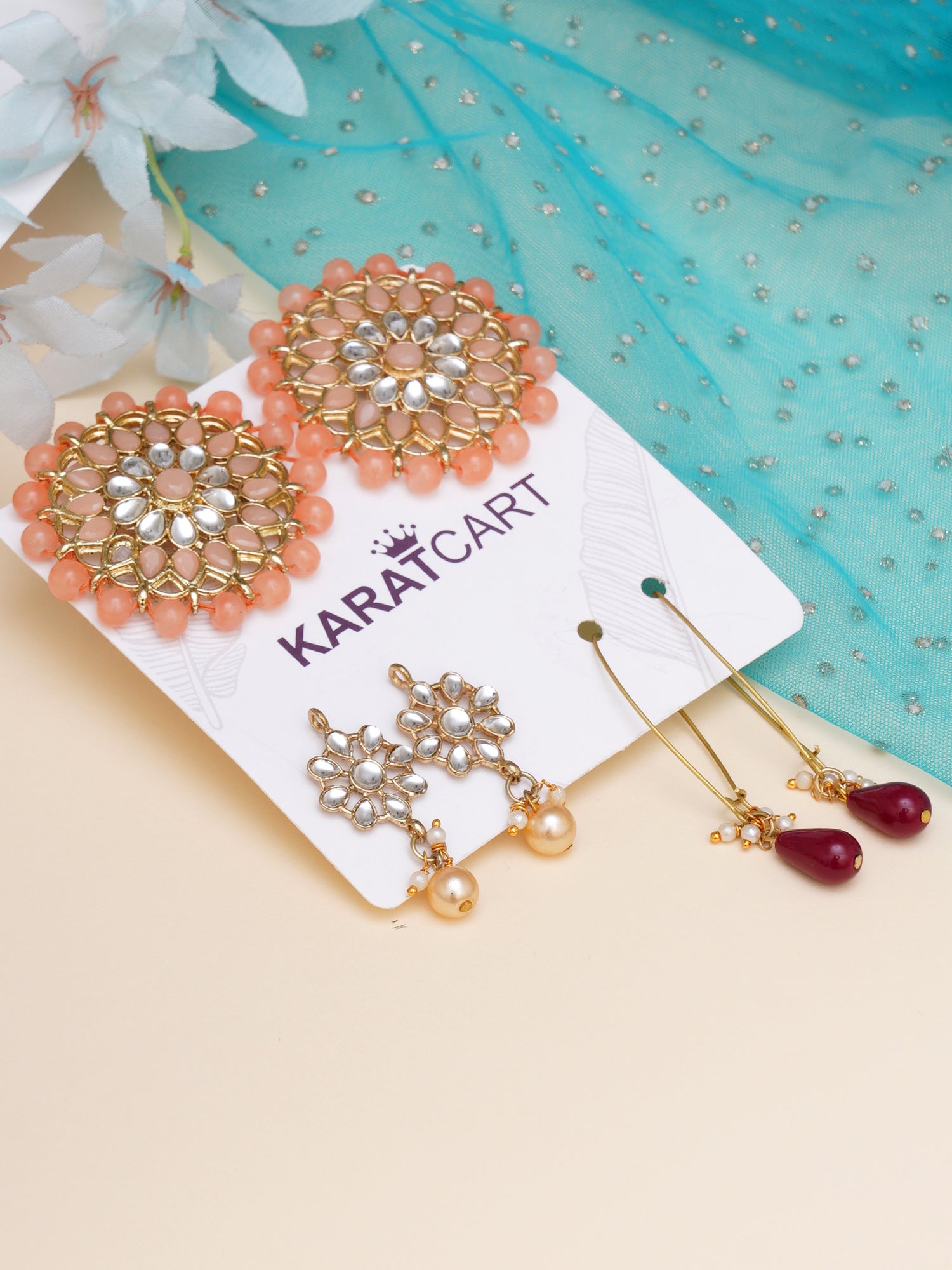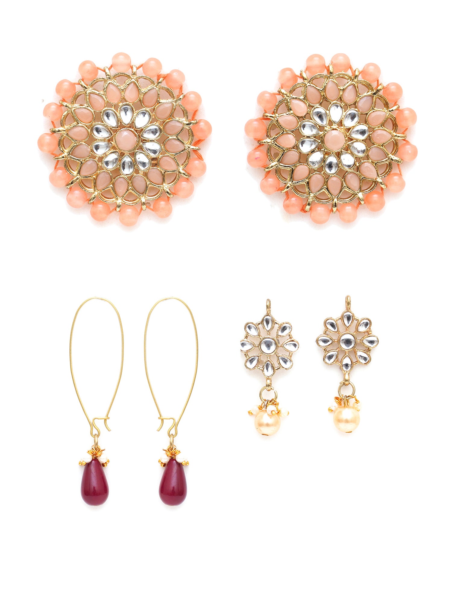 • Karatcart Set of 3 Handcrafted Kundan Earrings Combo for Women. Our products are designed with high-quality Kundan Stones and these products are enhanced with plating that are skin-friendly & with love to reach your heart.