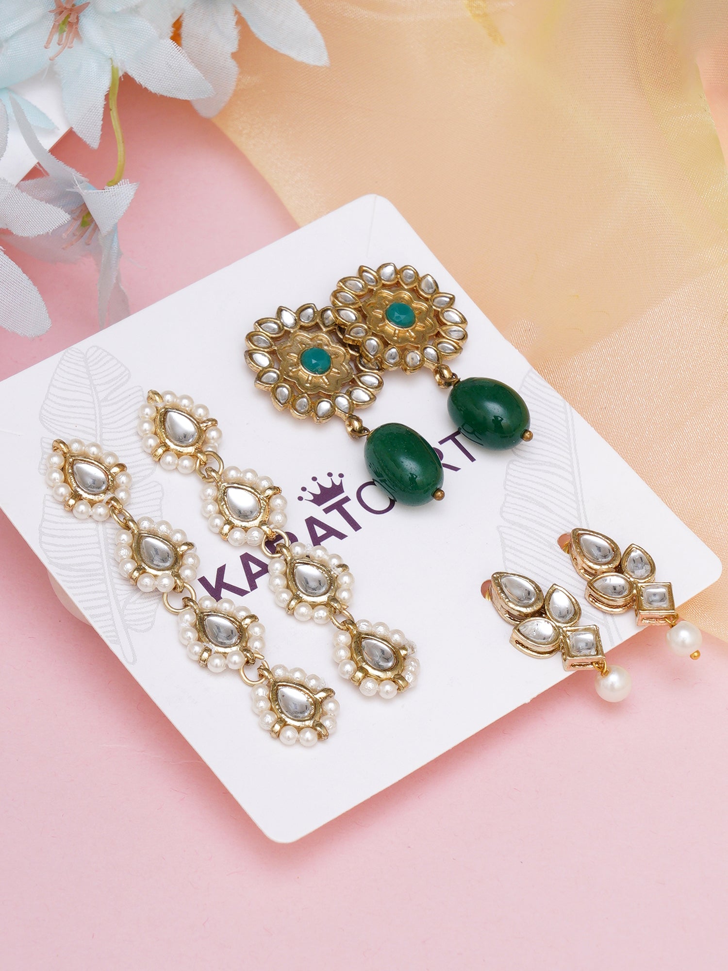 • Karatcart Set of 3 Handcrafted Kundan Earrings Combo for Women. Our products are designed with high-quality Kundan Stones and these products are enhanced with plating that are skin-friendly & with love to reach your heart.