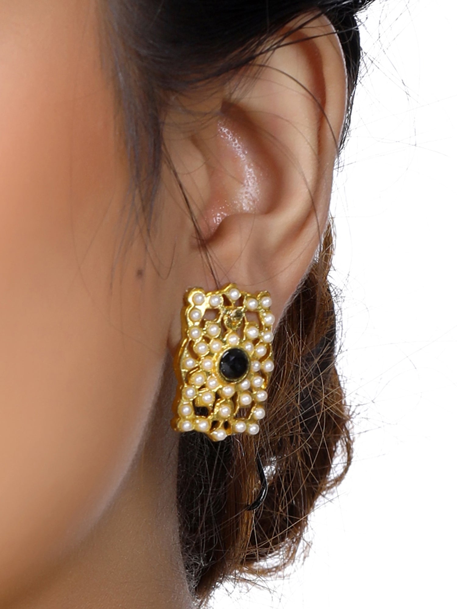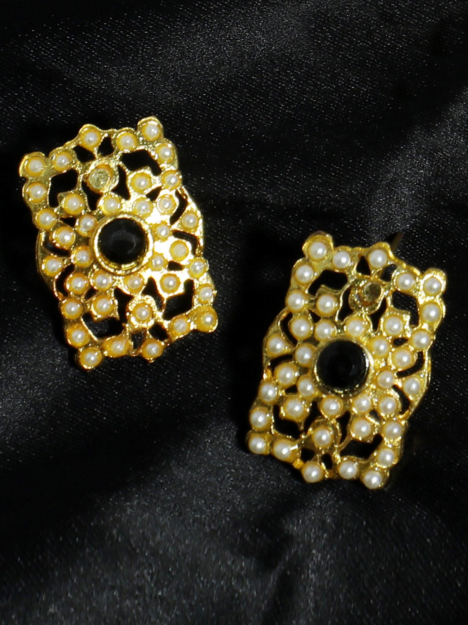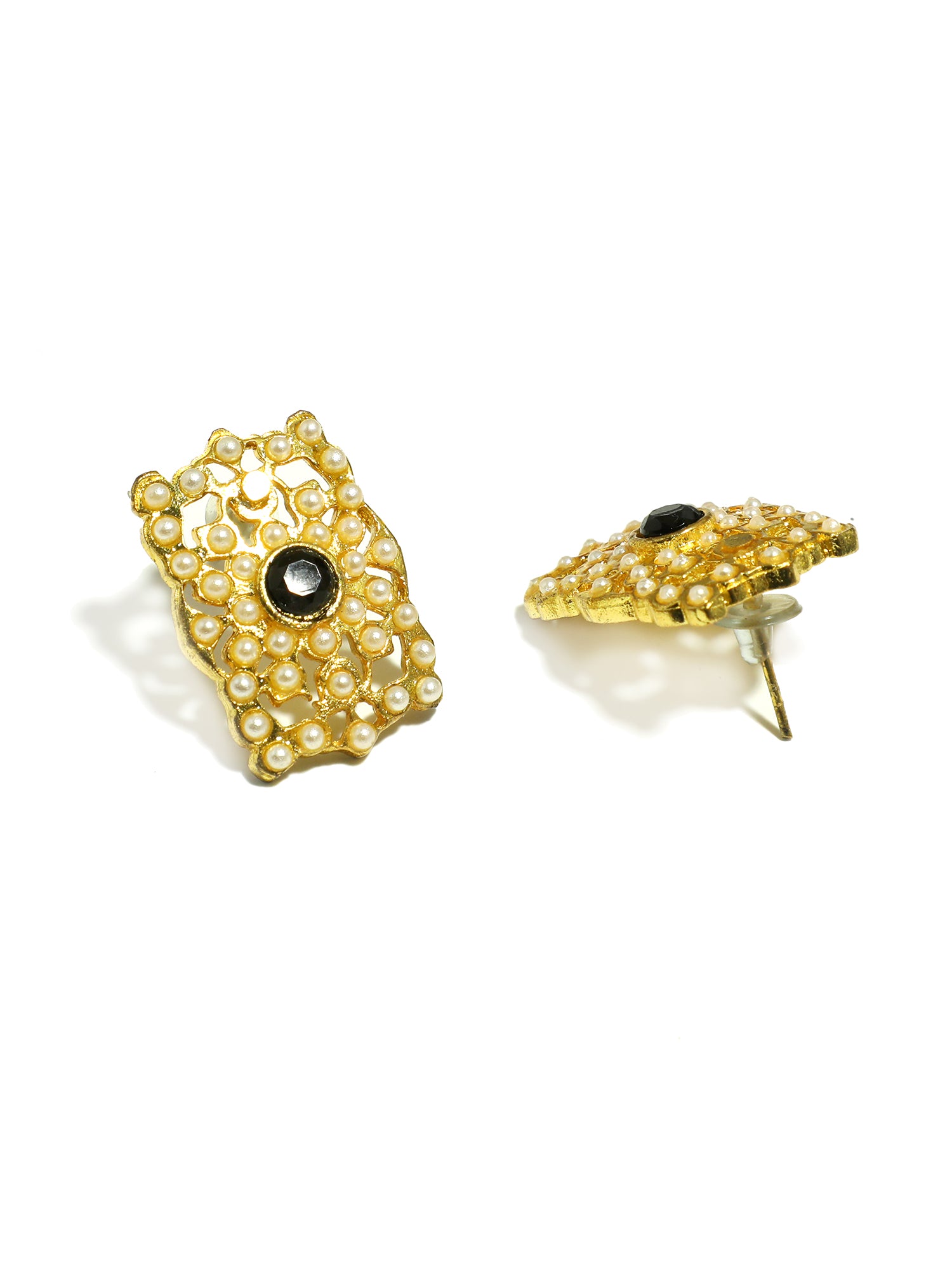 - Gold Plated Black Kundan Stud Earrings for Women. It's Five Layer Micro Gold Plated and Embellished with Kundan for High Durability. Intricate high polish creates glamorous reflections and adds a luxurious look. Perfect for Weddings, Festivals, Traditional Occasions. Best when paired with any Indian outfit.