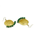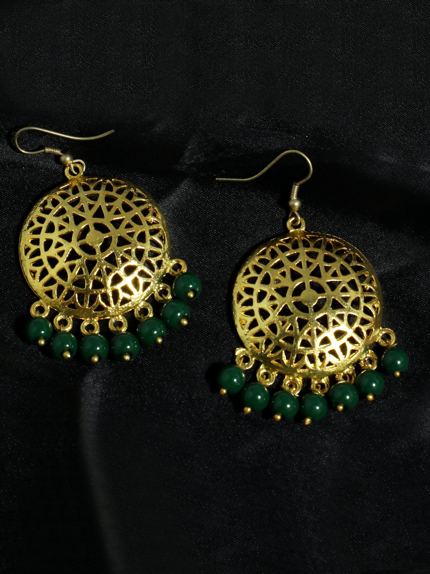 - Gold Plated Green Beads Kundan Dangler Earrings for Women. It's Five Layer Micro Gold Plated and Embellished with Kundan for High Durability. Intricate high polish creates glamorous reflections and adds a luxurious look. Perfect for Weddings, Festivals, Traditional Occasions. Best when paired with any Indian outfit.
