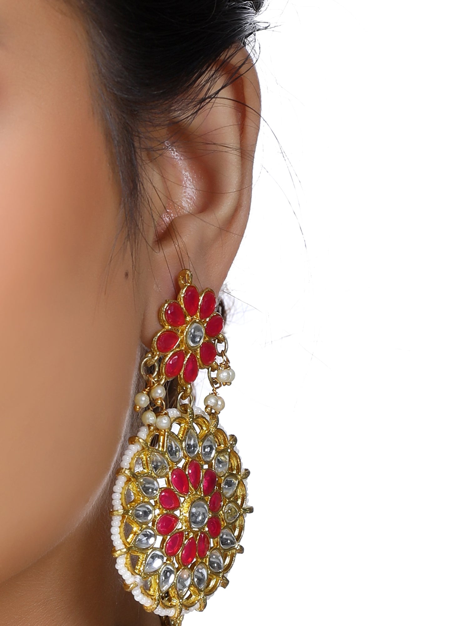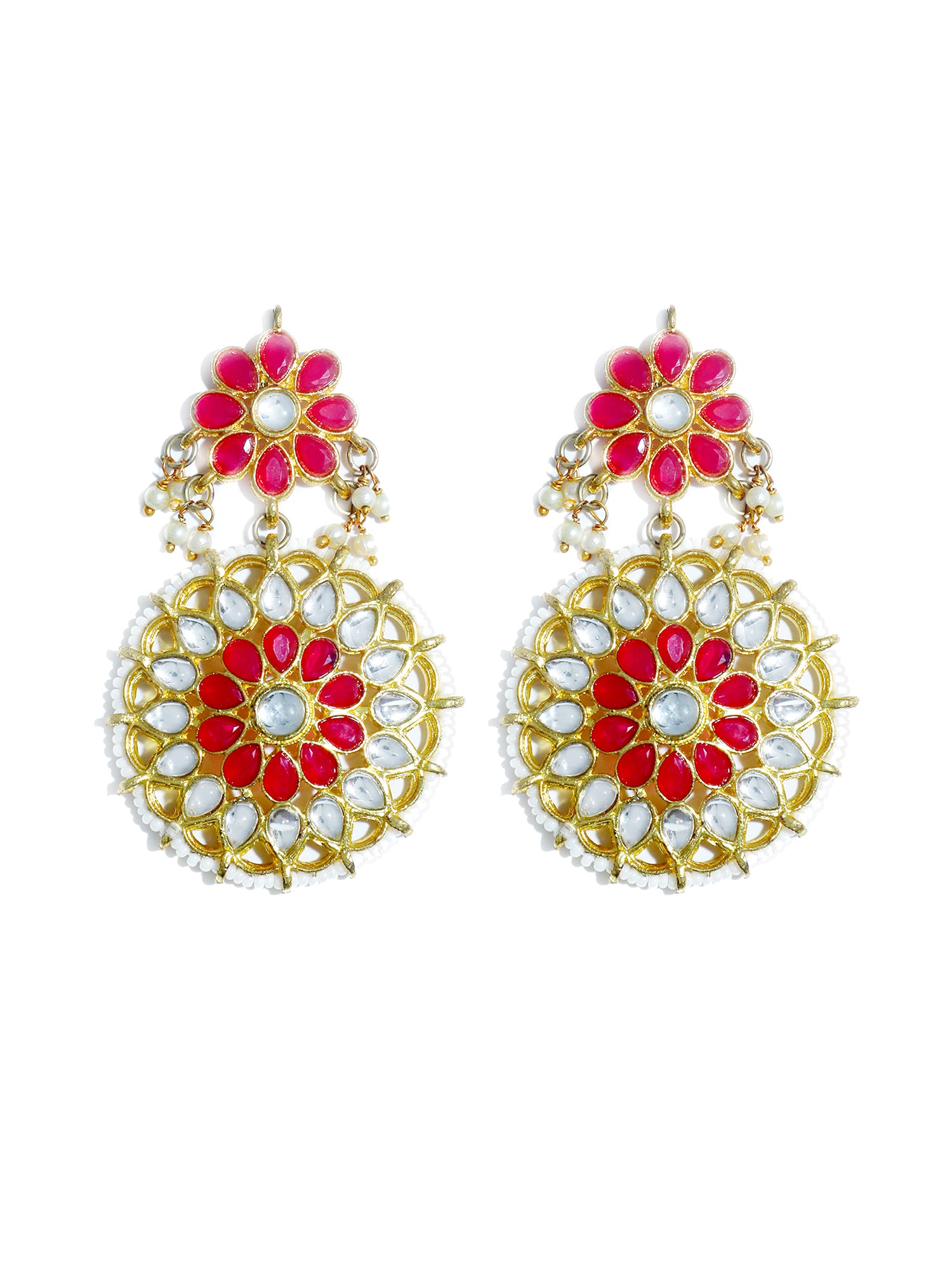 - Gold Plated Red and White Kundan Dangler Earrings for Women. It's Five Layer Micro Gold Plated and Embellished with Kundan for High Durability. Intricate high polish creates glamorous reflections and adds a luxurious look. Perfect for Weddings, Festivals, Traditional Occasions. Best when paired with any Indian outfit.