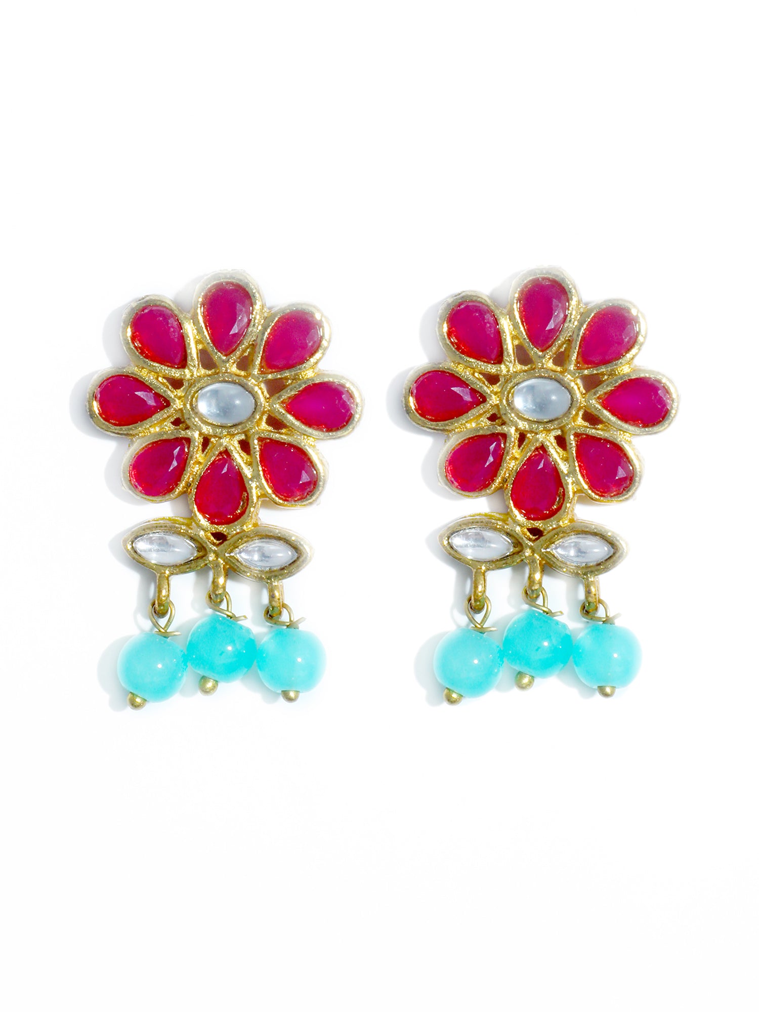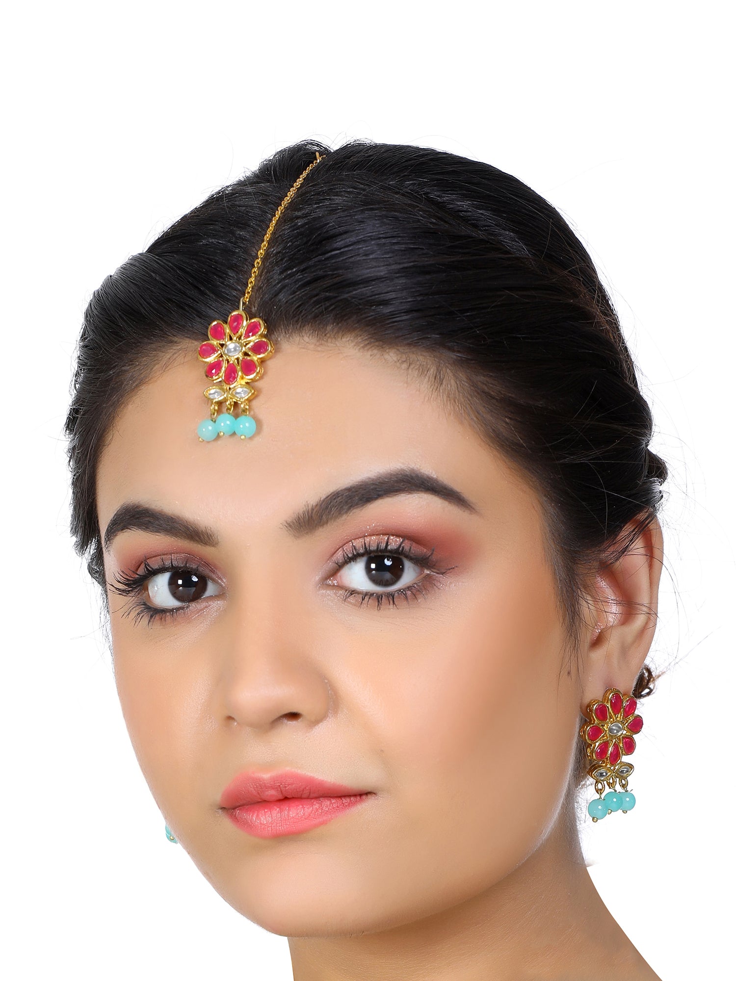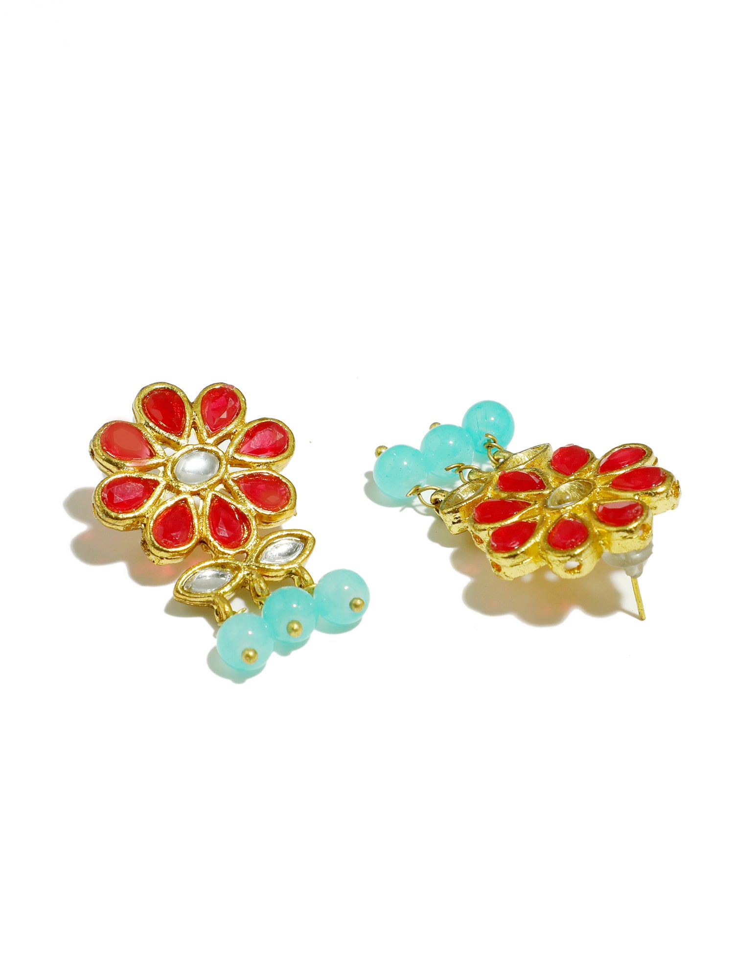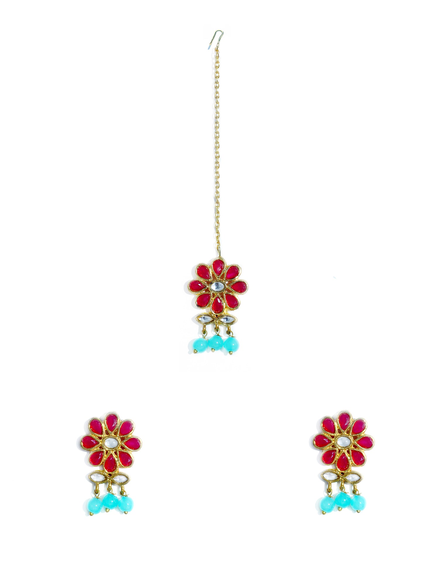 - Gold Plated Blue Beads Red Kundan Dangler Earrings with Maangtikka for Women. It's Five Layer Micro Gold Plated and Embellished with Kundan for High Durability. Intricate high polish creates glamorous reflections and adds a luxurious look. Perfect for Weddings, Festivals, Traditional Occasions. Best when paired with any Indian outfit.