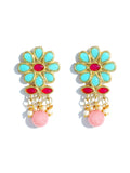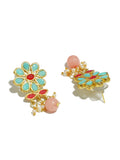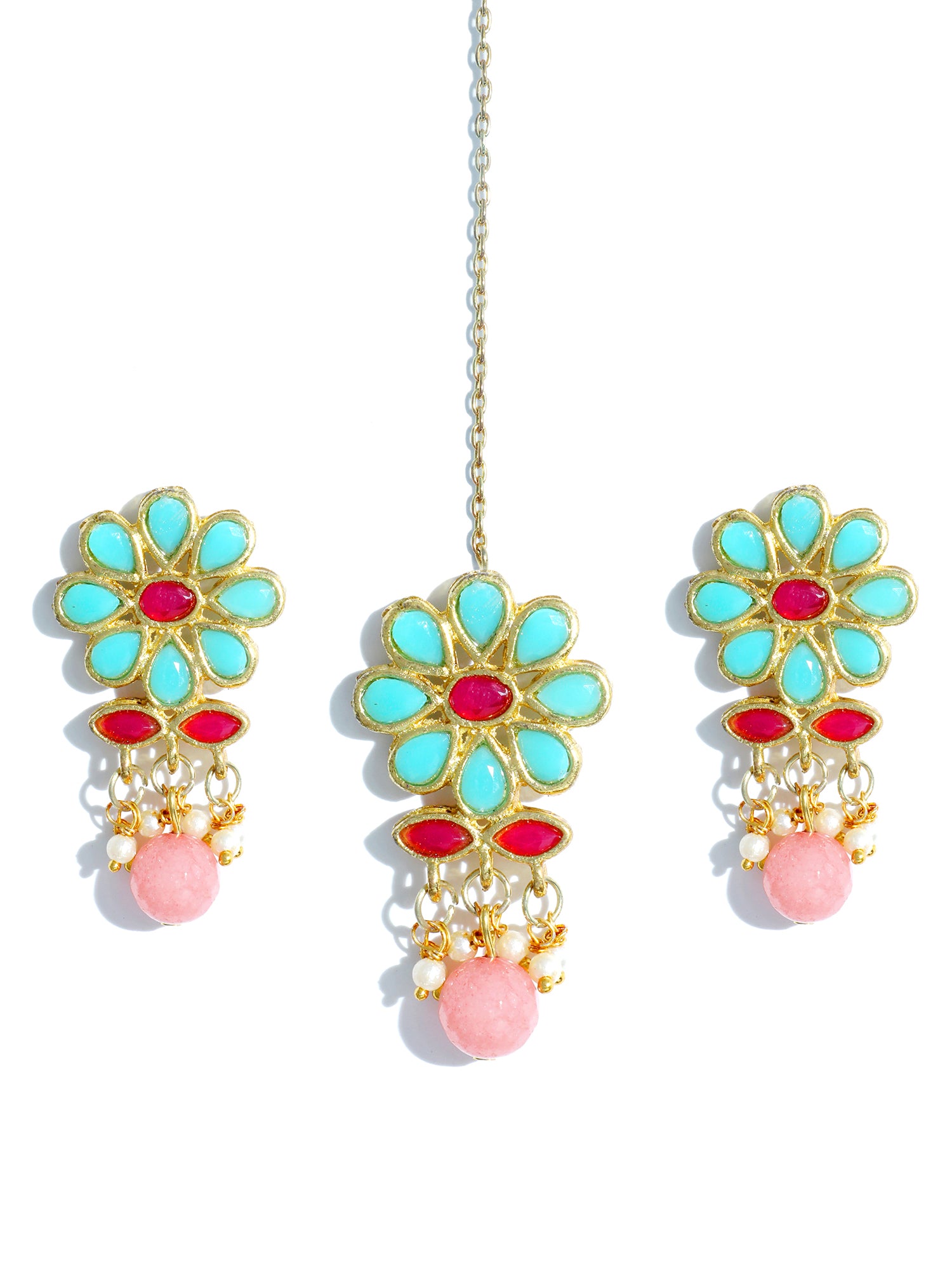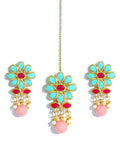 Gold Plated Peach Beads Mint Blue Kundan Dangler Earrings with Maangtikka for Women