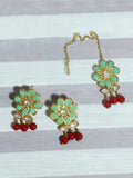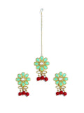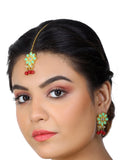 Gold Plated Red Beads Lime Green Kundan Dangler Earrings with Maangtikka for Women