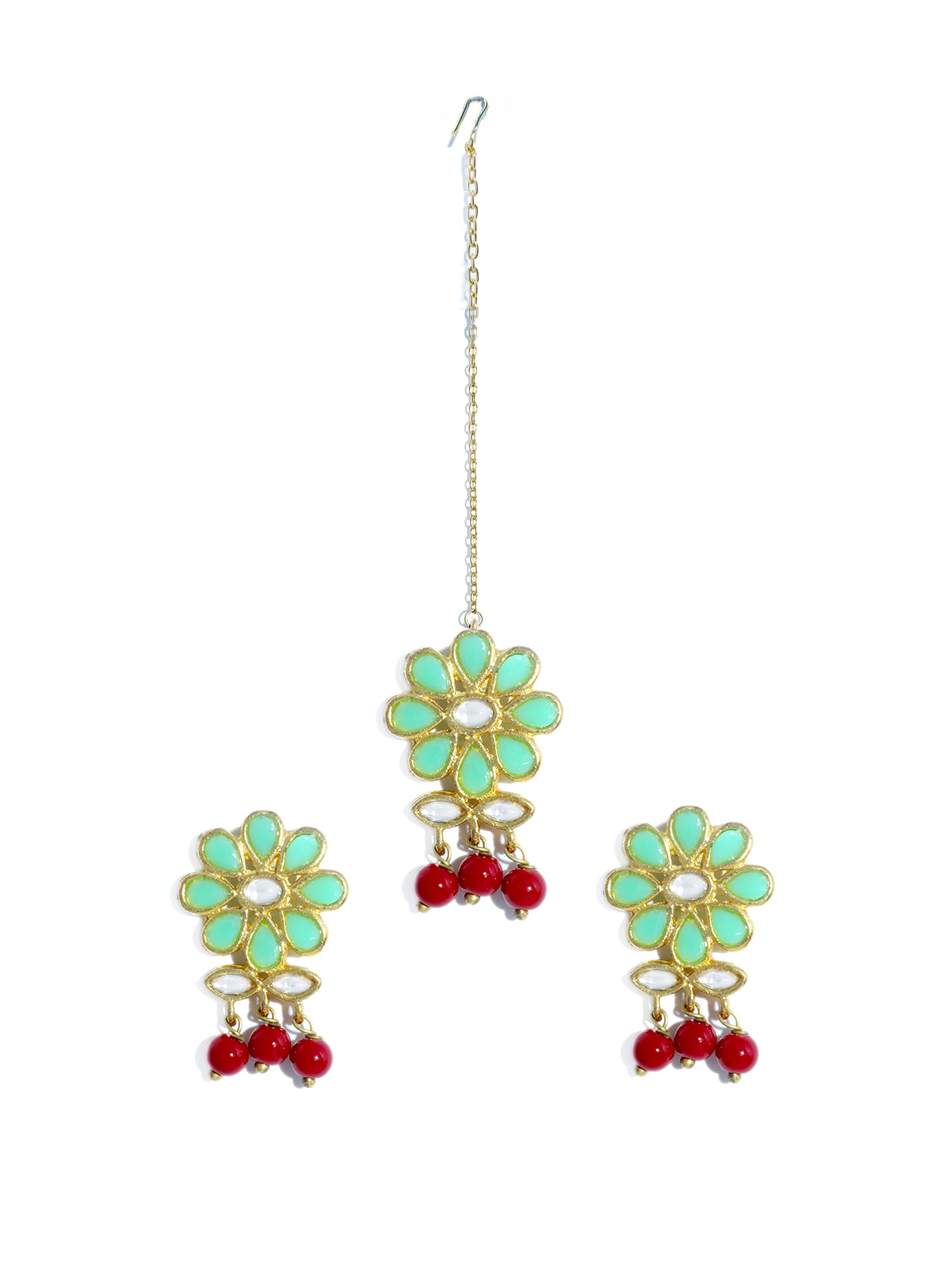 - Gold Plated Red Beads Lime Green Kundan Dangler Earrings with Maangtikka for Women. It's Five Layer Micro Gold Plated and Embellished with Kundan for High Durability. Intricate high polish creates glamorous reflections and adds a luxurious look. Perfect for Weddings, Festivals, Traditional Occasions. Best when paired with any Indian outfit.