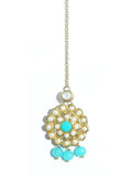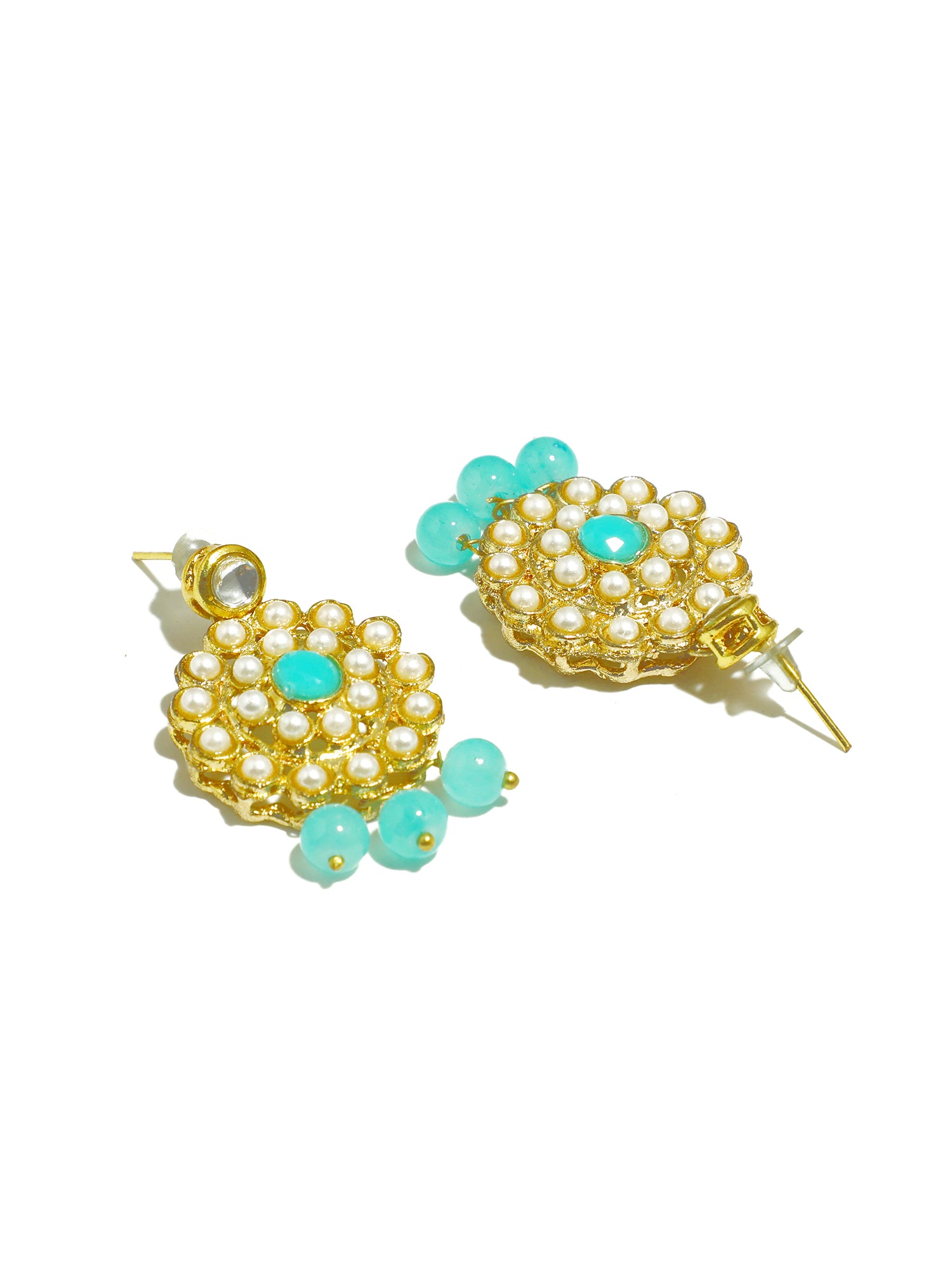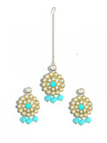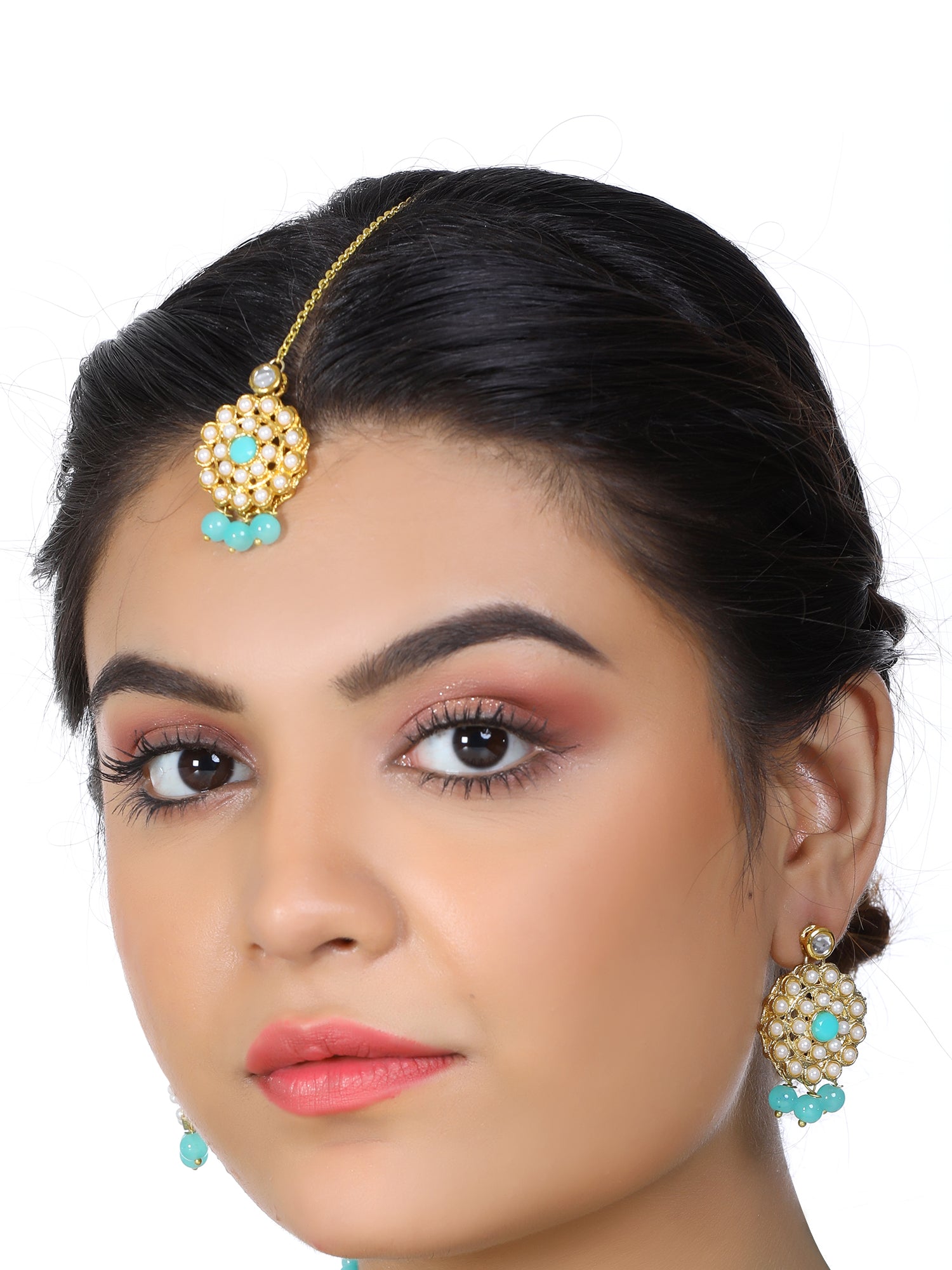 Gold Plated Mint Blue Beads Kundan Dangler Earrings with Maangtikka for Women