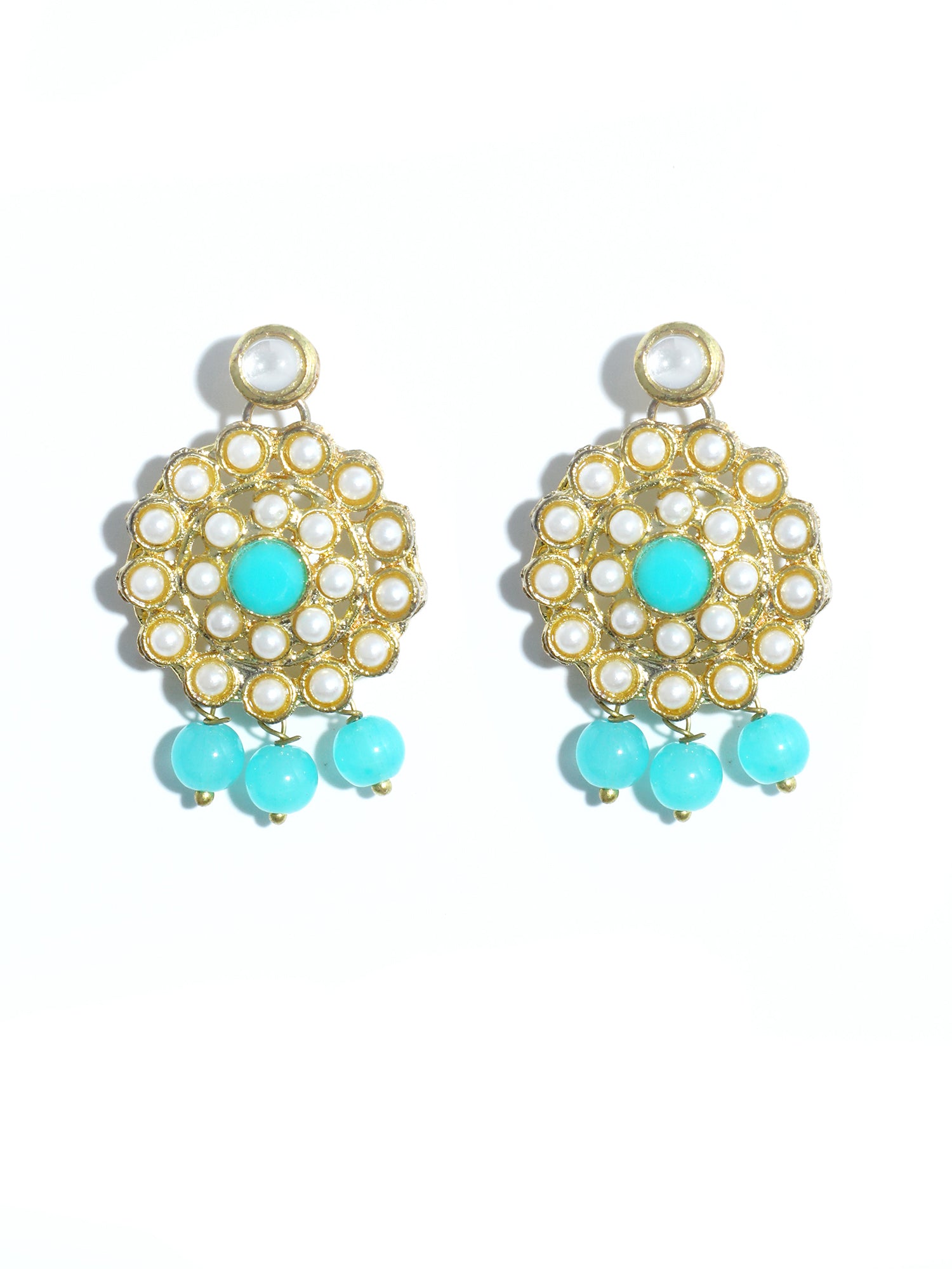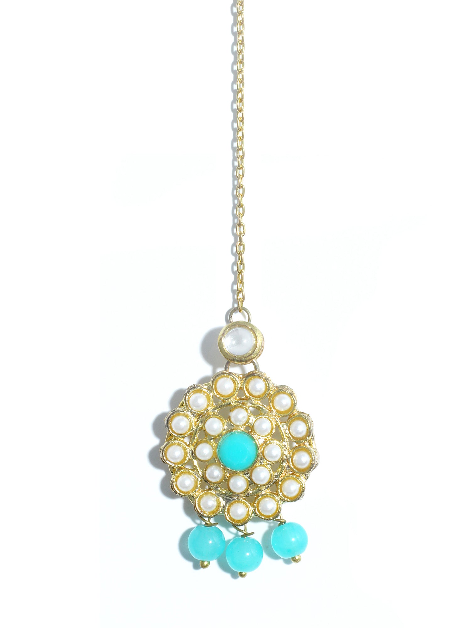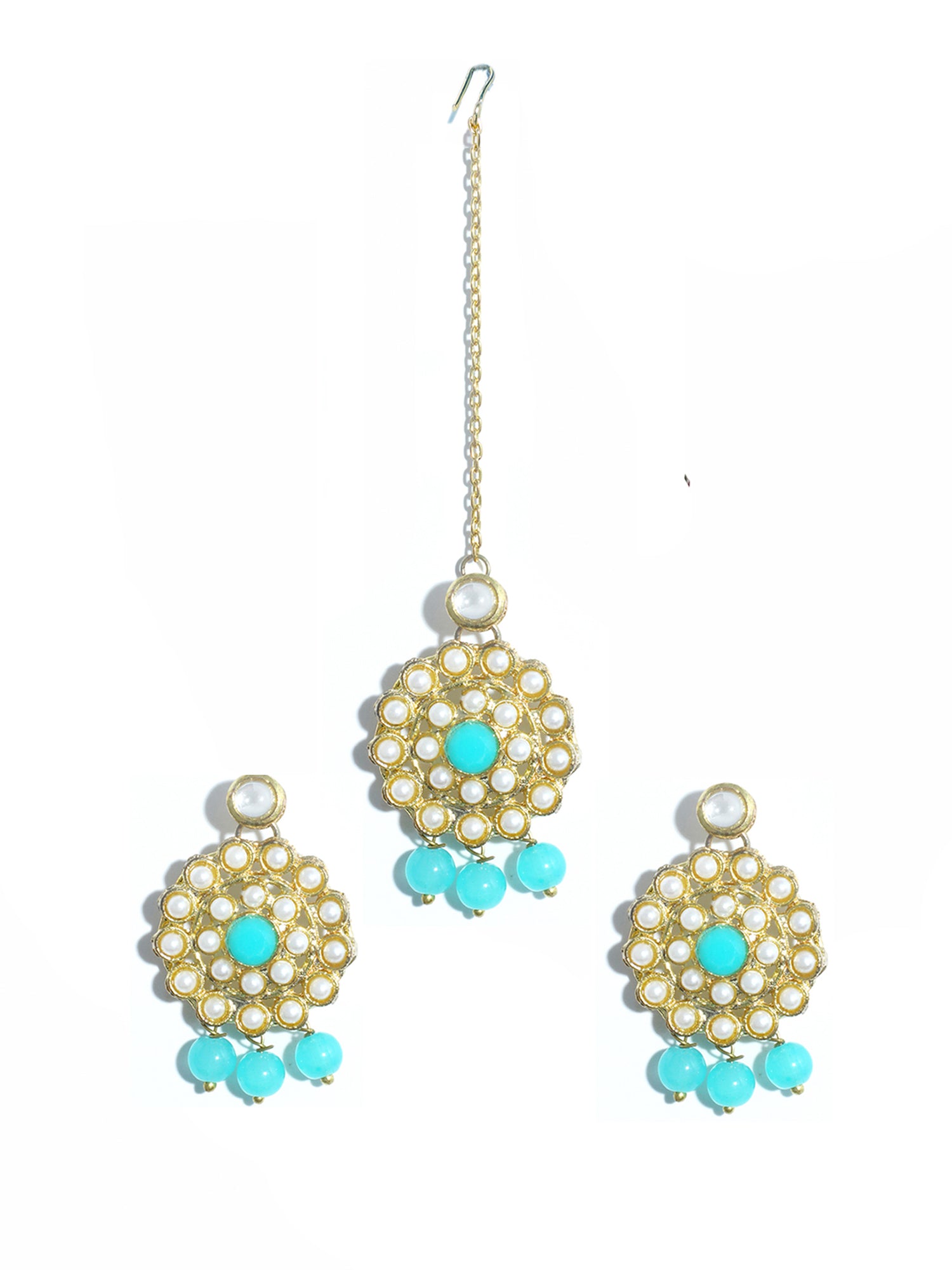 - Gold Plated Mint Blue Beads Kundan Dangler Earrings with Maangtikka for Women. It's Five Layer Micro Gold Plated and Embellished with Kundan for High Durability. Intricate high polish creates glamorous reflections and adds a luxurious look. Perfect for Weddings, Festivals, Traditional Occasions. Best when paired with any Indian outfit.