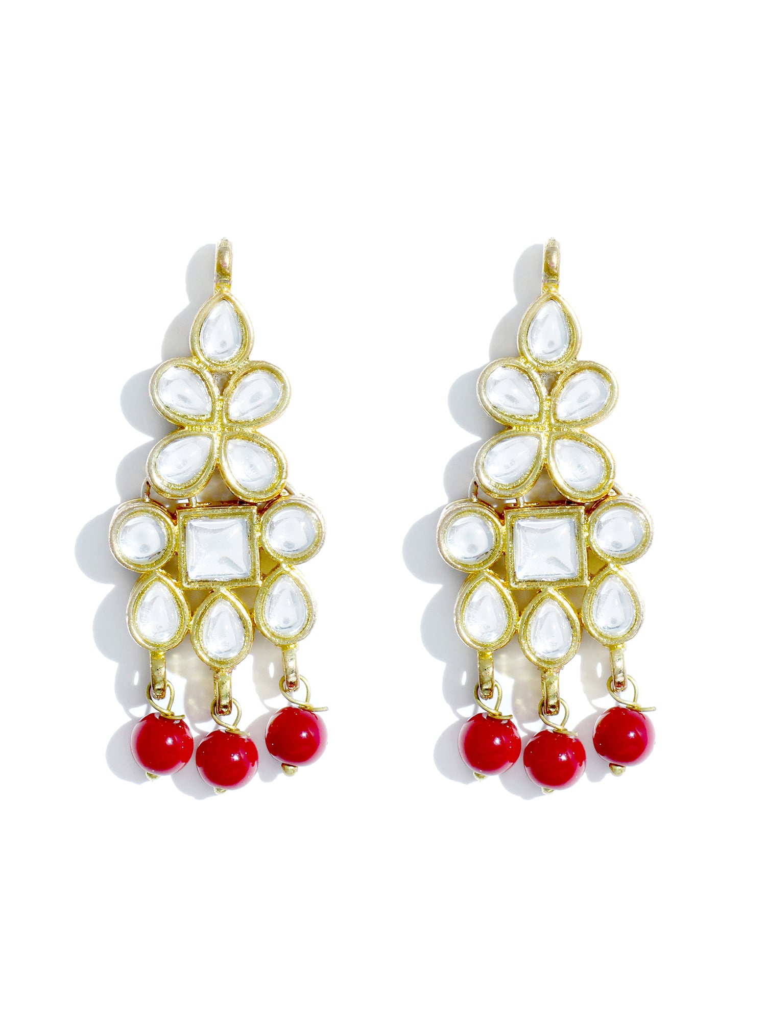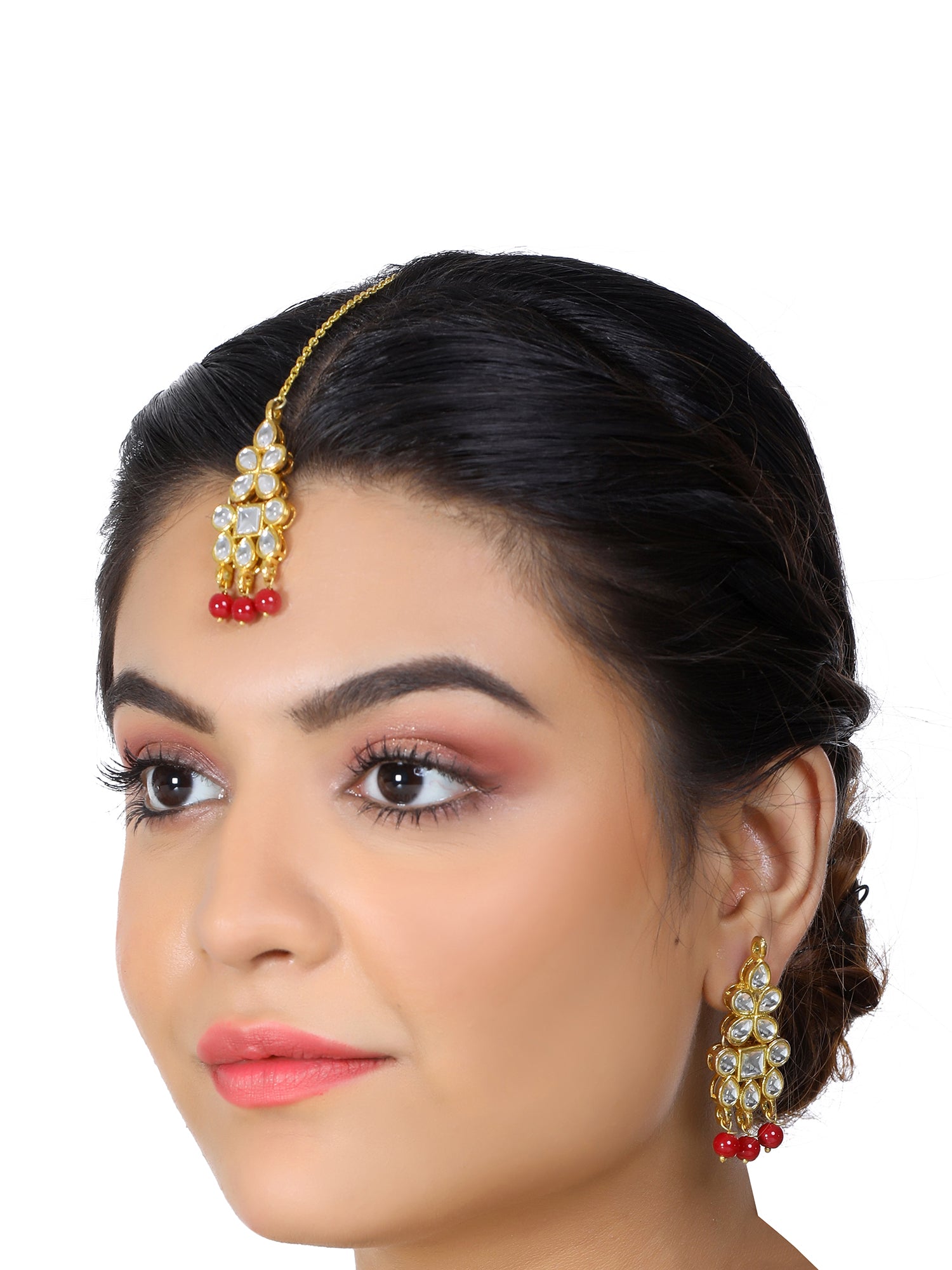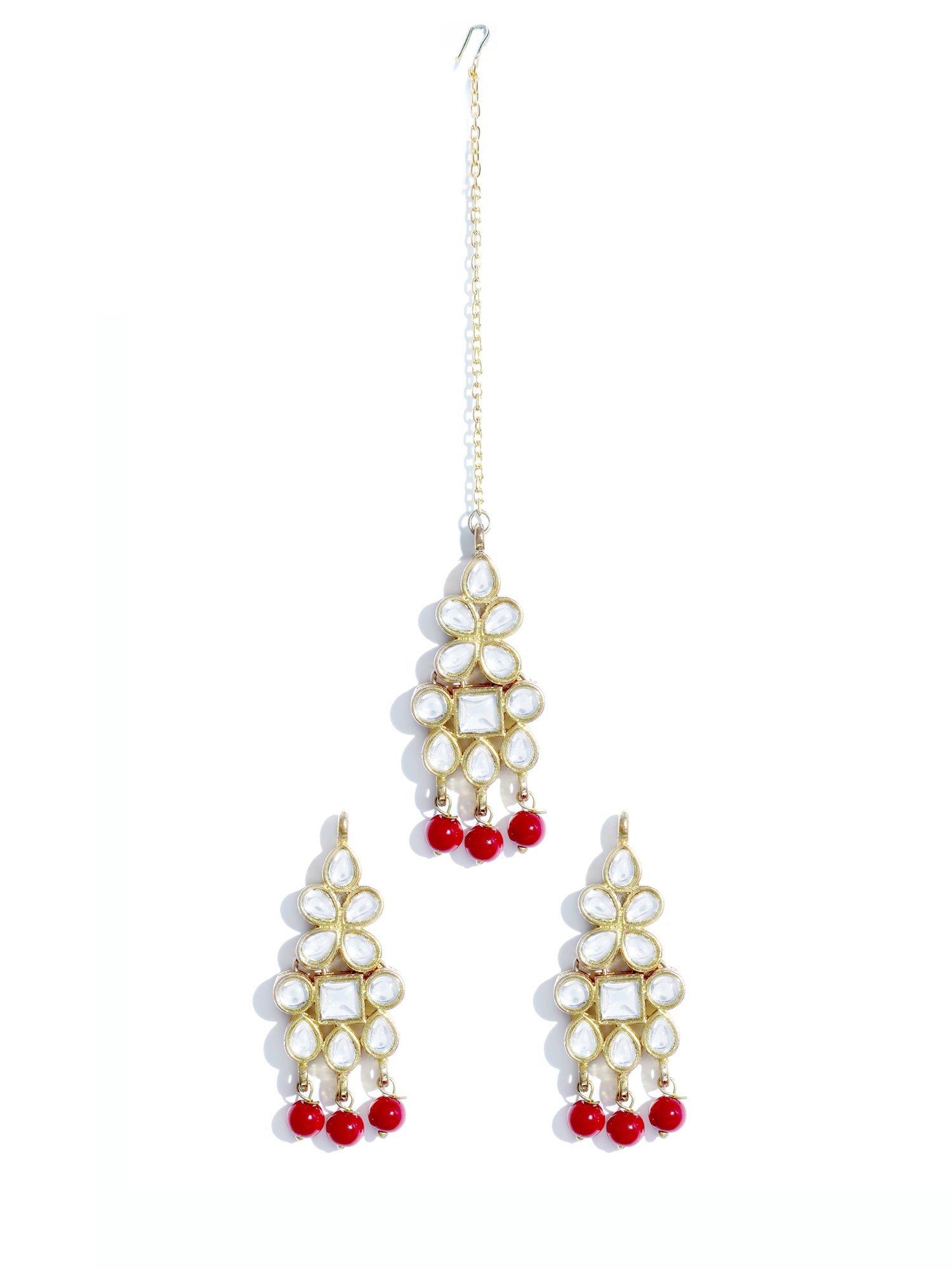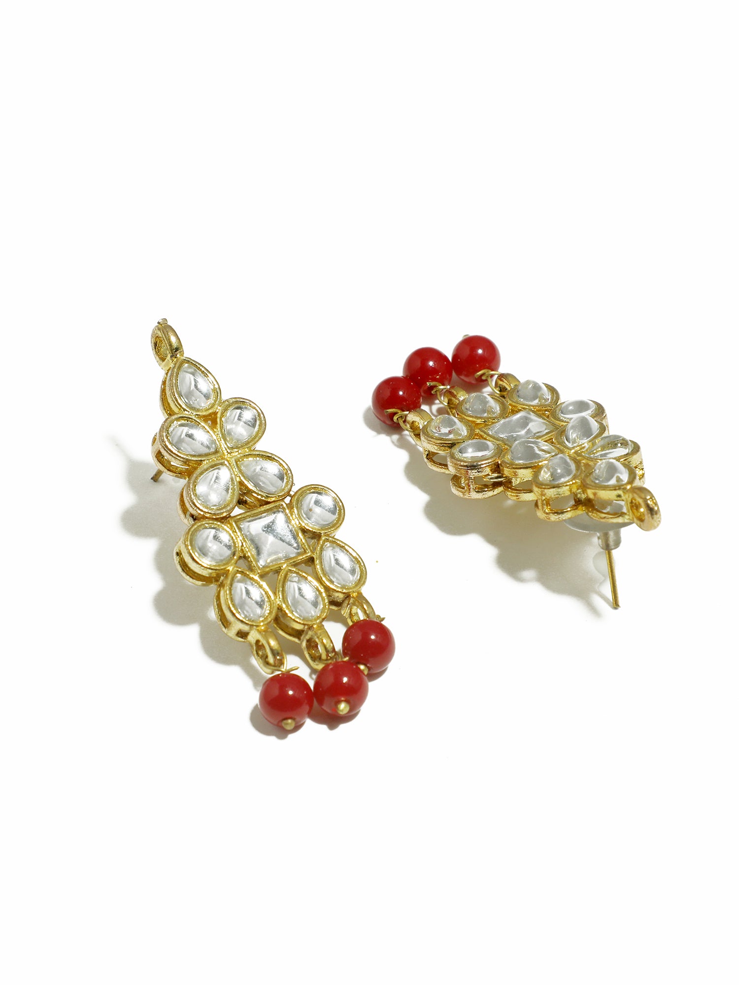 - Gold Plated Red Beads Kundan Dangler Earrings with Maangtikka for Women. It's Five Layer Micro Gold Plated and Embellished with Kundan for High Durability. Intricate high polish creates glamorous reflections and adds a luxurious look. Perfect for Weddings, Festivals, Traditional Occasions. Best when paired with any Indian outfit.