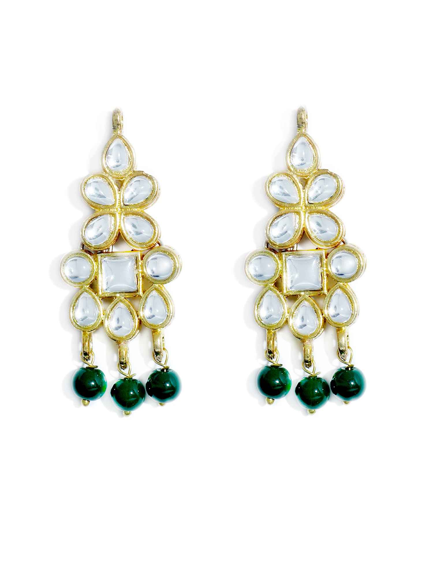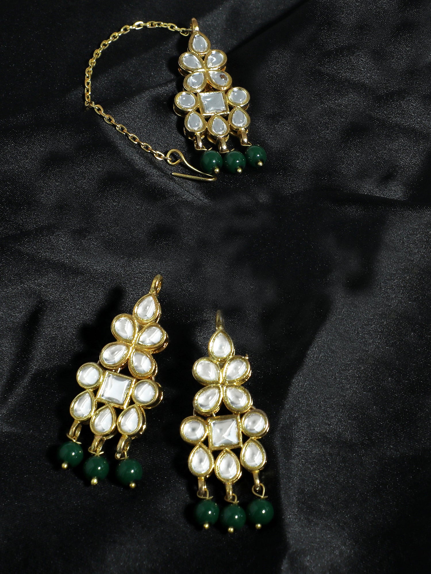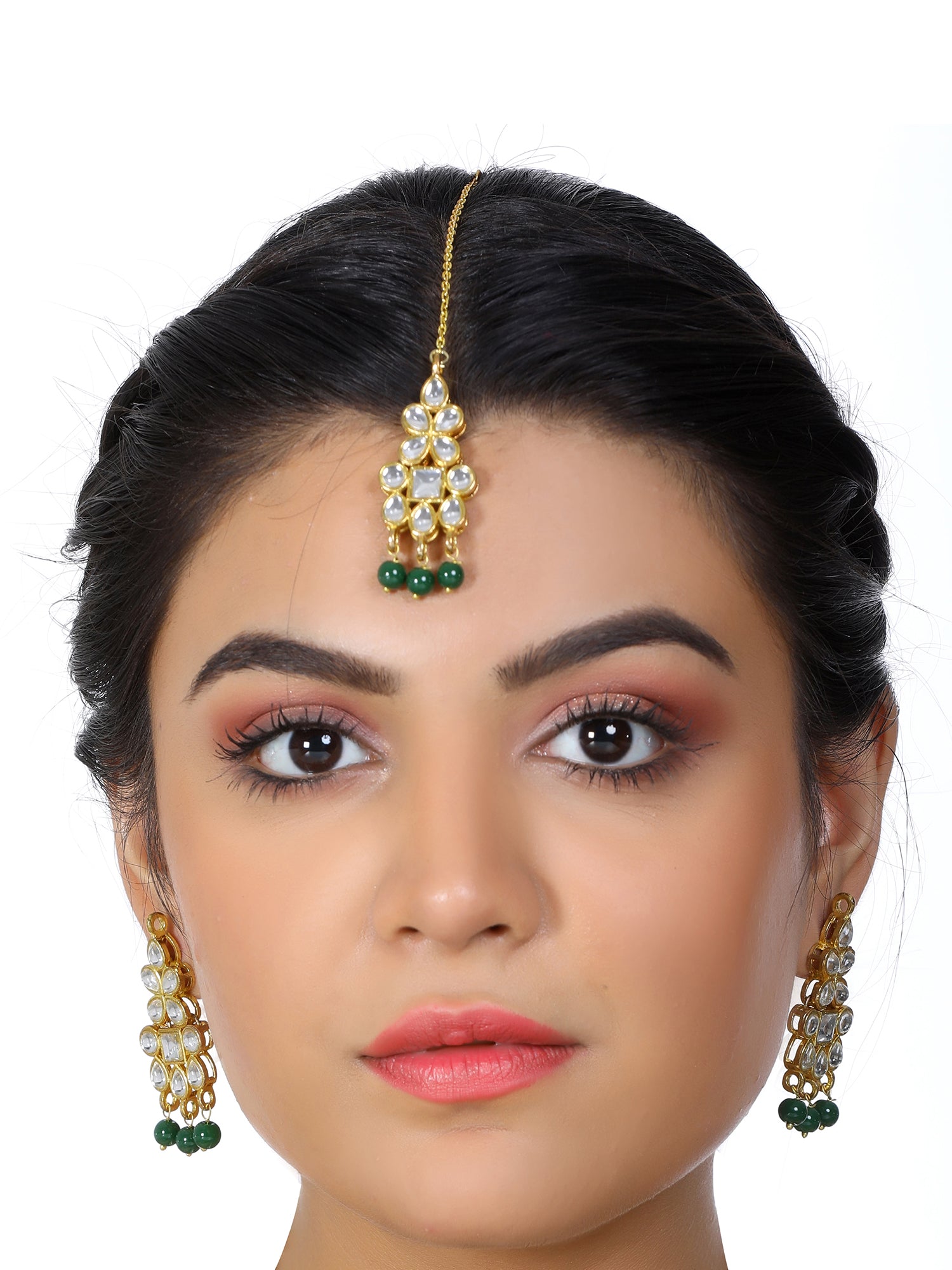 - Gold Plated Green Beads Kundan Dangler Earrings with Maangtikka for Women. It's Five Layer Micro Gold Plated and Embellished with Kundan for High Durability. Intricate high polish creates glamorous reflections and adds a luxurious look. Perfect for Weddings, Festivals, Traditional Occasions. Best when paired with any Indian outfit.