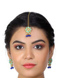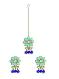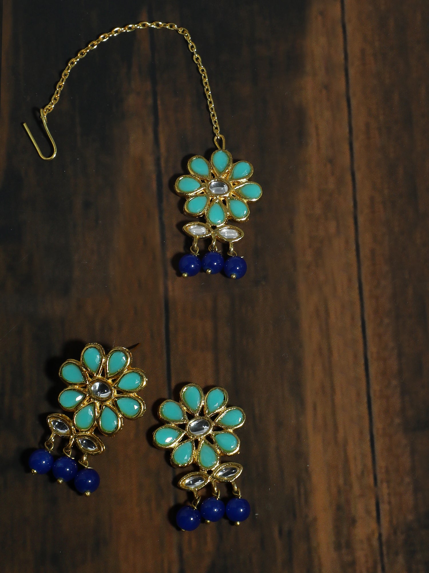 Gold Plated Blue Beads Mint Blue Kundan Dangler Earrings with Maangtikka for Women