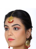 Gold Plated Red Beads Kundan Dangler Earrings with Maangtikka for Women