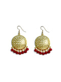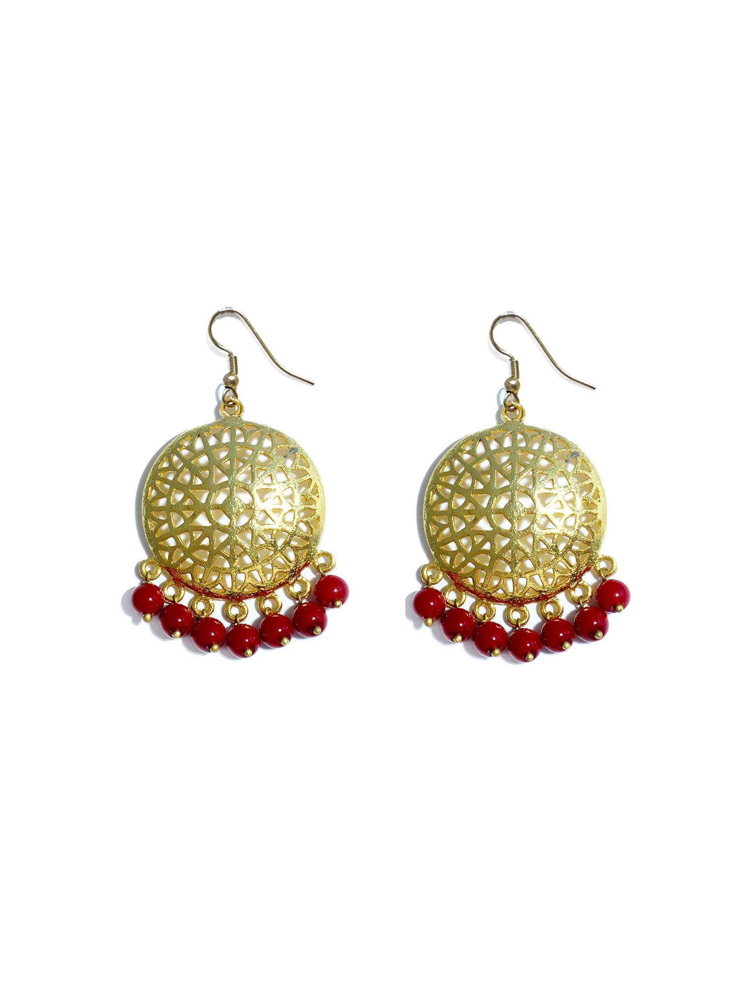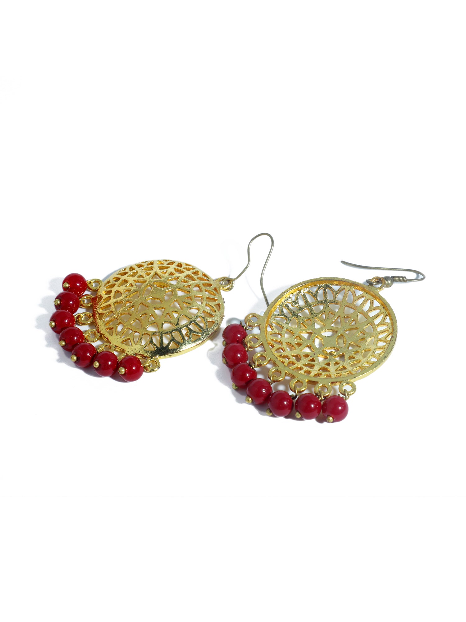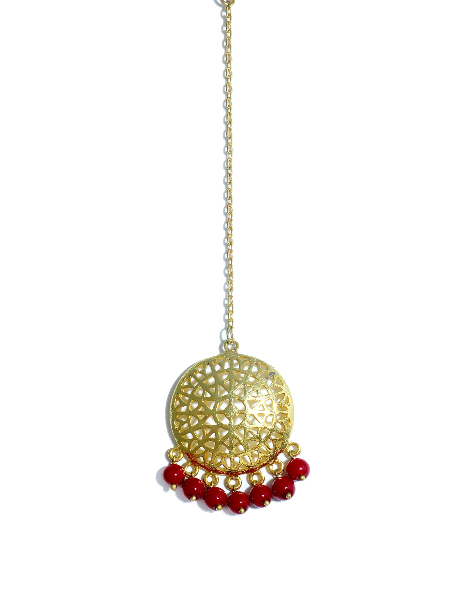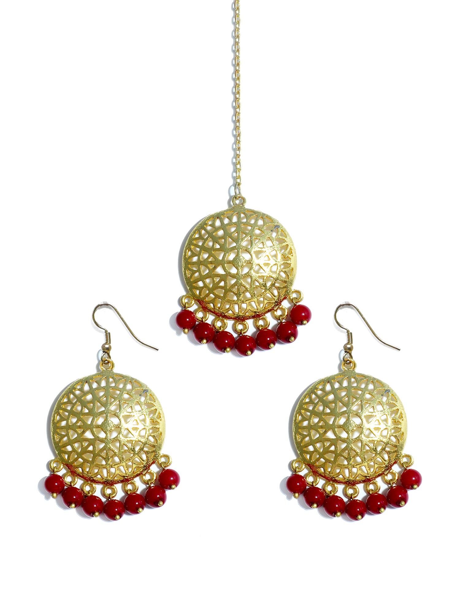- Gold Plated Red Beads Kundan Dangler Earrings with Maangtikka for Women. It's Five Layer Micro Gold Plated and Embellished with Kundan for High Durability. Intricate high polish creates glamorous reflections and adds a luxurious look. Perfect for Weddings, Festivals, Traditional Occasions. Best when paired with any Indian outfit.