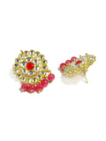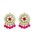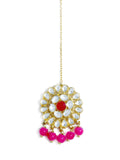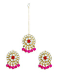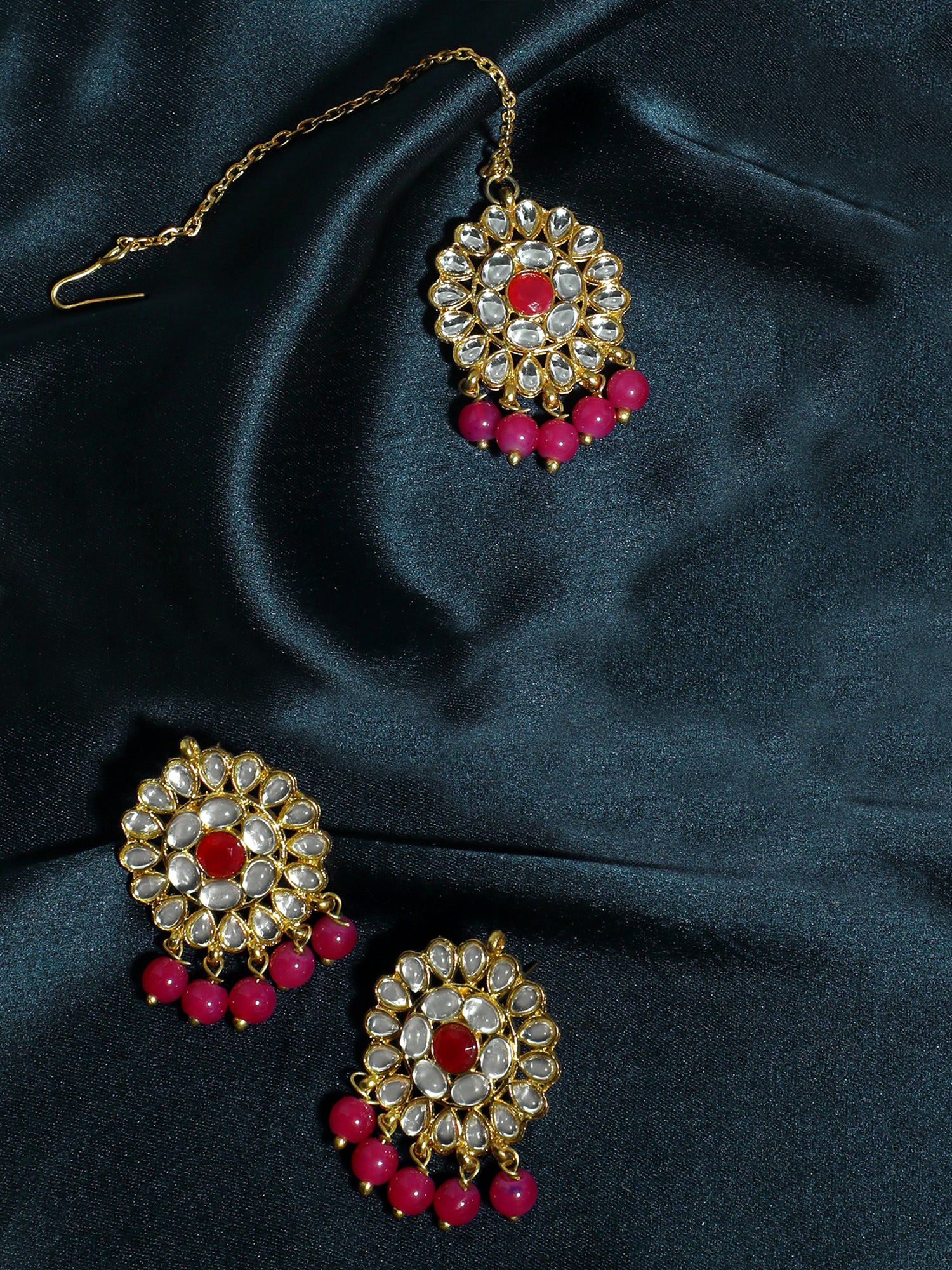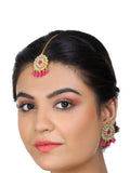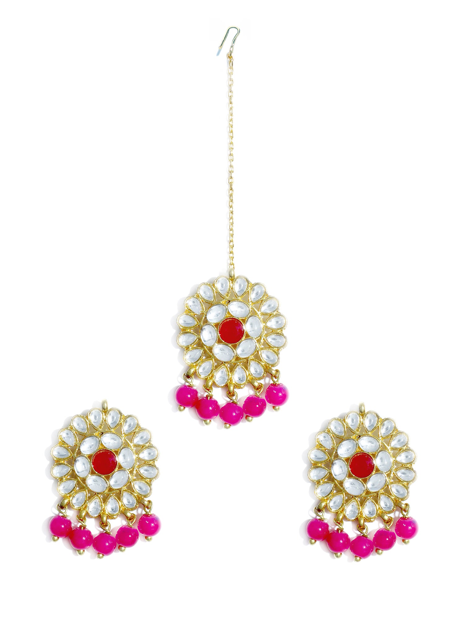 Gold Plated Pink Beads Kundan Dangler Earrings with Maangtikka for Women