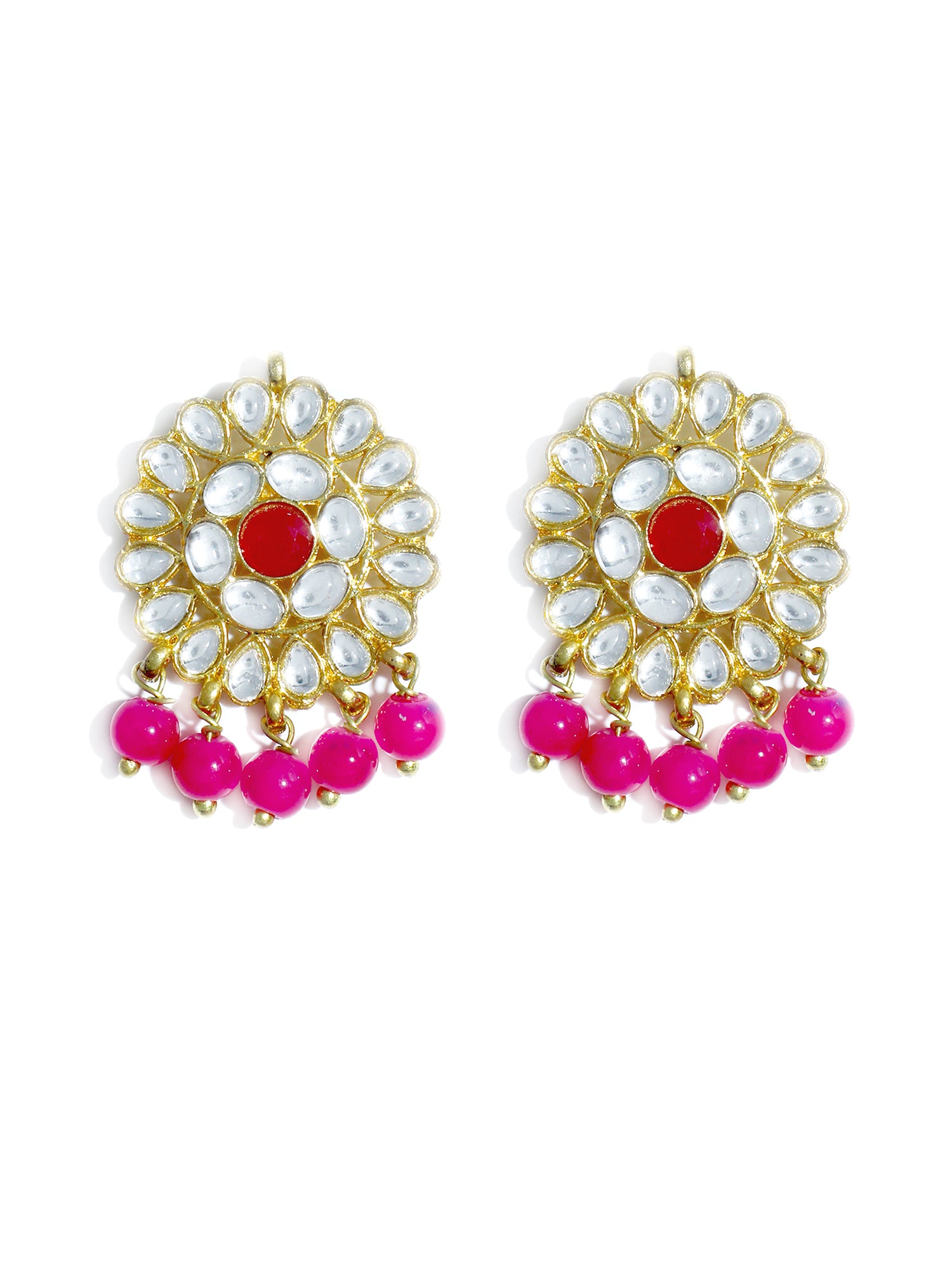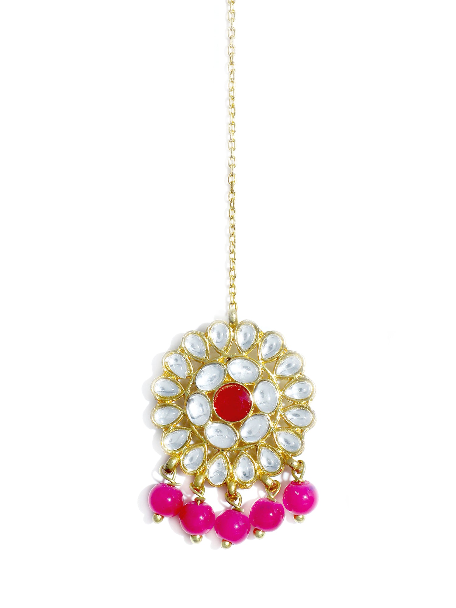 - Gold Plated Pink Beads Kundan Dangler Earrings with Maangtikka for Women. It's Five Layer Micro Gold Plated and Embellished with Kundan for High Durability. Intricate high polish creates glamorous reflections and adds a luxurious look. Perfect for Weddings, Festivals, Traditional Occasions. Best when paired with any Indian outfit.