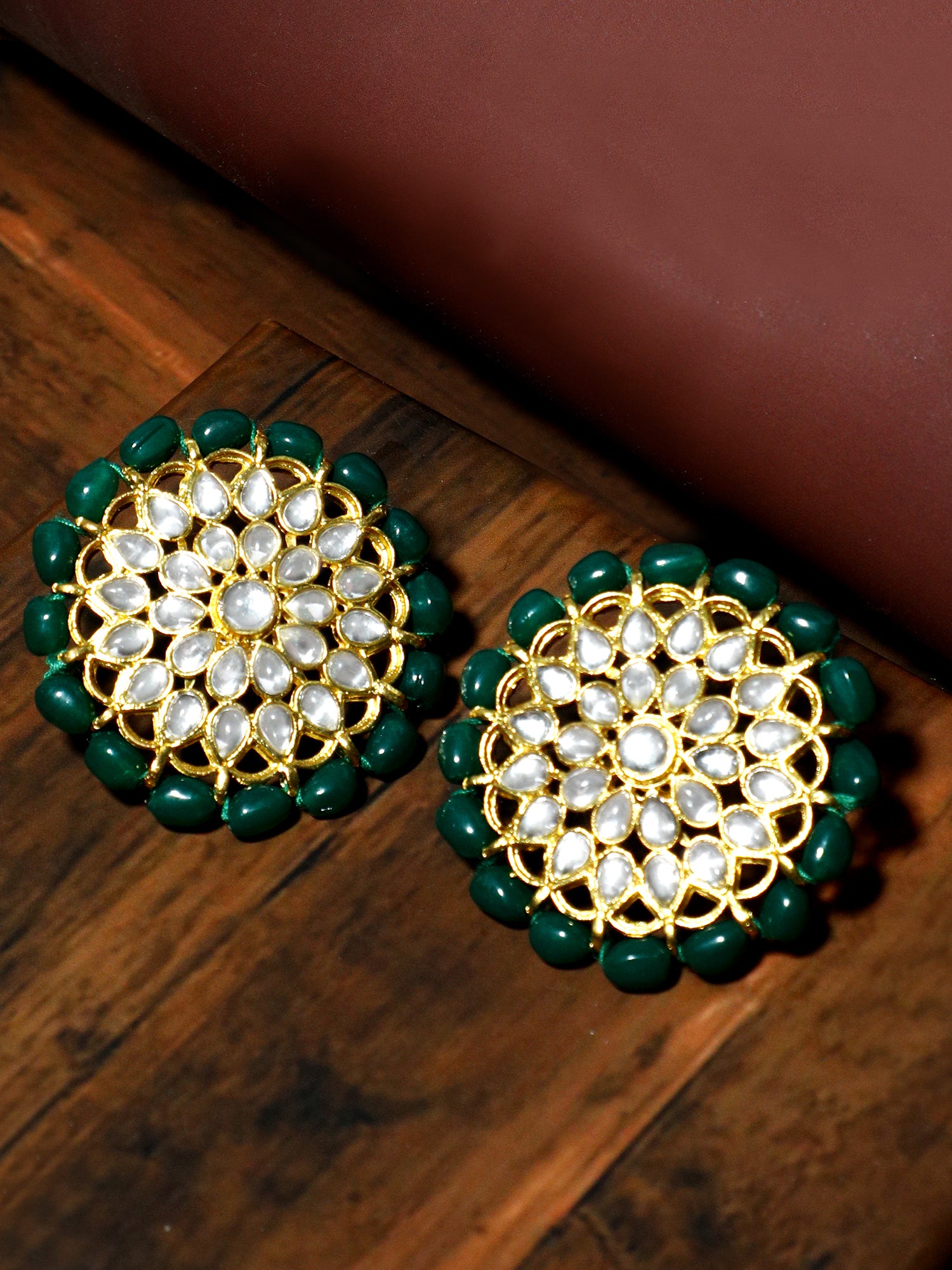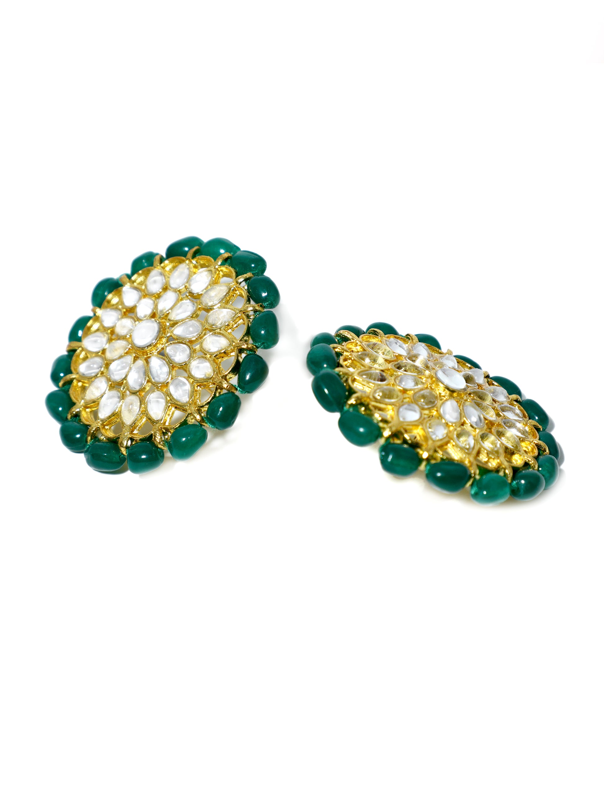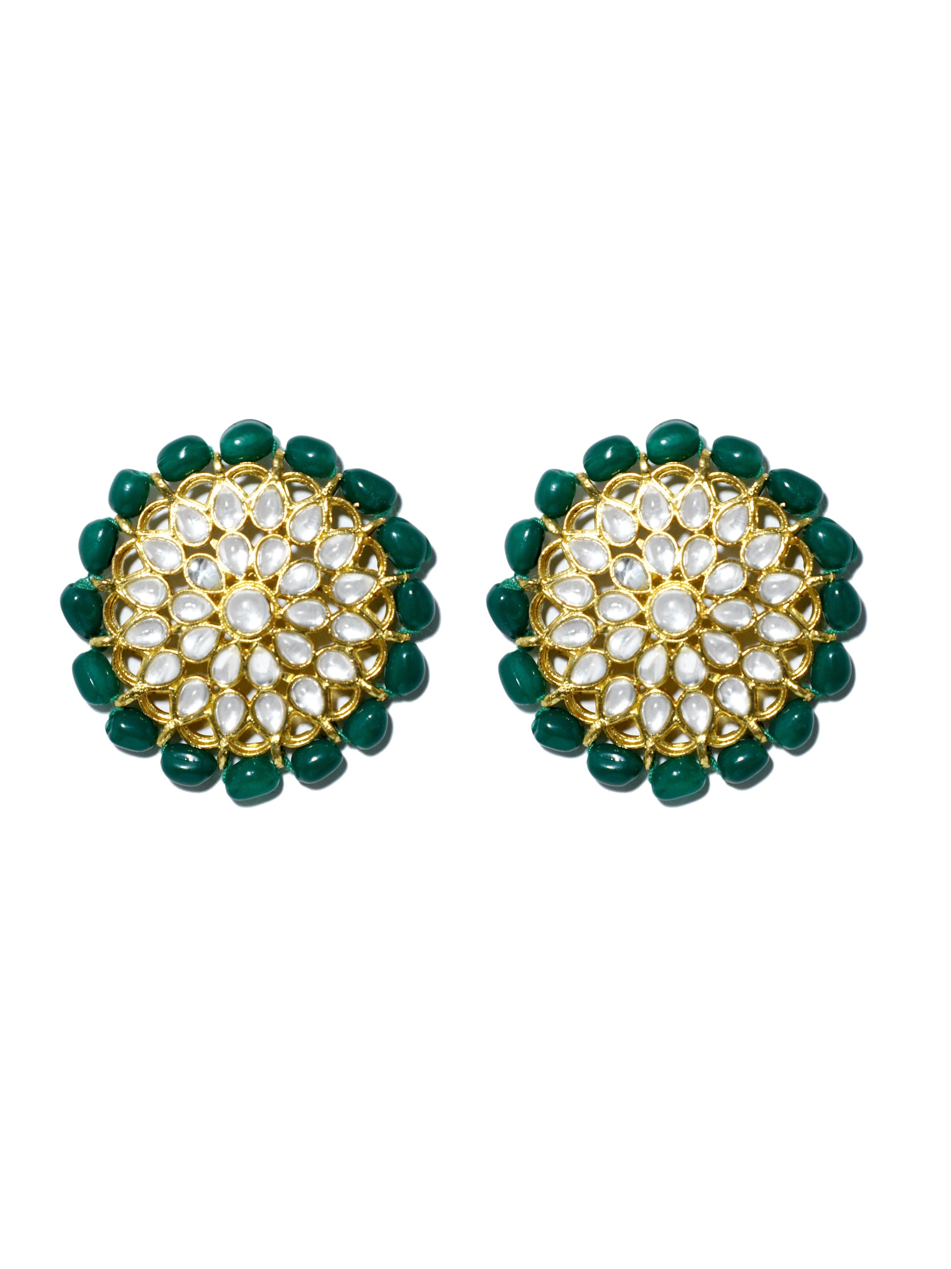 - Gold Plated Green Beads Kundan Stud Earrings. It's Five Layer Micro Gold Plated and Embellished with Kundan for High Durability. Intricate high polish creates glamorous reflections and adds a luxurious look. Perfect for Weddings, Festivals, Traditional Occasions. Best when paired with any Indian or Indo Western Attire.