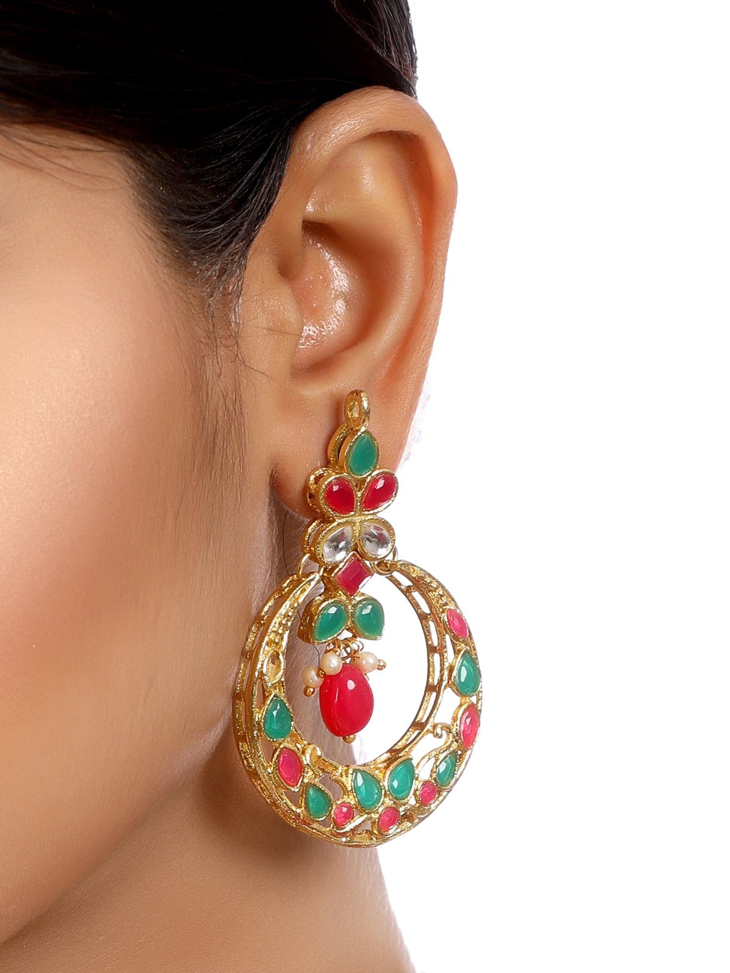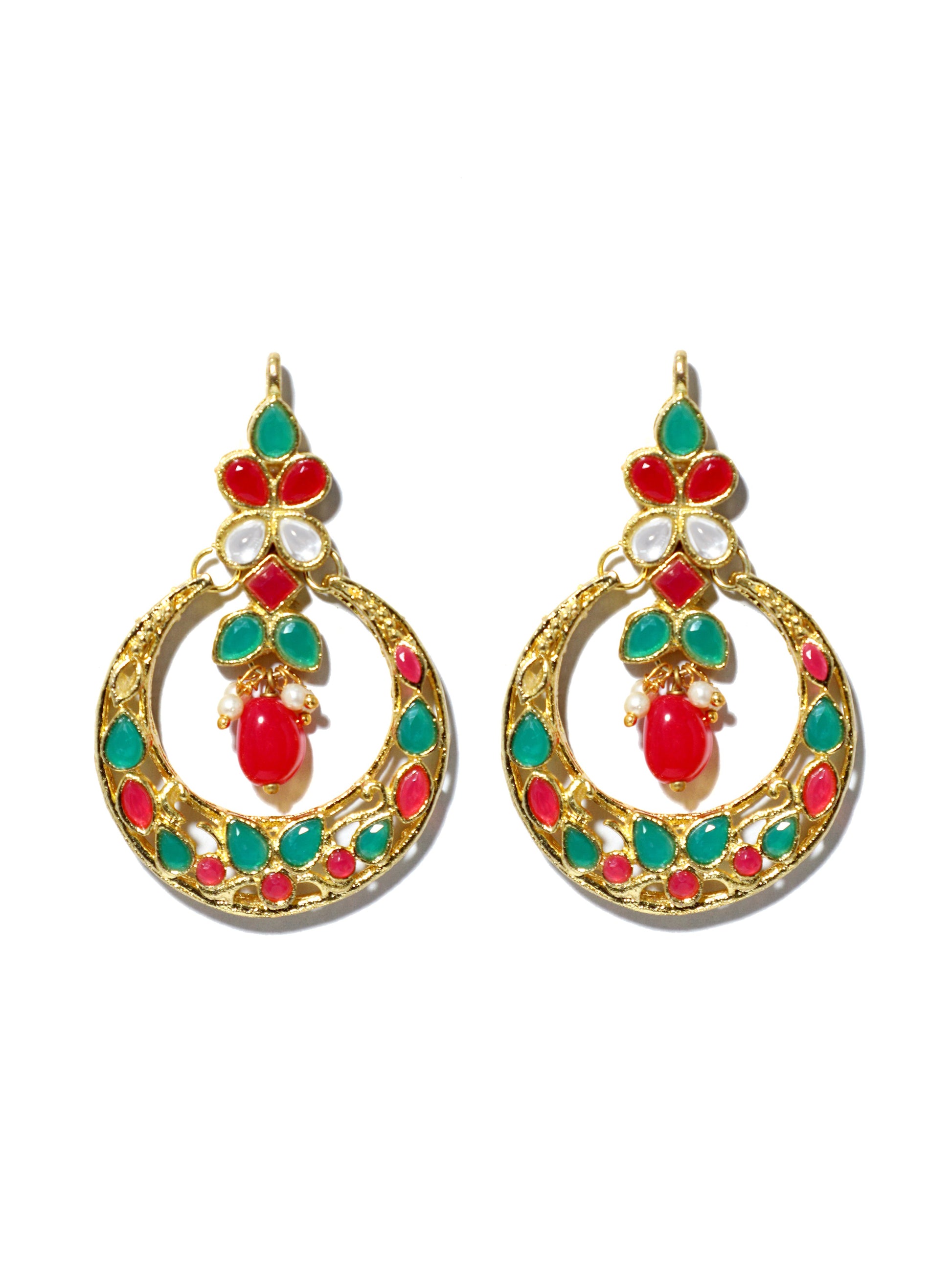 - Gold Plated Red and Green Kundan Chnadbali Earrings. It's Five Layer Micro Gold Plated and Embellished with Kundan for High Durability. Intricate high polish creates glamorous reflections and adds a luxurious look. Perfect for Weddings, Festivals, Traditional Occasions. Best when paired with any Indian or Indo Western Attire.
