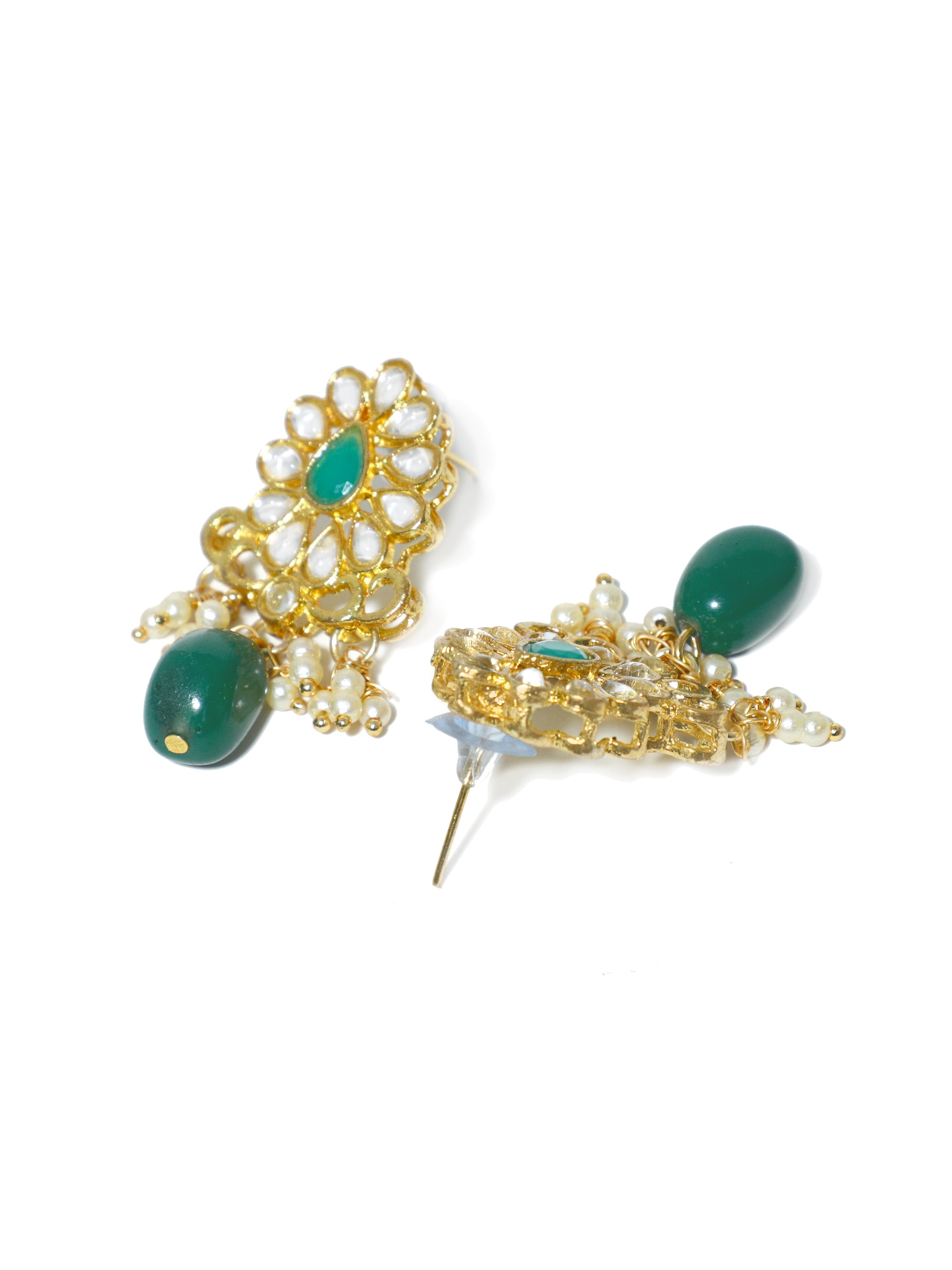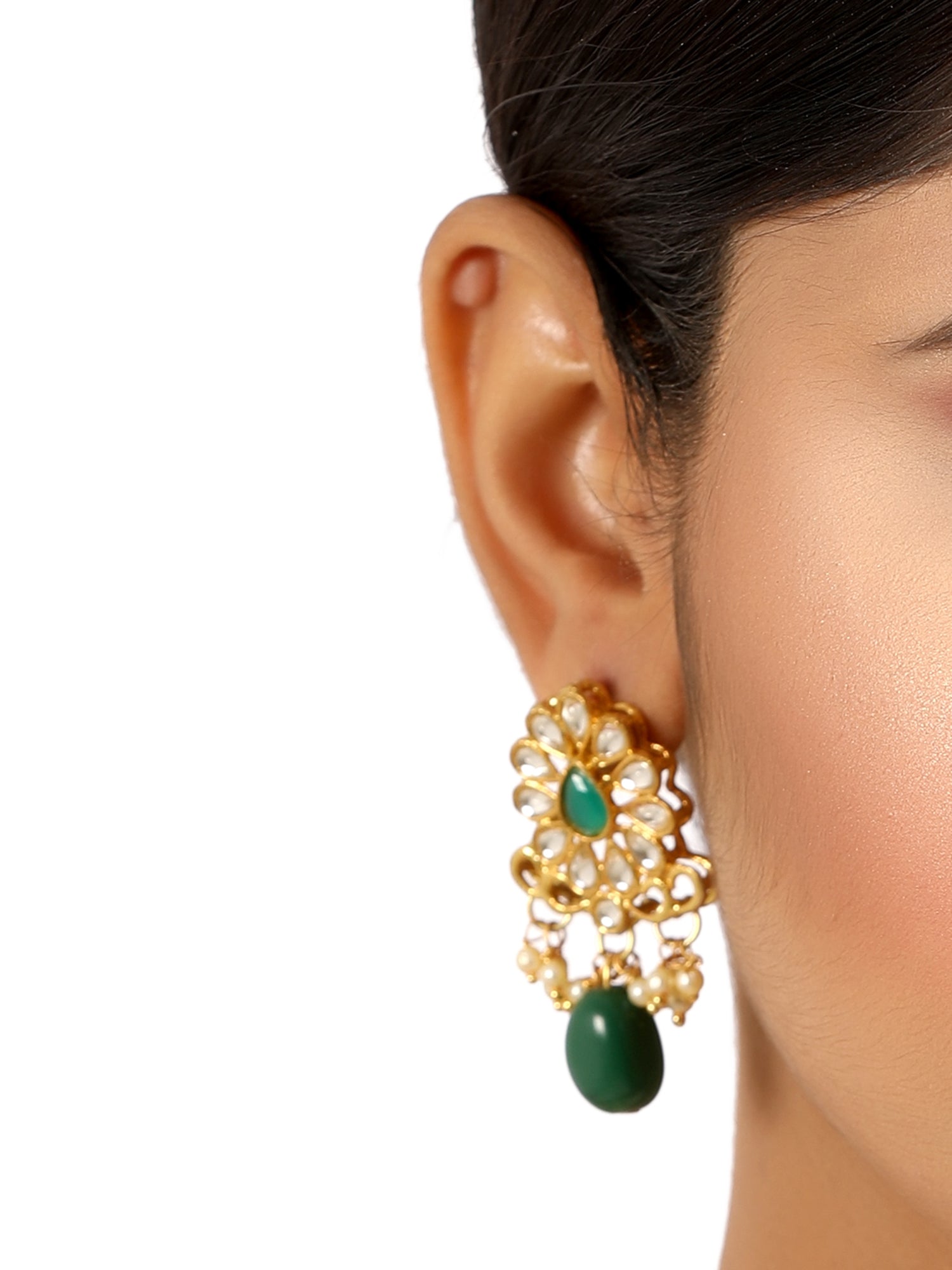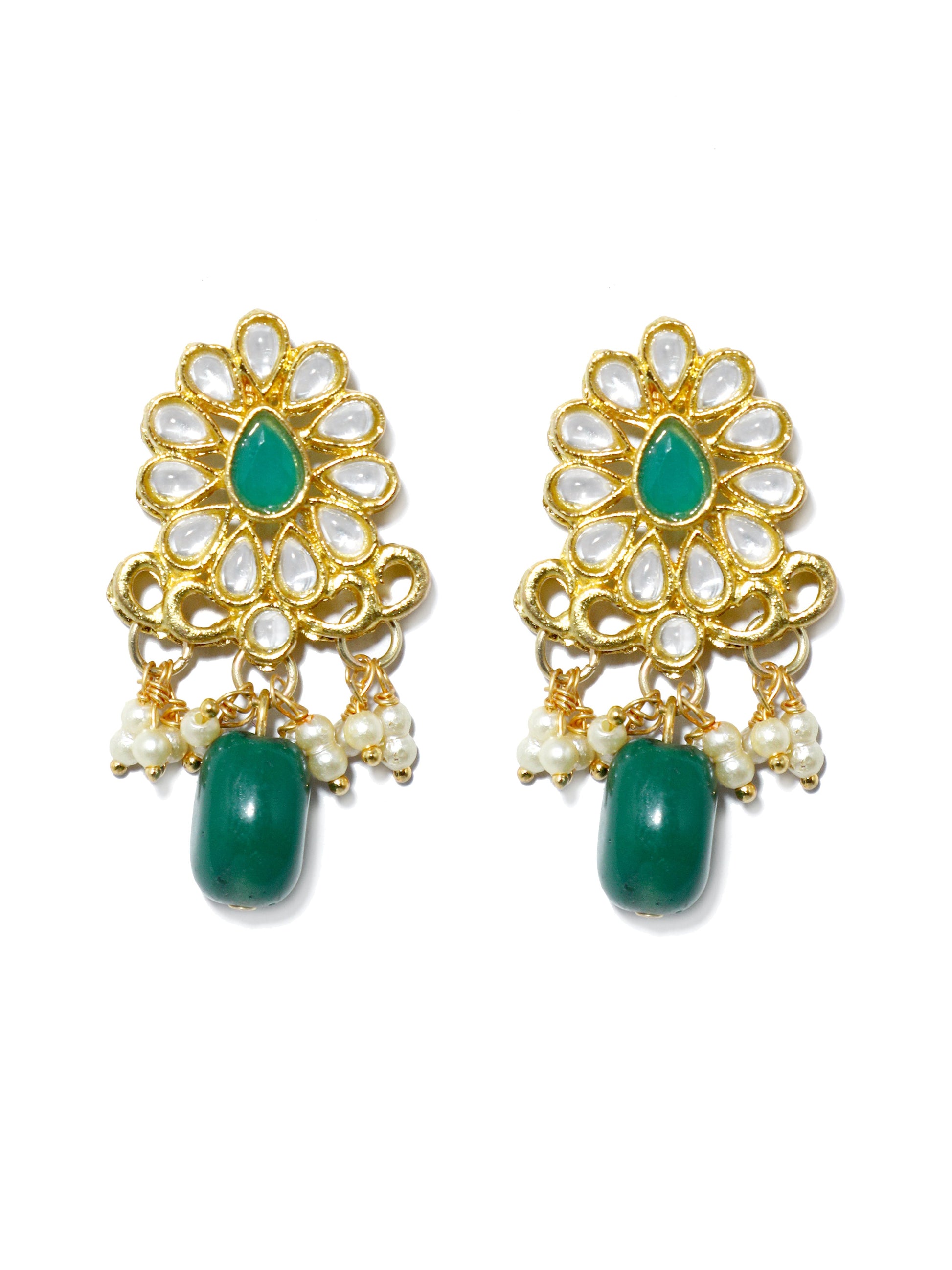 - Gold Plated Green Bead Kundan Earrings. It's Five Layer Micro Gold Plated and Embellished with Kundan for High Durability. Intricate high polish creates glamorous reflections and adds a luxurious look. Perfect for Weddings, Festivals, Traditional Occasions. Best when paired with any Indian or Indo Western Attire.
