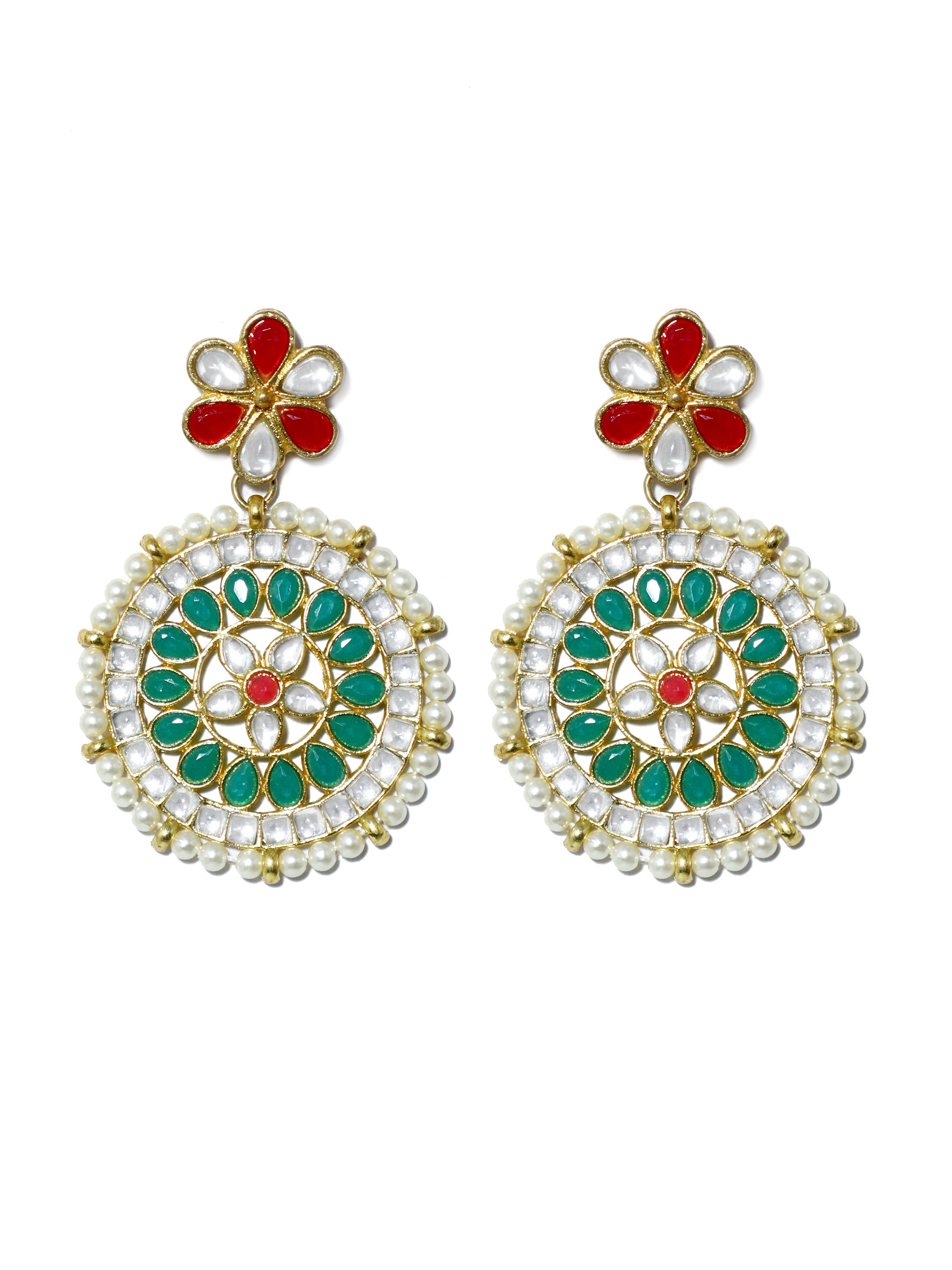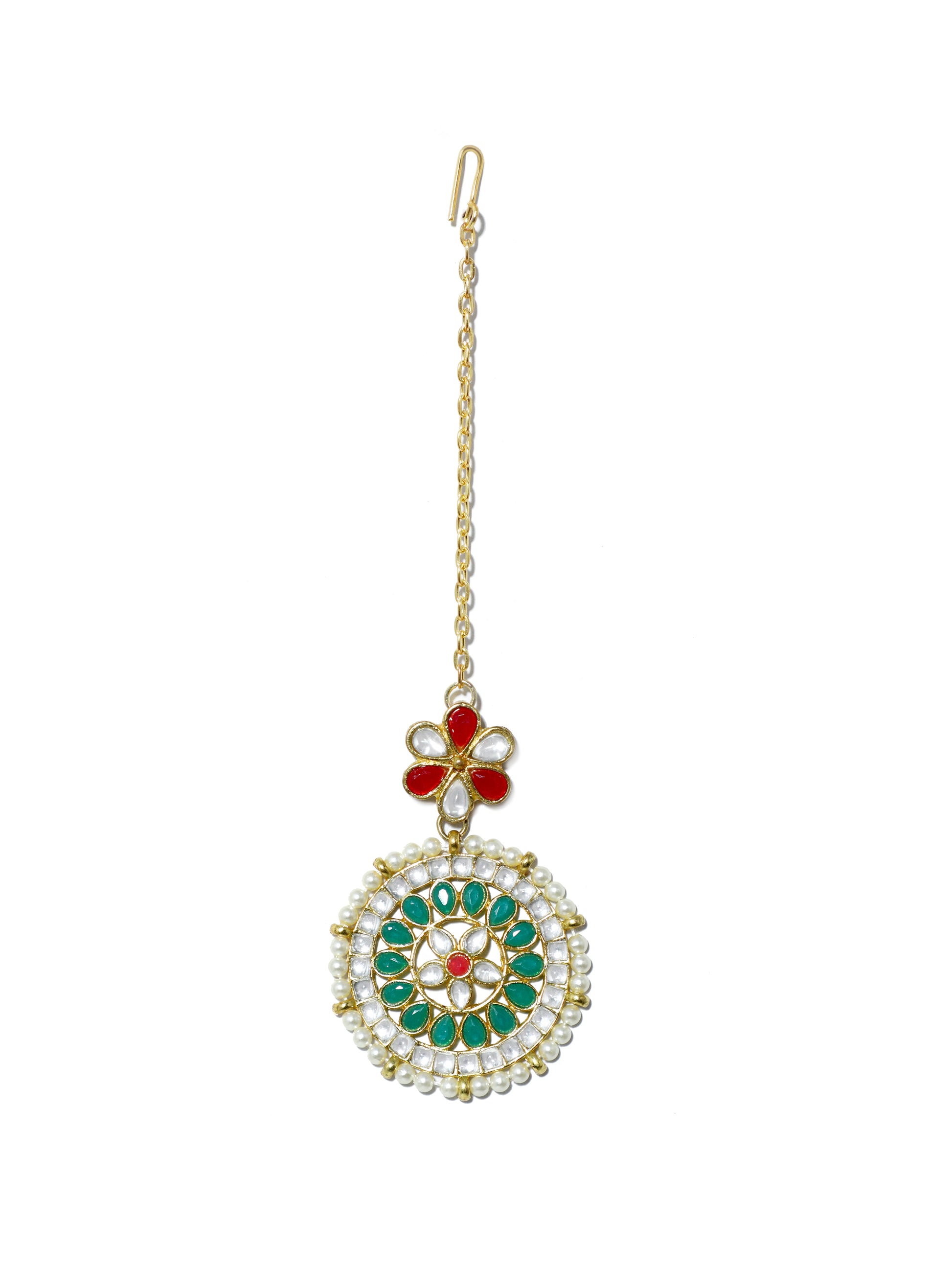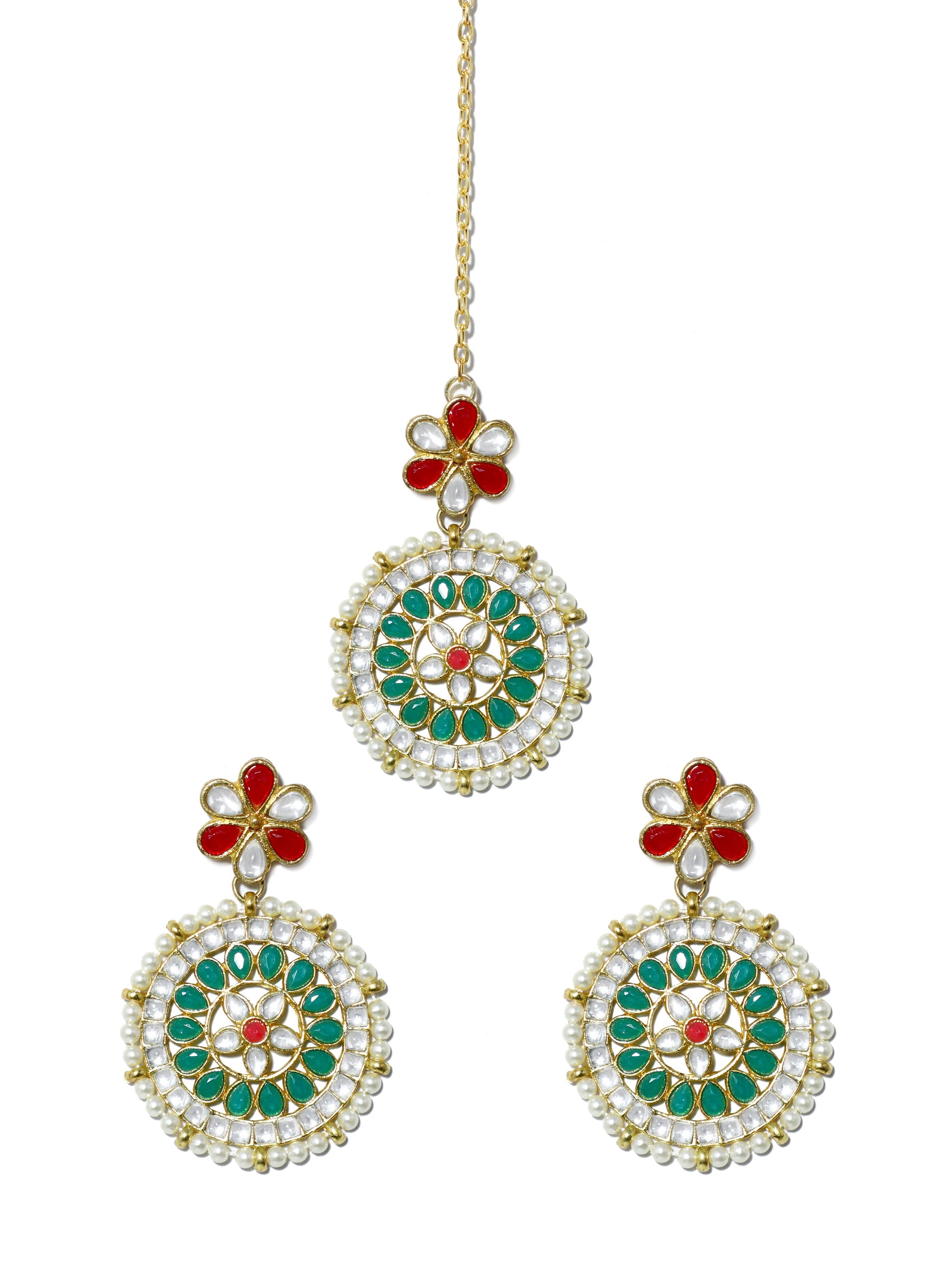 - Gold Plated Green and Pearl Beads Kundan Dangler Earrings with Maangtikka. It's Five Layer Micro Gold Plated and Embellished with Kundan for High Durability. Intricate high polish creates glamorous reflections and adds a luxurious look. Perfect for Weddings, Festivals, Traditional Occasions. Best when paired with any Indian or Indo Western Attire.