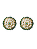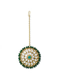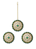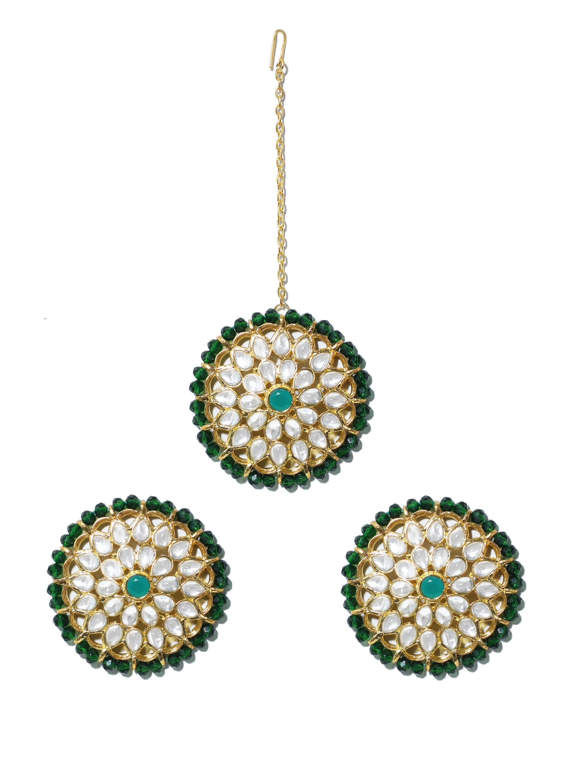Gold Plated Green Beads Kundan Stud Earrings with Maangtikka