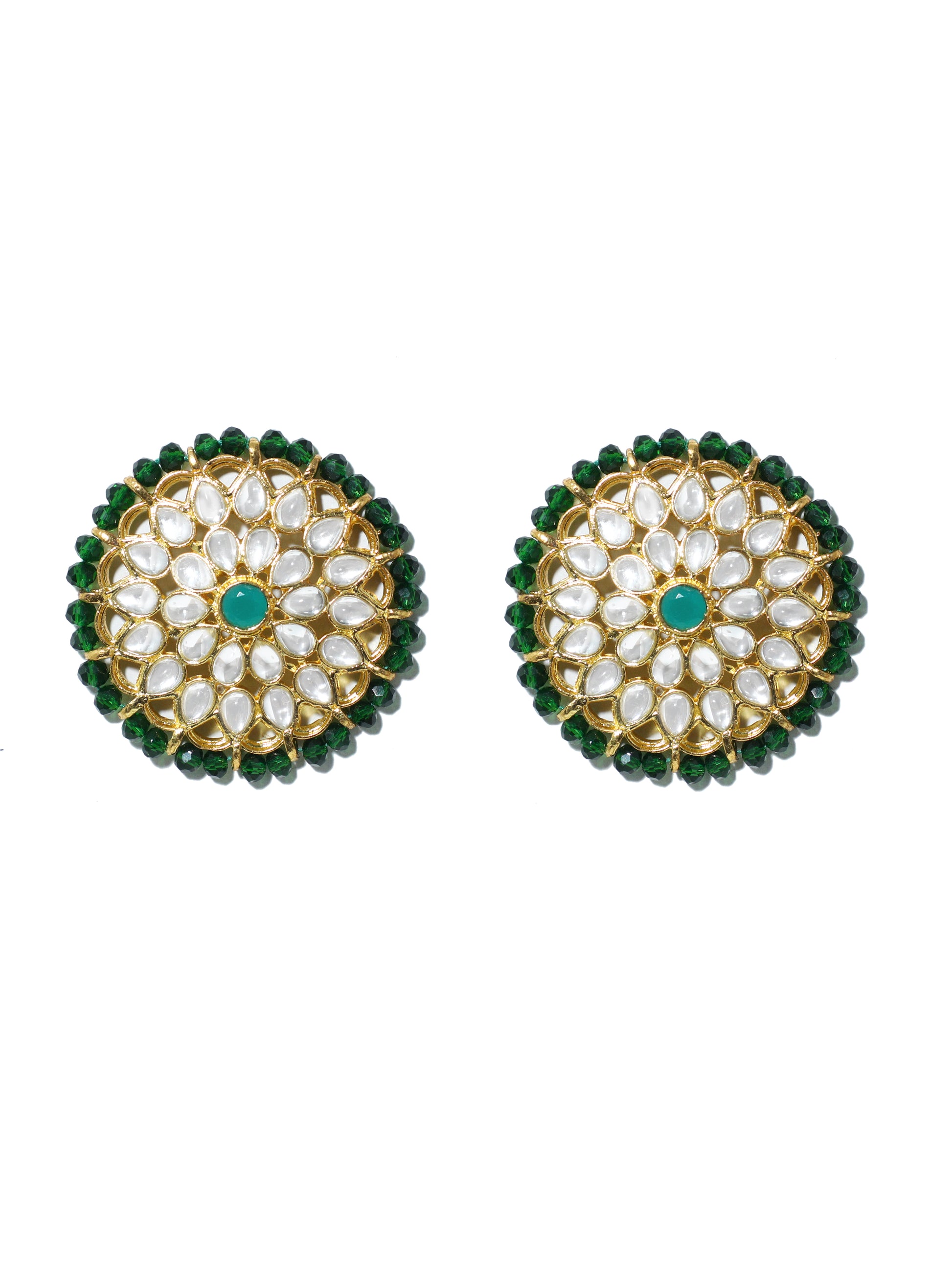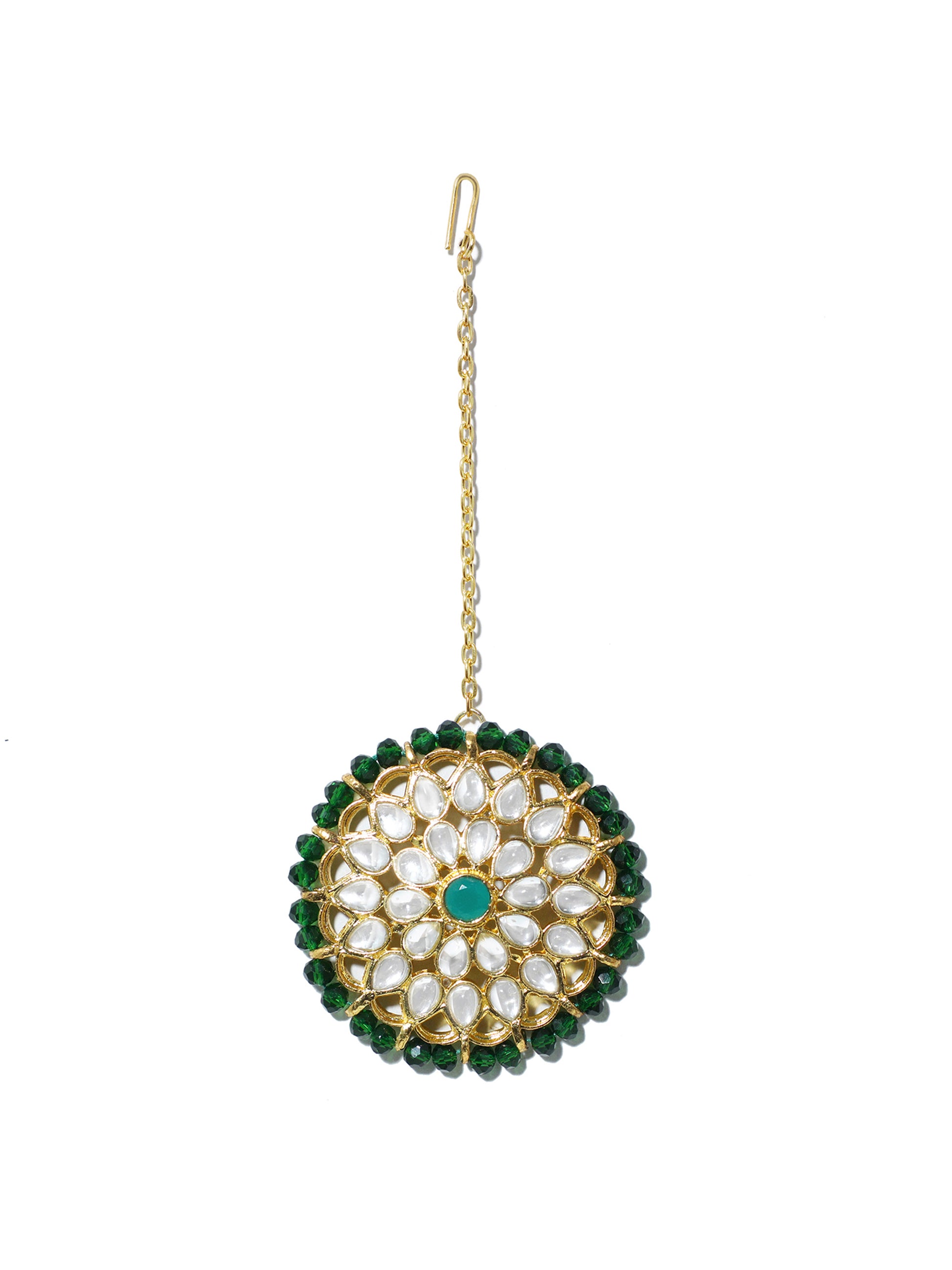 - Gold Plated Green Beads Kundan Stud Earrings with Maangtikka. It's Five Layer Micro Gold Plated and Embellished with Kundan for High Durability. Intricate high polish creates glamorous reflections and adds a luxurious look. Perfect for Weddings, Festivals, Traditional Occasions. Best when paired with any Indian or Indo Western Attire.