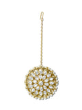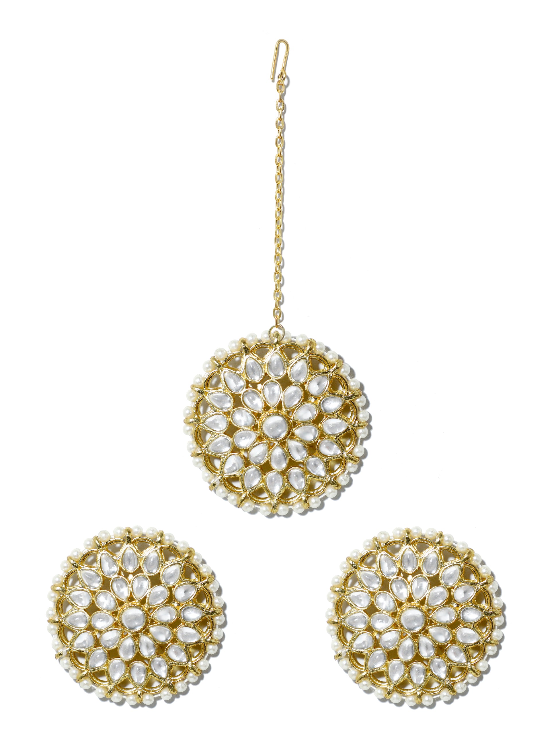 Gold Plated Pearl Beads Kundan Stud Earrings with Maangtikka