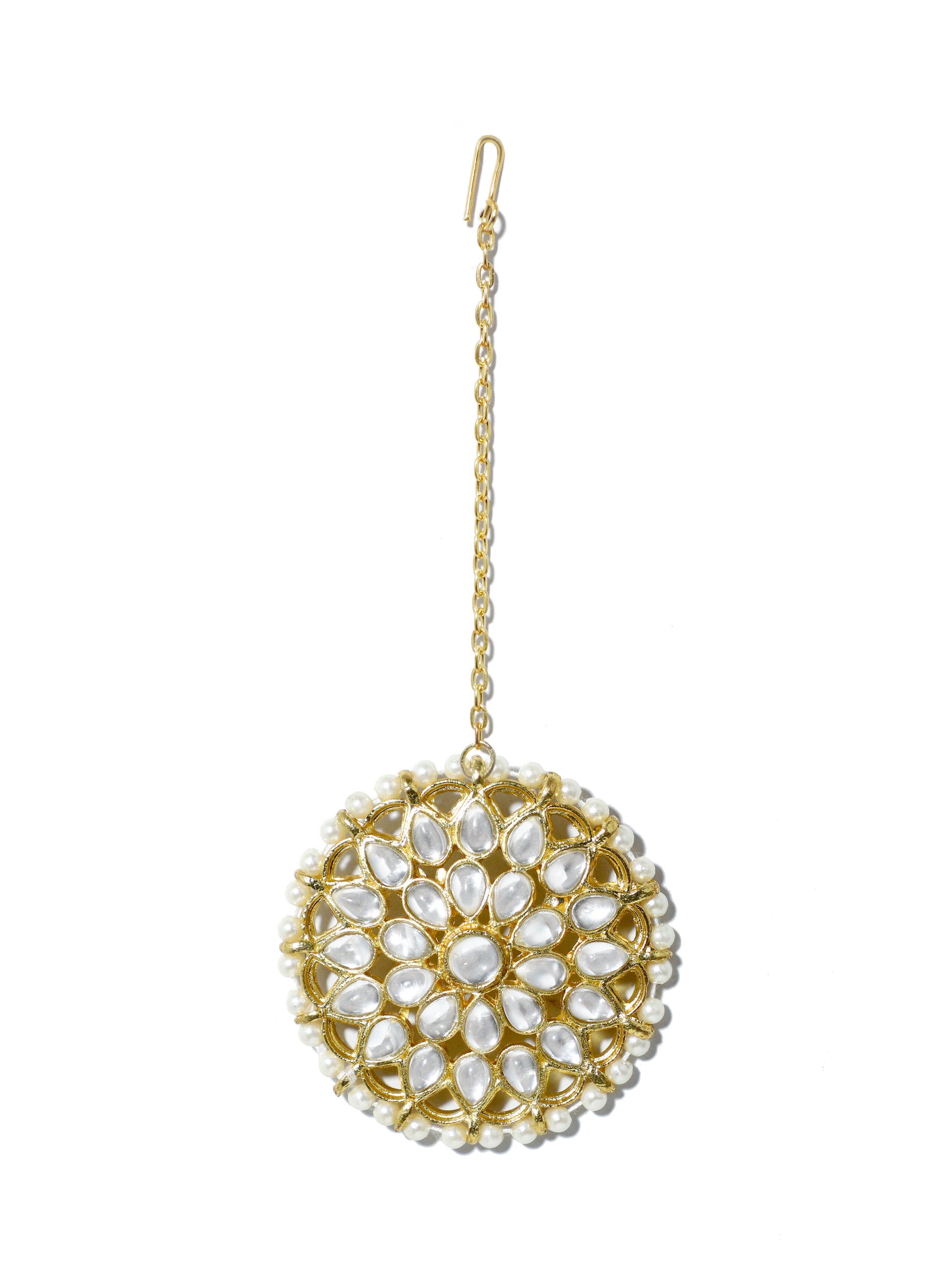 - Gold Plated Pearl Beads Kundan Stud Earrings with Maangtikka. It's Five Layer Micro Gold Plated and Embellished with Kundan for High Durability. Intricate high polish creates glamorous reflections and adds a luxurious look. Perfect for Weddings, Festivals, Traditional Occasions. Best when paired with any Indian or Indo Western Attire.