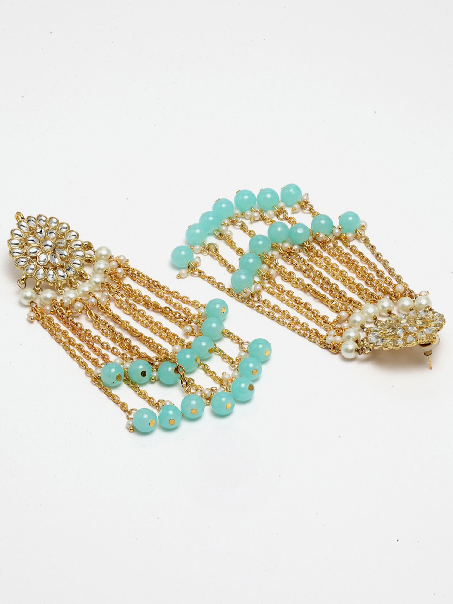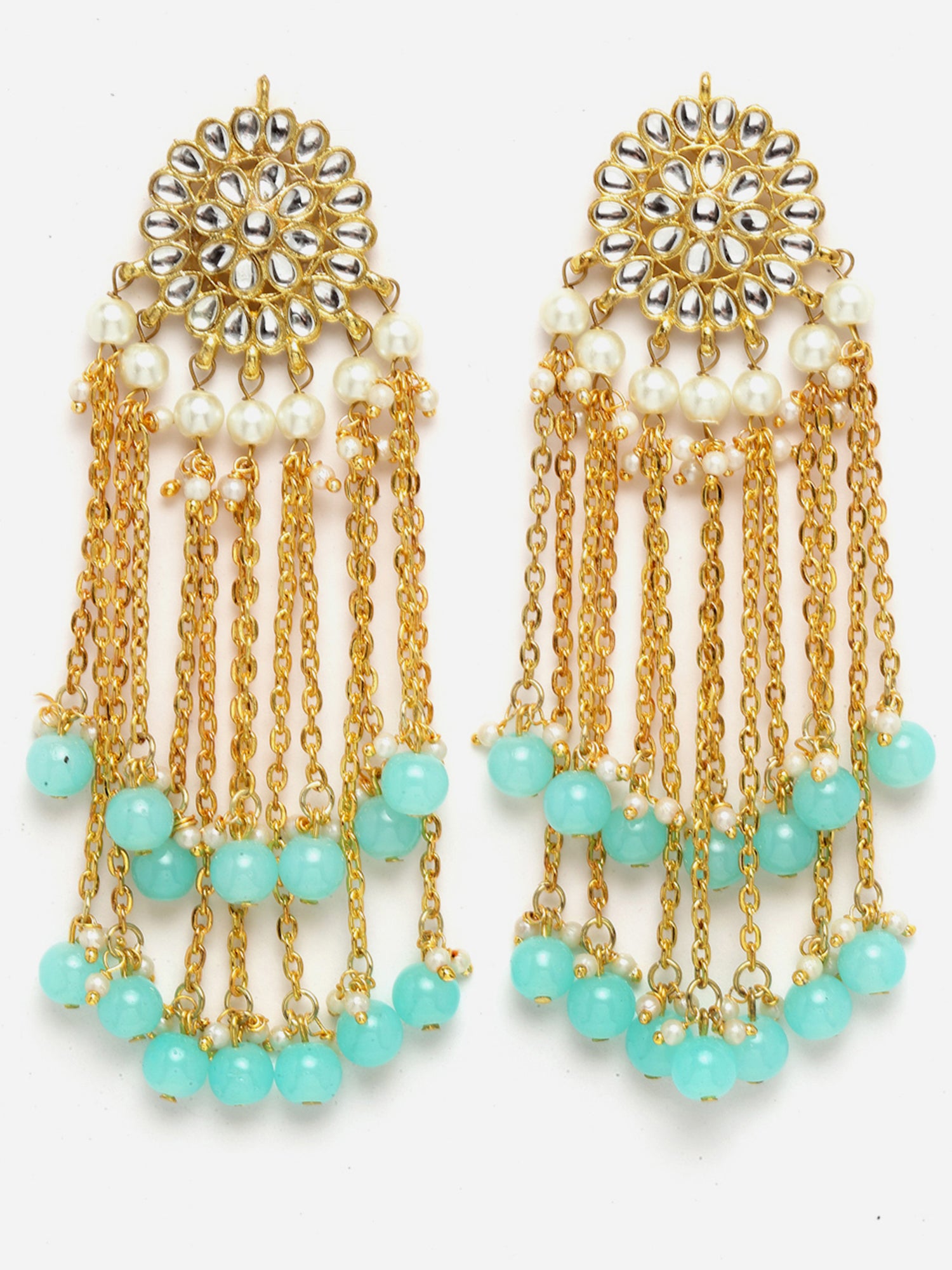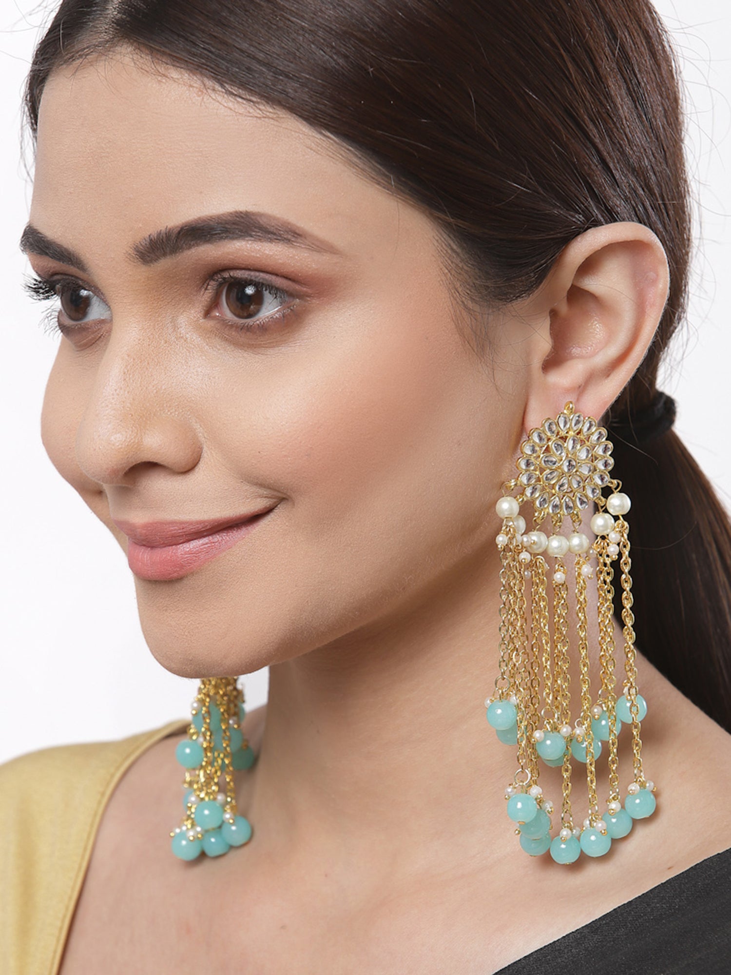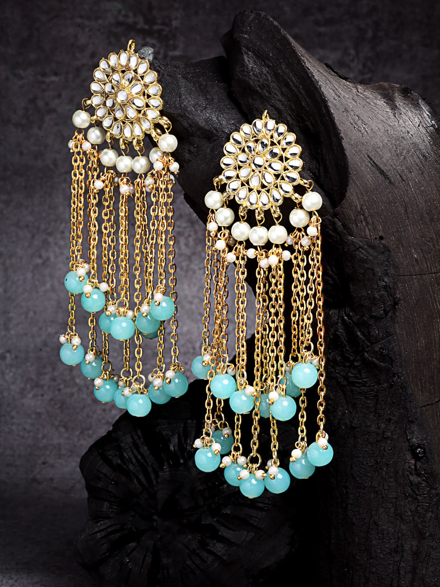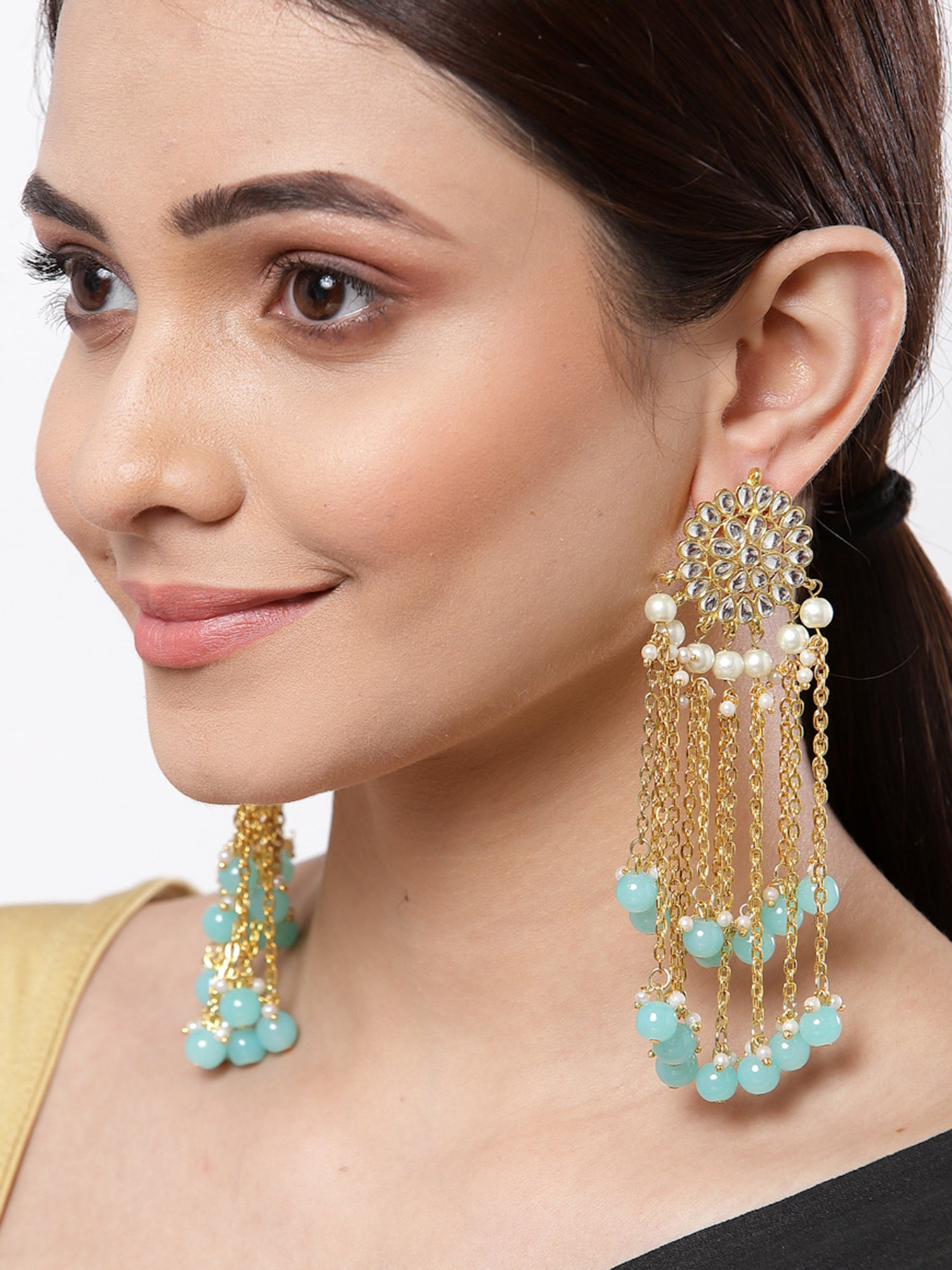 - Gold Plated Light Blue Kundan Tassel Earrings. It's Five Layer Micro Gold Plated and Embellished with Elegant Kundan for High Durability. Intricate high polish creates glamorous reflections and adds a luxurious look. Perfect for Weddings, Festivals, Traditional Occasions. Best when paired with any Indian outfit.