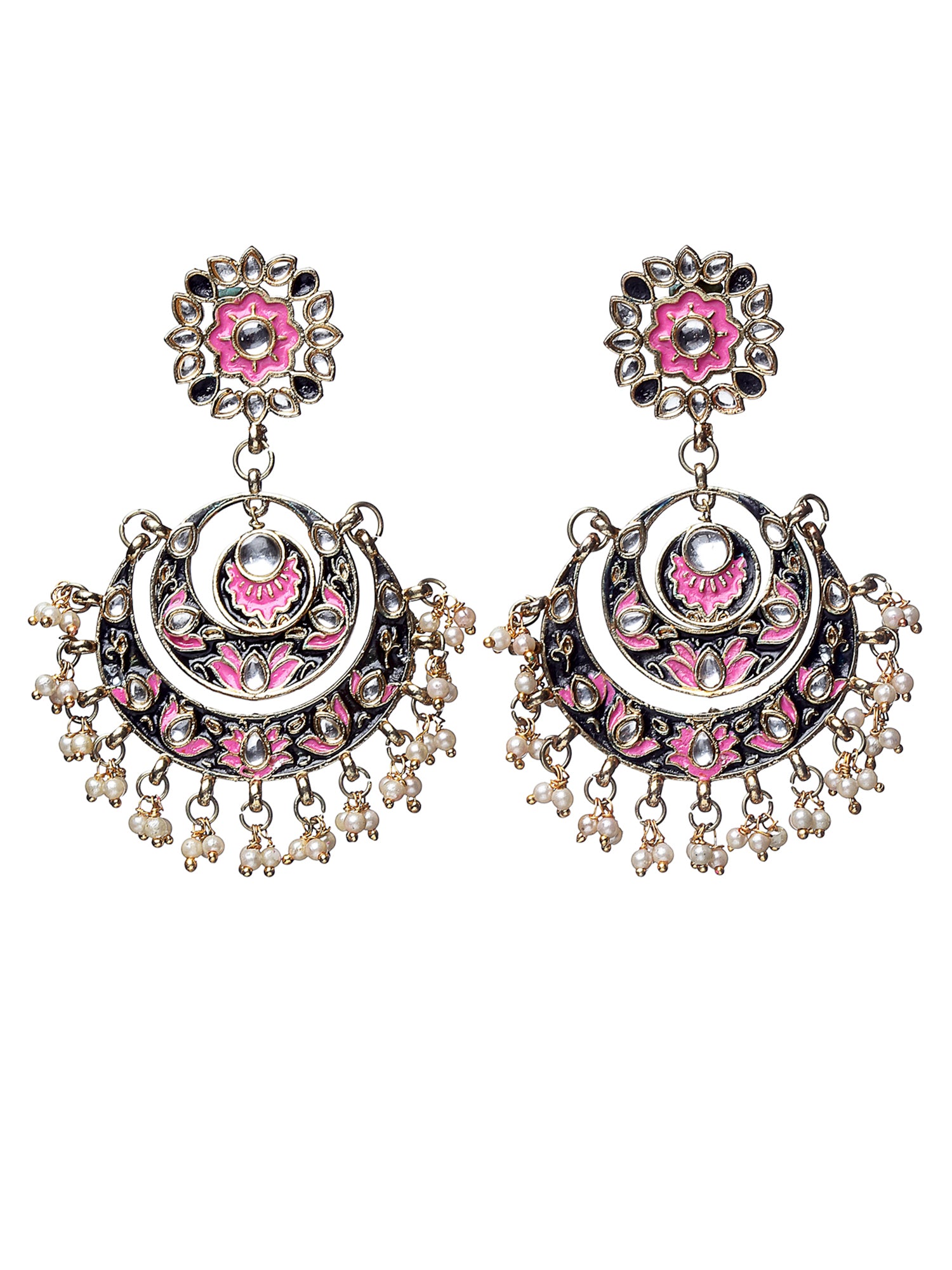 - Karatcart Pink Meena Kundan Studded Chandbali Earrings for Women. It's Five Layer Micro Gold Plated and Embellished with Elegant Kundan for High Durability. Intricate high polish creates glamorous reflections and adds a luxurious look. Perfect for Weddings, Festivals, Traditional Occasions. Best when paired with any Indian outfit.