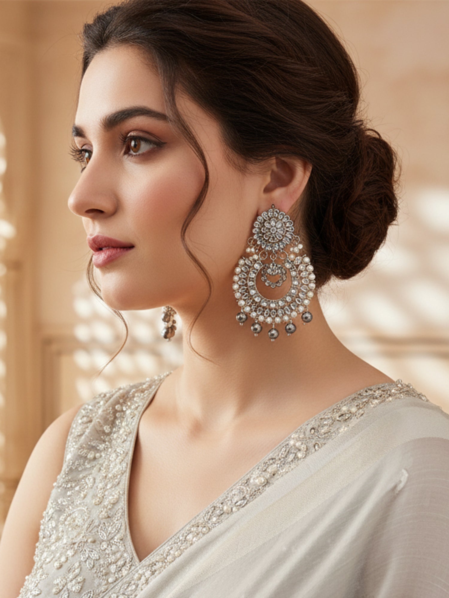- Karatcart Grey Pearl Oxidised Silver Kundan Chandbali Earrings. Made of High-Quality Metal Alloy as per International Standards which makes it very skin-friendly.