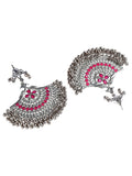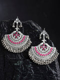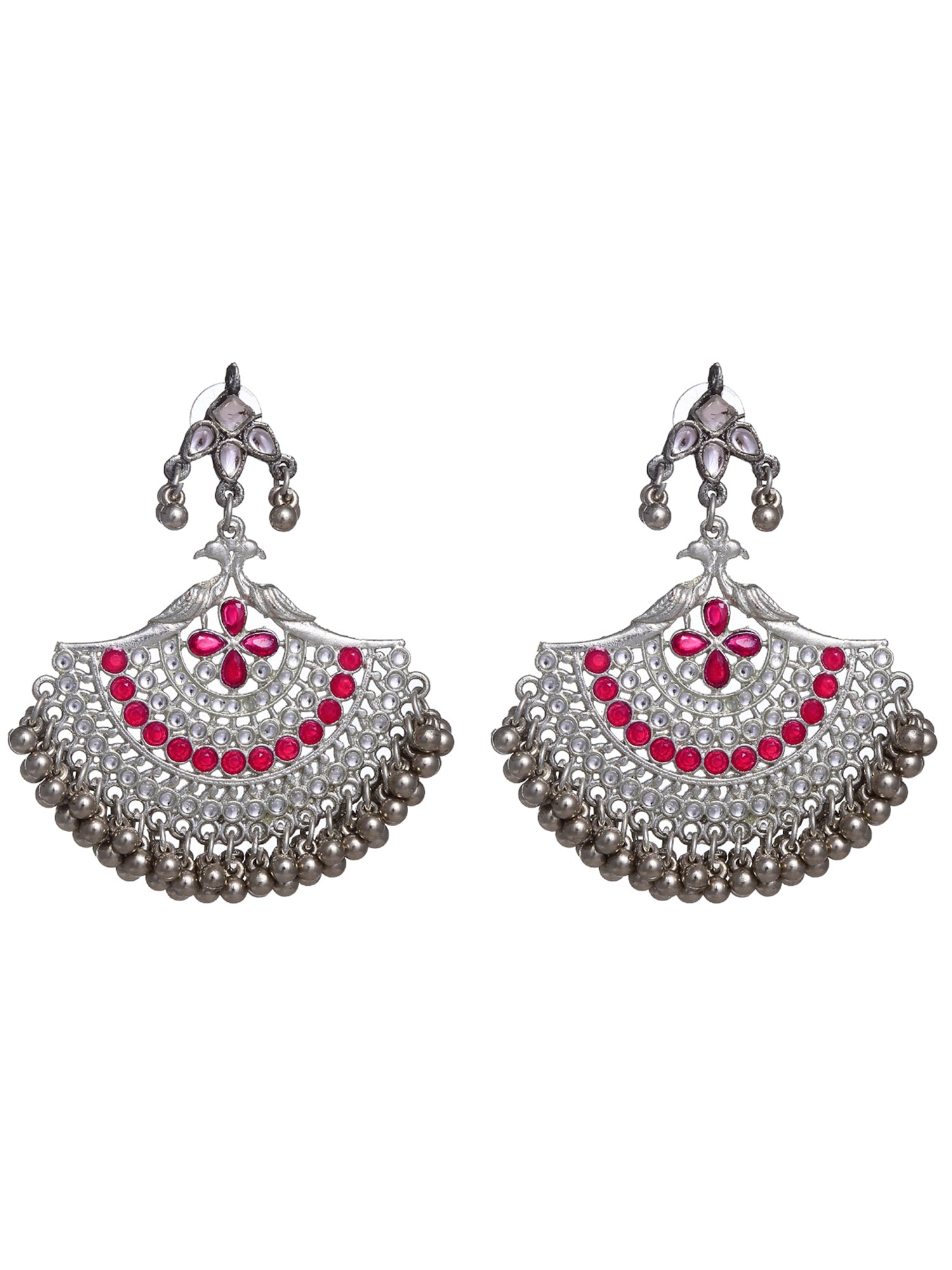 Peacock Shaped Oxidised Silver Ruby Red Kundan Chandbali Earrings