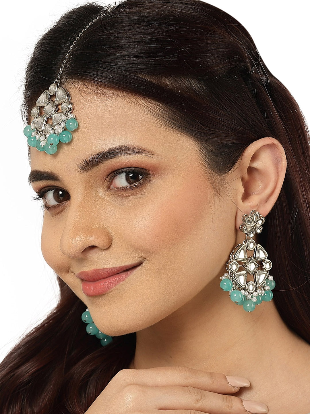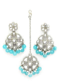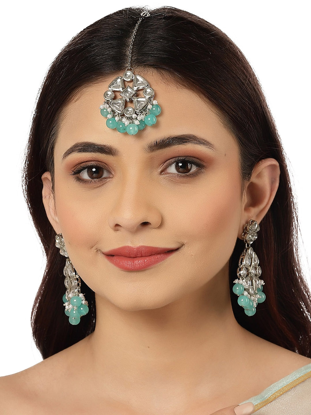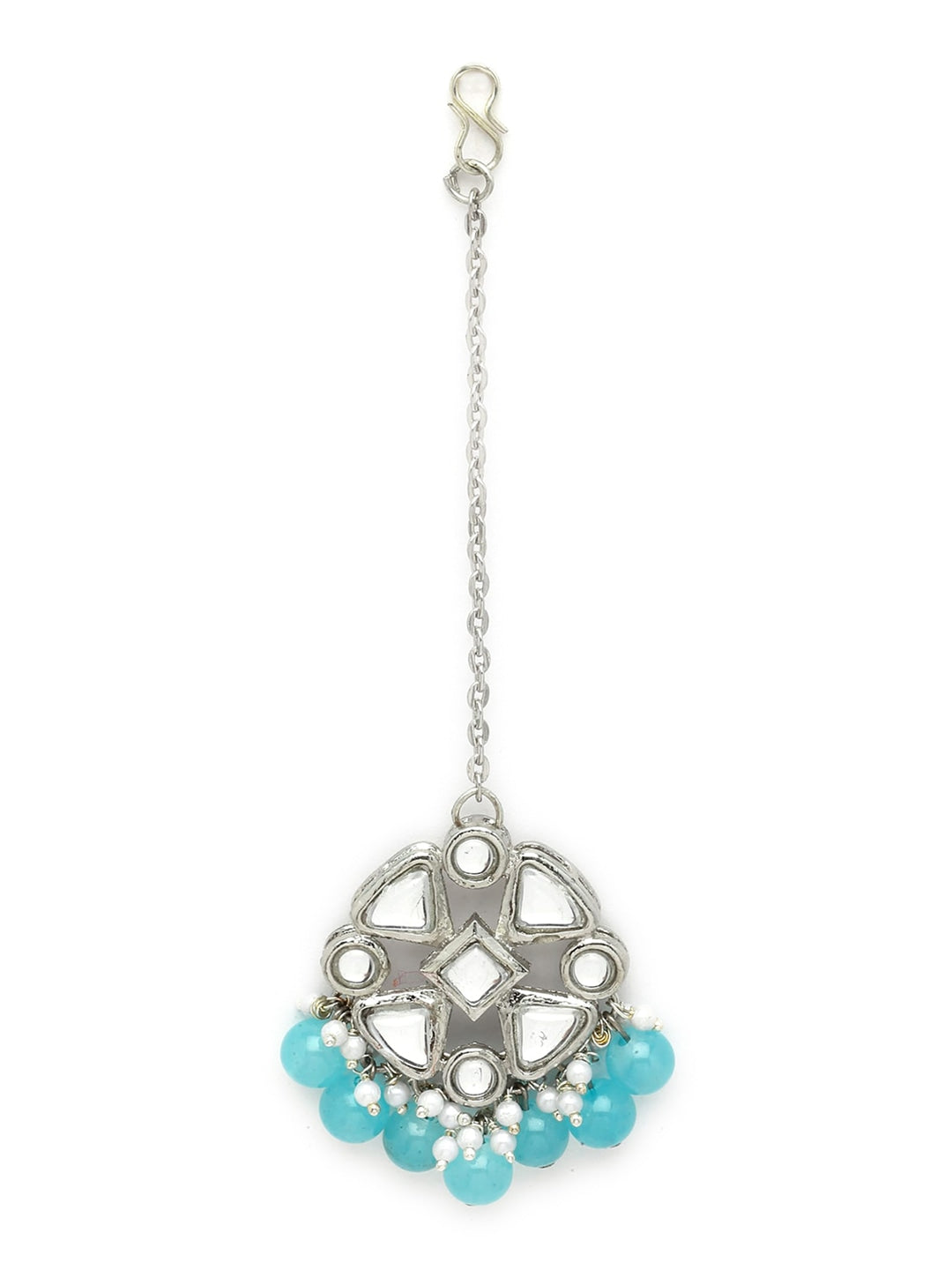 Oxidised silver-plated maang tikka, has an intricately textured centrepiece with Light blue beaded Kundan droplets detail, secured with a S-hook closure