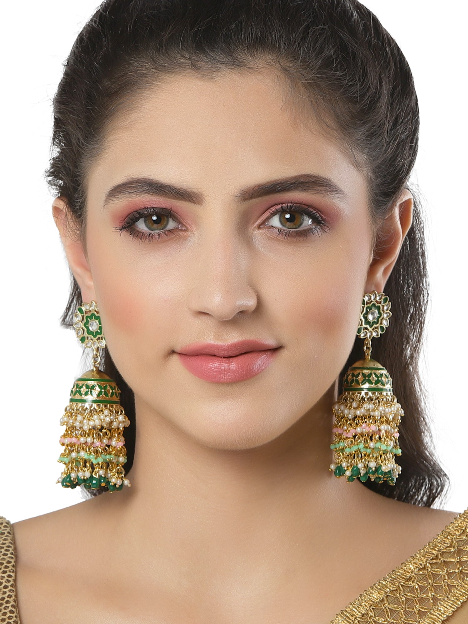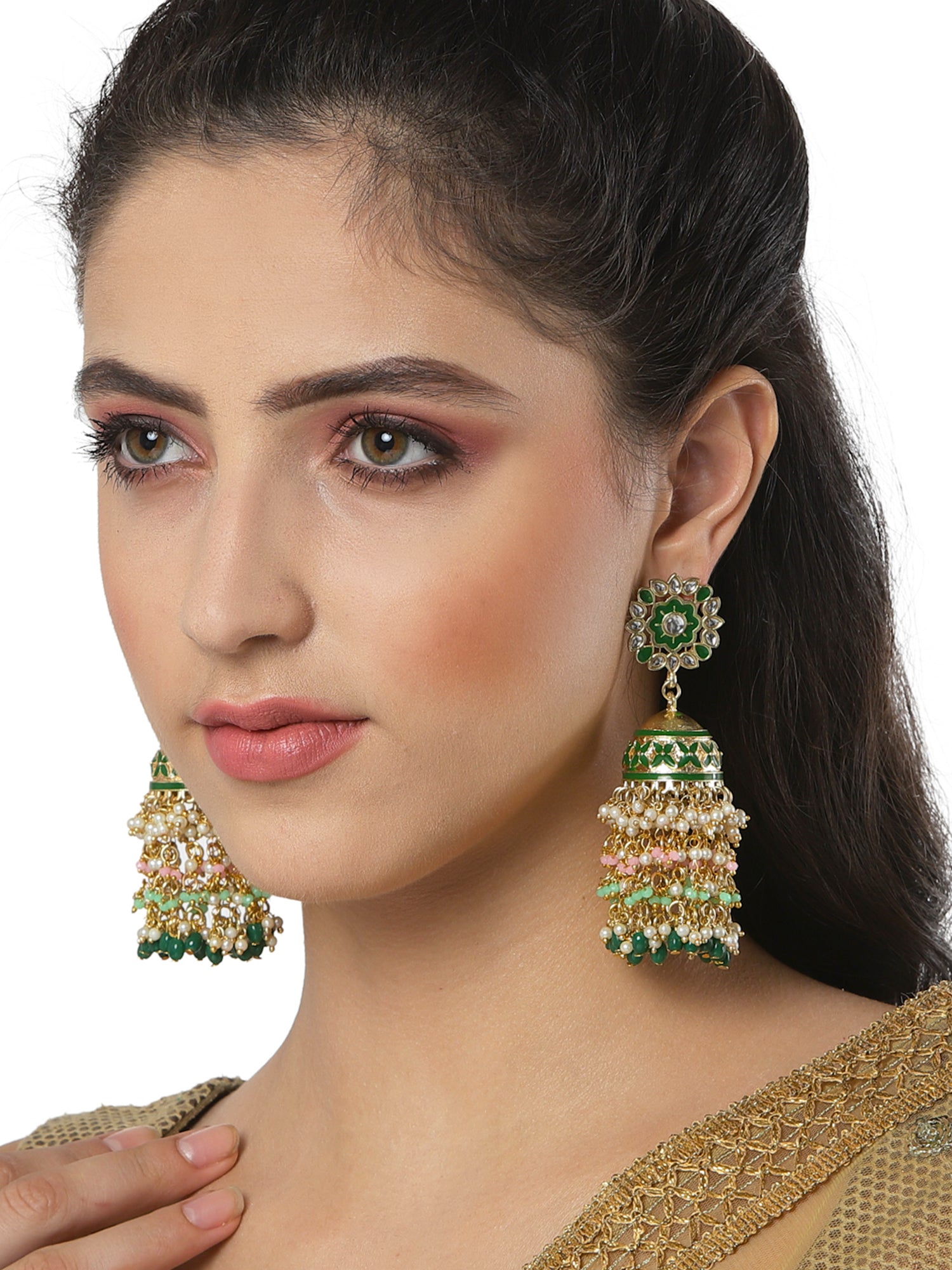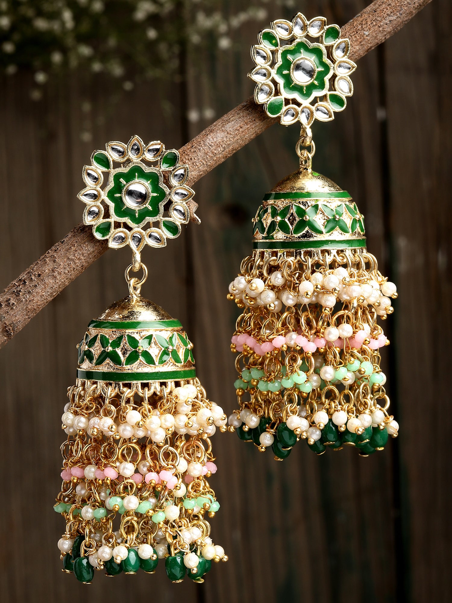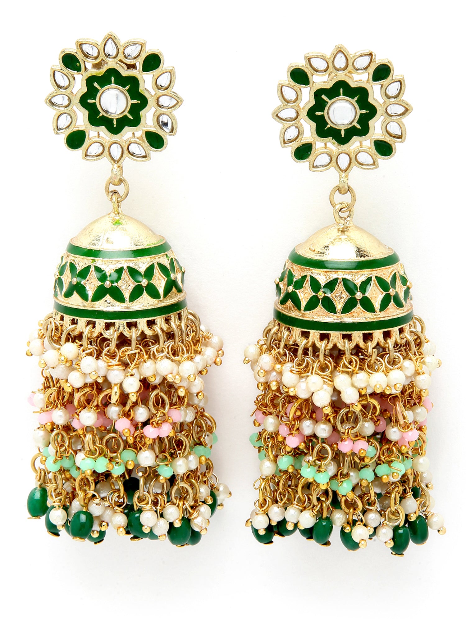 - Green Stone and Multicolor Crystals Jhumki Earrings for Women. It is made with high-quality Kundan Stones which makes them very skin-friendly. Perfect for Weddings, Parties, Festivals, and Traditional Occasions.