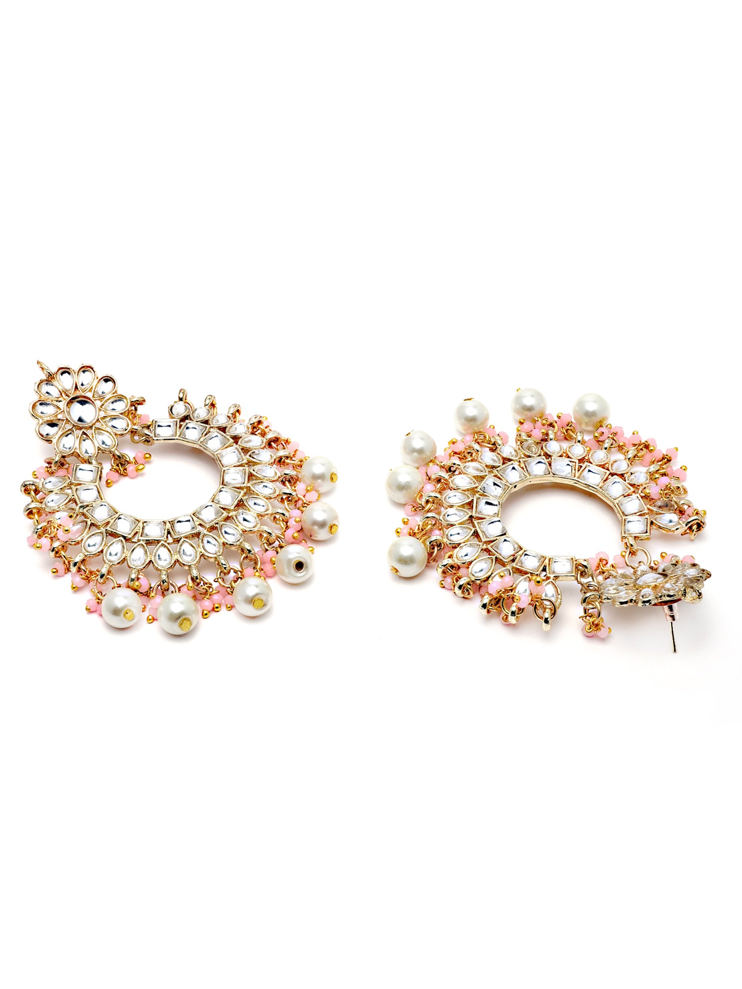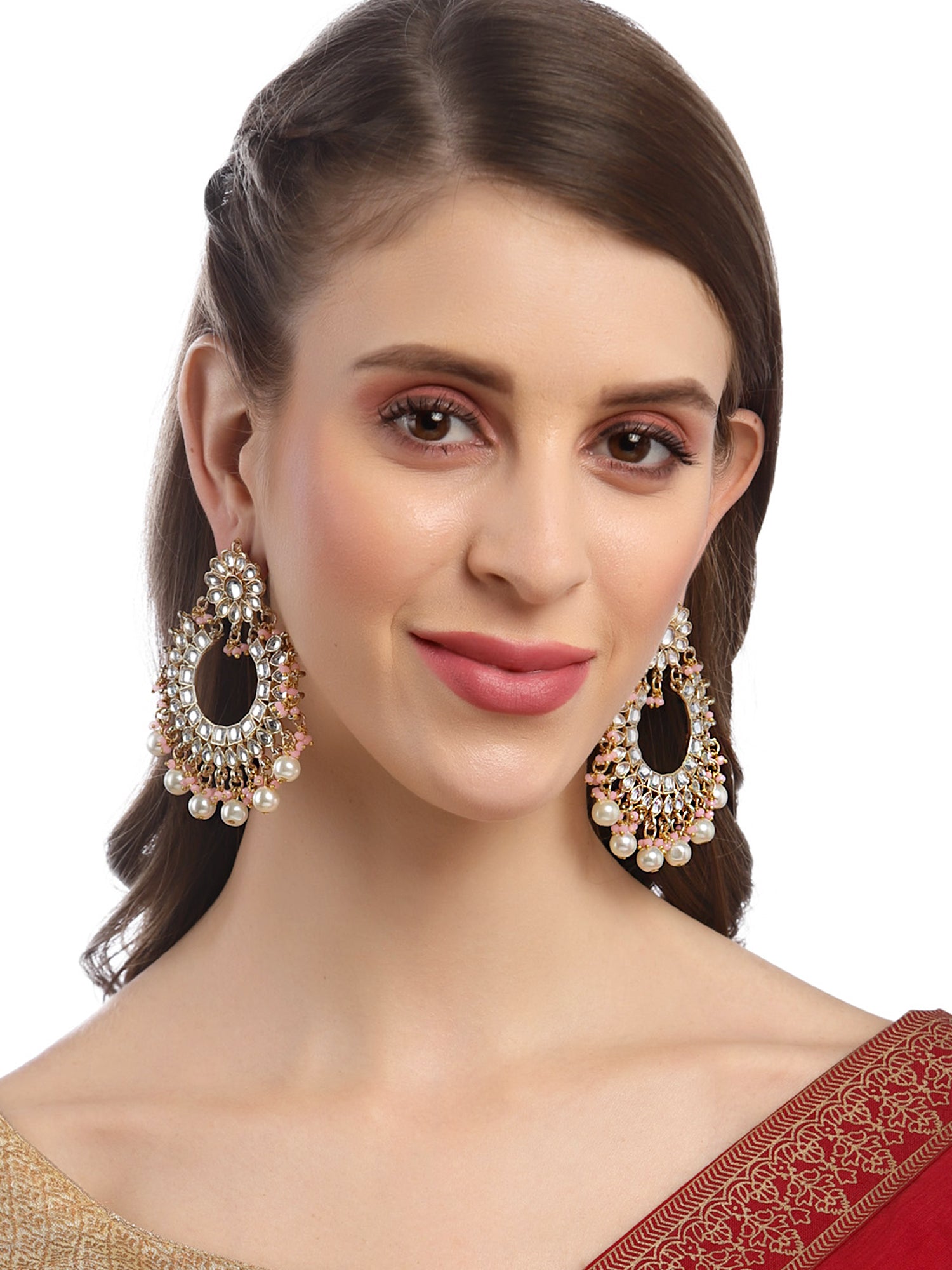- Karatcart Gold Plated Pearl and Pink Crystal Studded Kundan Chandbali Earrings for Women .It is made with high-quality Kundan Stones which makes them very skin-friendly. Perfect for Weddings, Parties, Festivals, and Traditional Occasions. Gracefully pair Saree, Kurti, or any Indo-western outfit to enhance your look. These are made from toxic-free materials which are Anti-Allergic and Safe for the skin.